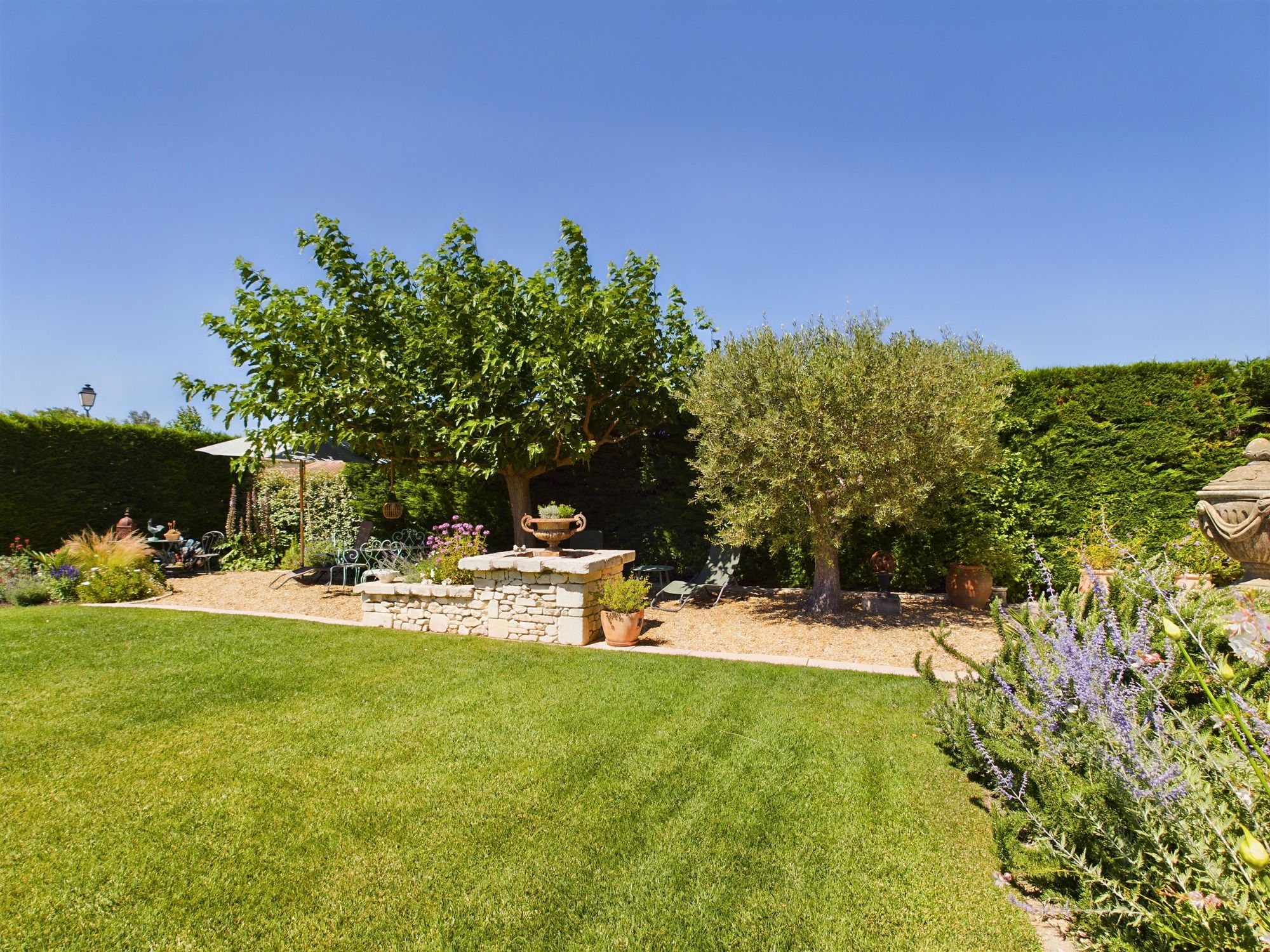 The carefully maintained garden is a veritable haven of greenery. It has a shaded terrace for outdoor dining, as well as areas to relax in peace and quiet.