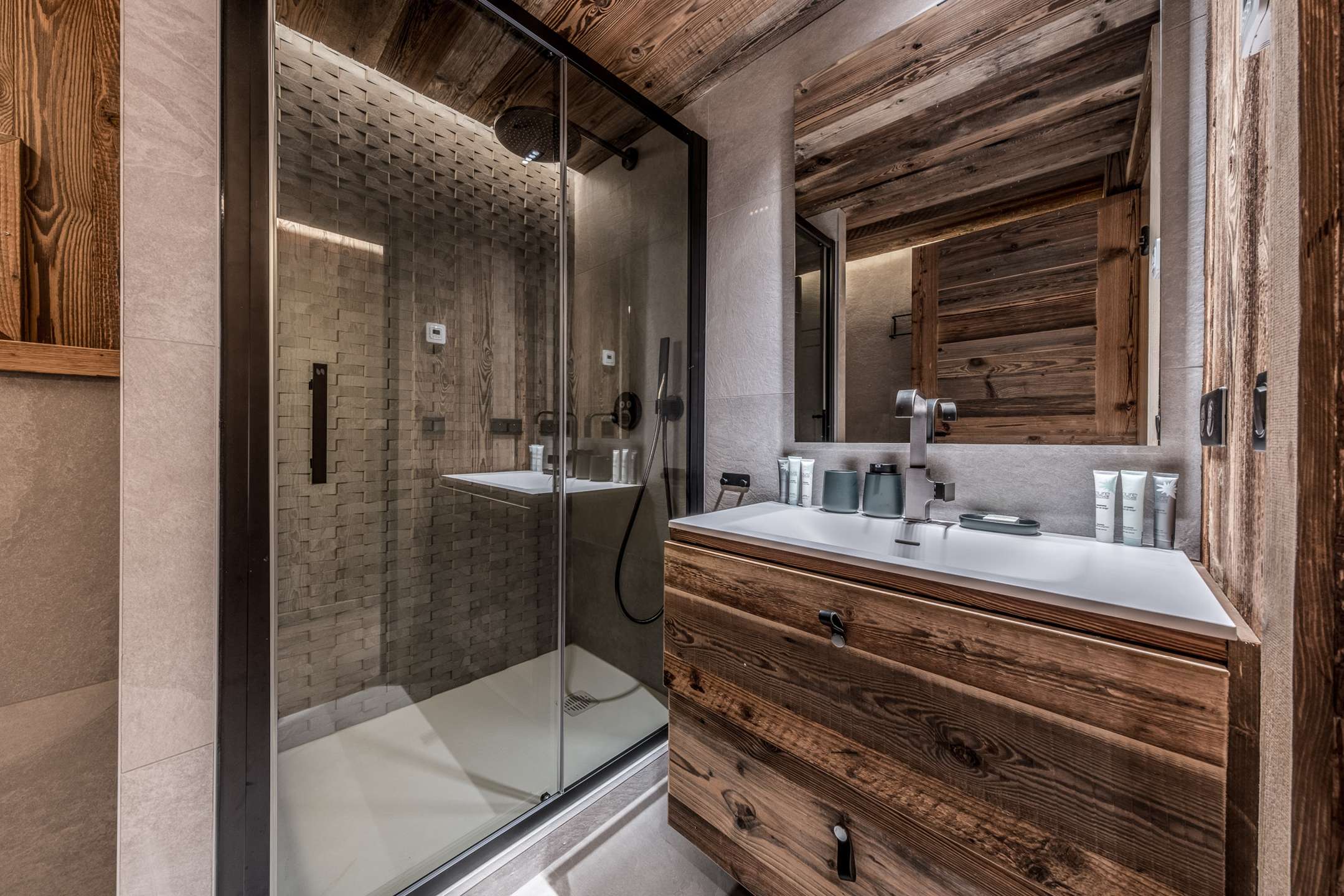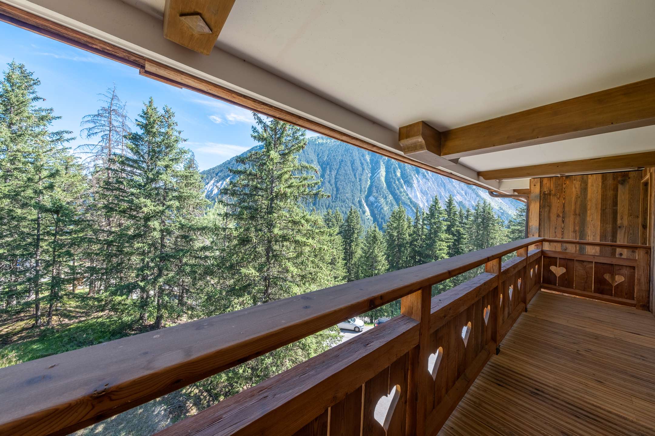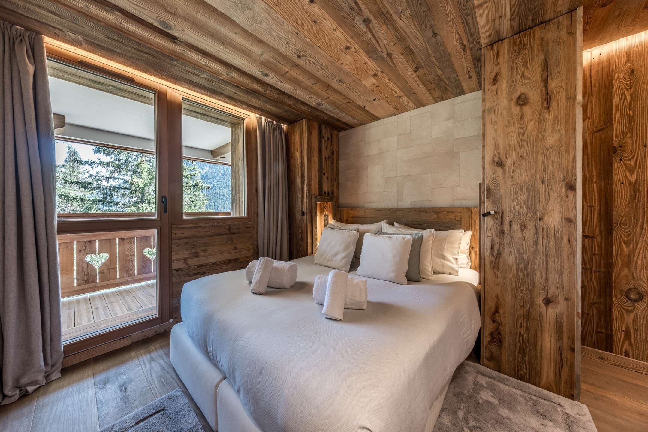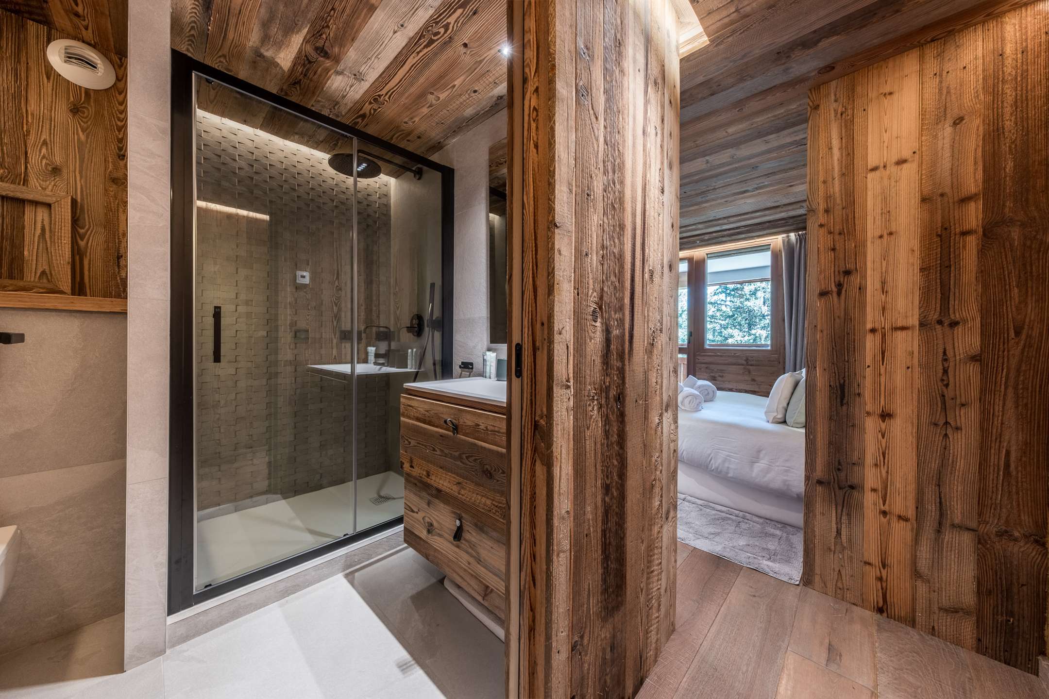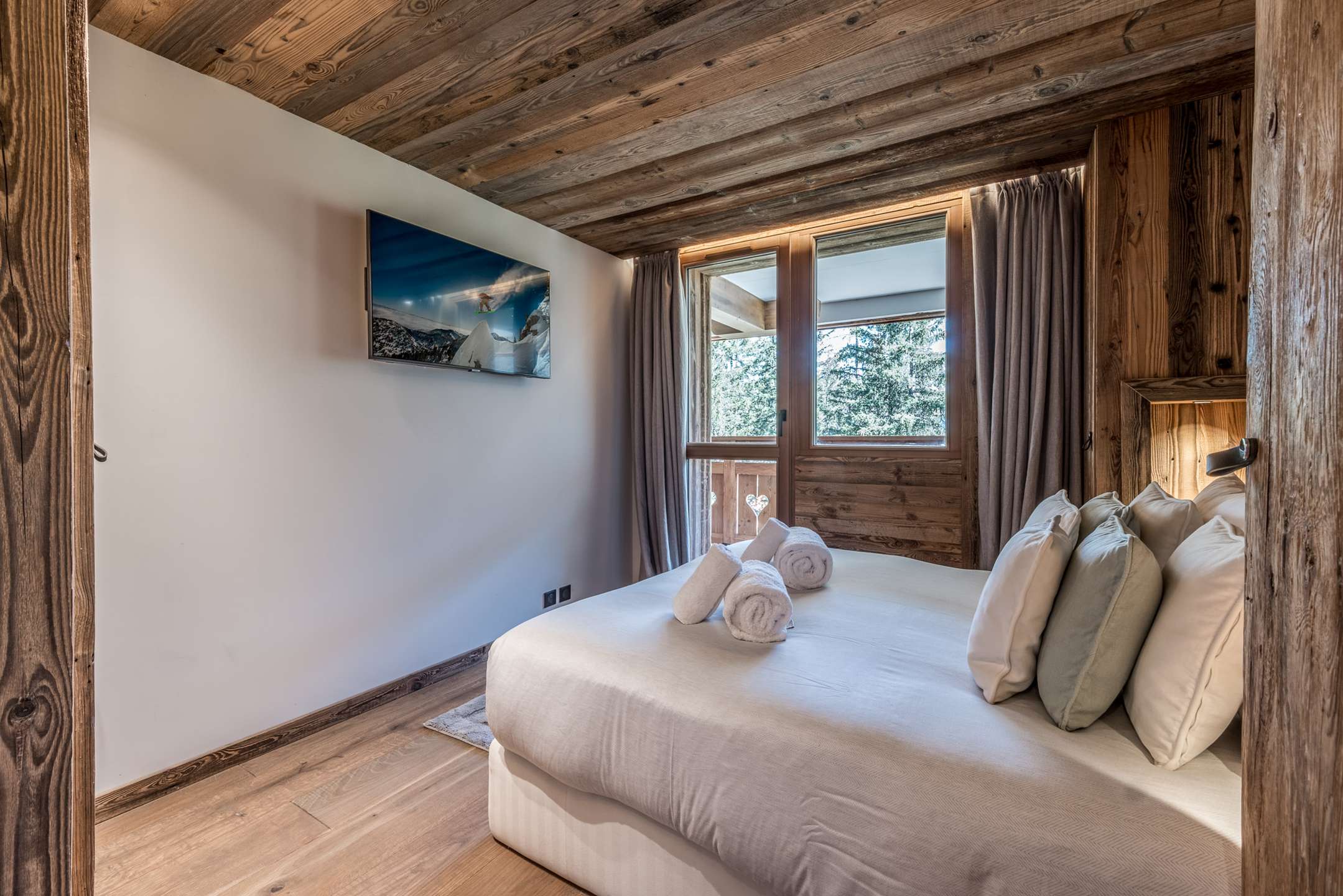 - A double bedroom en suite (150x190 cm bed) with balcony, view of the forest and La Dent du Villard, and a bathroom with Italian shower and toilet