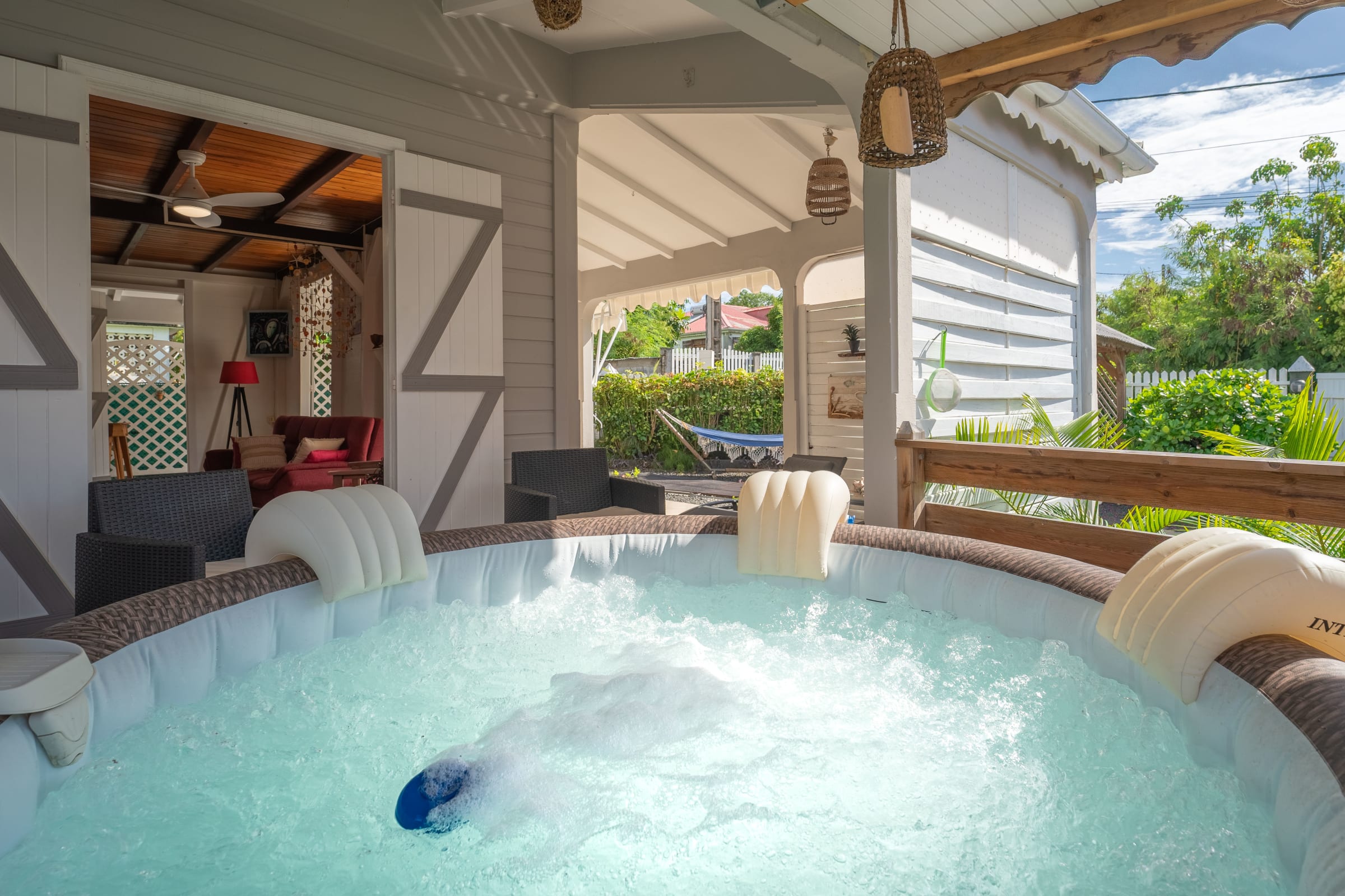 The cosy living room opens onto a small balcony overlooking the exotic-scented garden, where a local fresco invites you to escape. The kitchen is a gourmet's dream, fully equipped to prepare Creole feasts. And here, under the canopy, a Jacuzzi whispers the call to relaxation, promising magical moments.