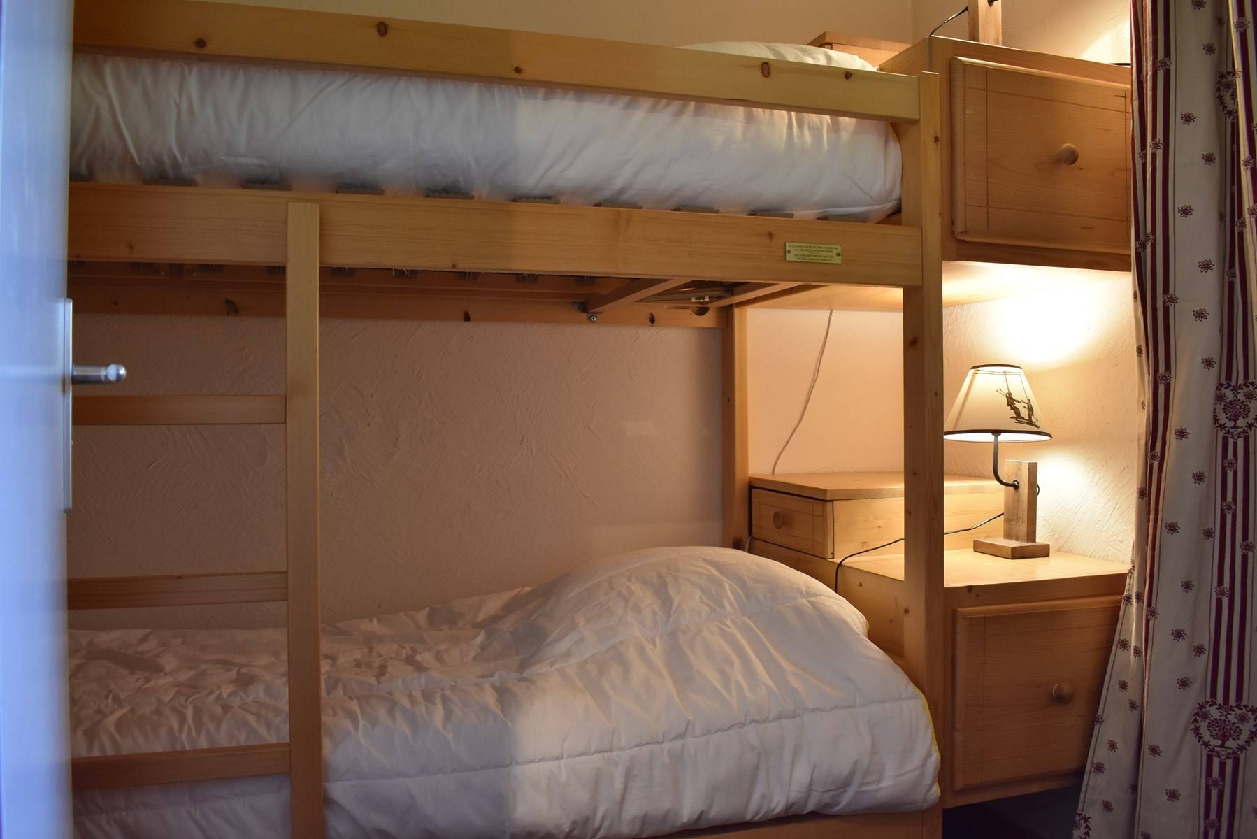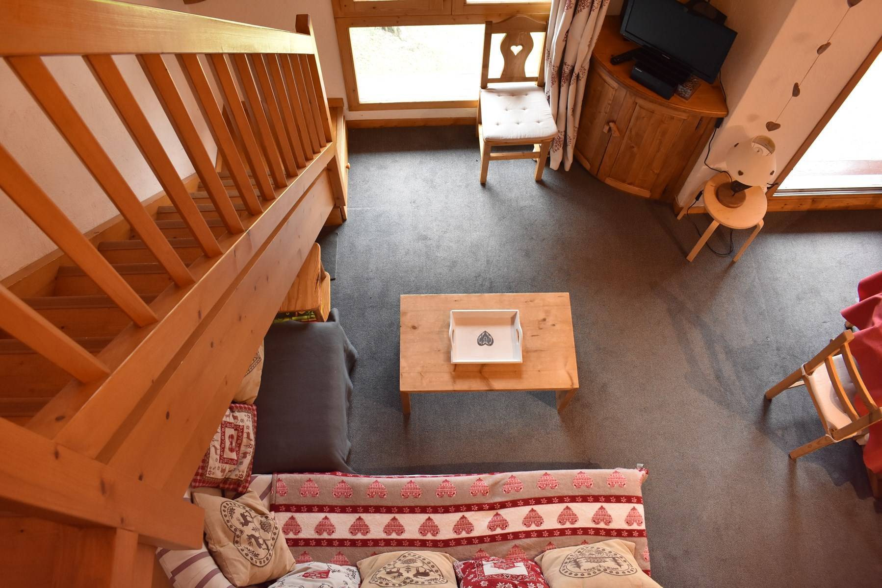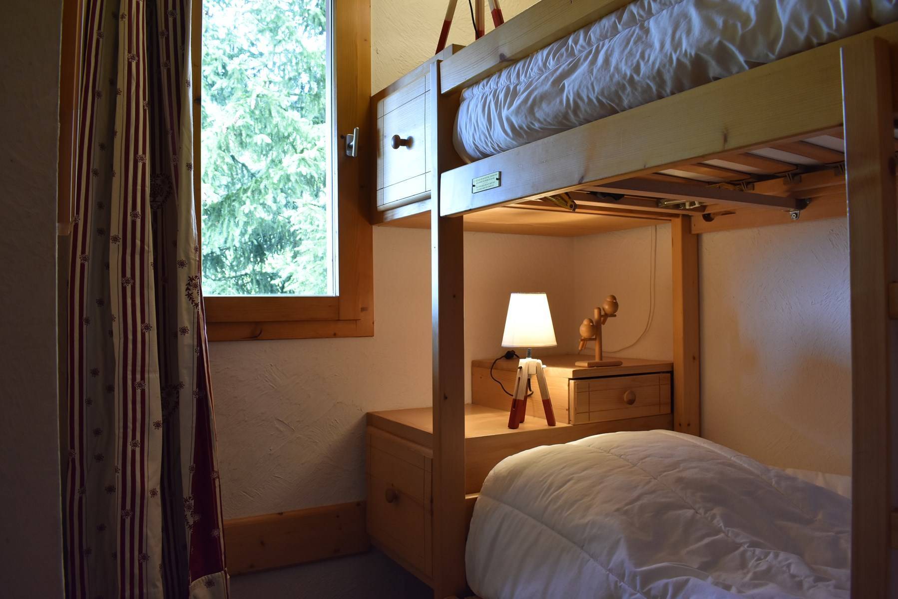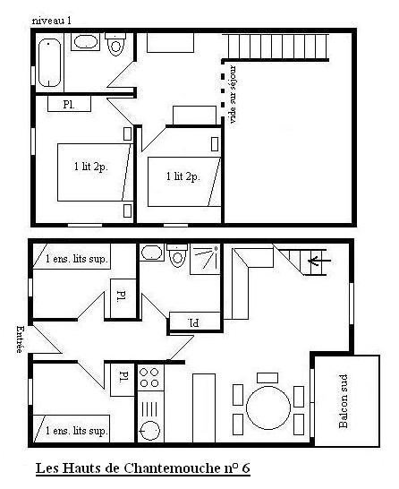 The Hauts de Chantemouche residence is located approximately 130m from the bus stop, 150m from the Morel chairlift slopes and 300m from the shops. This duplex holiday apartment, located on the floor of the residence, consists of an equipped kitchen open to the living room with a dining area (south balcony), a bedroom with 1 set of 2 bunk beds, another bedroom with 1 set 2 bunk beds, 1 bathroom with washer-dryer and toilet. Upstairs, mezzanine level: 1 bedroom with 1 double bed (140), another bedroom with 1 double bed (160), 1 bathroom with a toilet. This rental is equipped with a television with integrated DVD. You benefit from a ski locker at the entrance to the residence and a covered parking space.