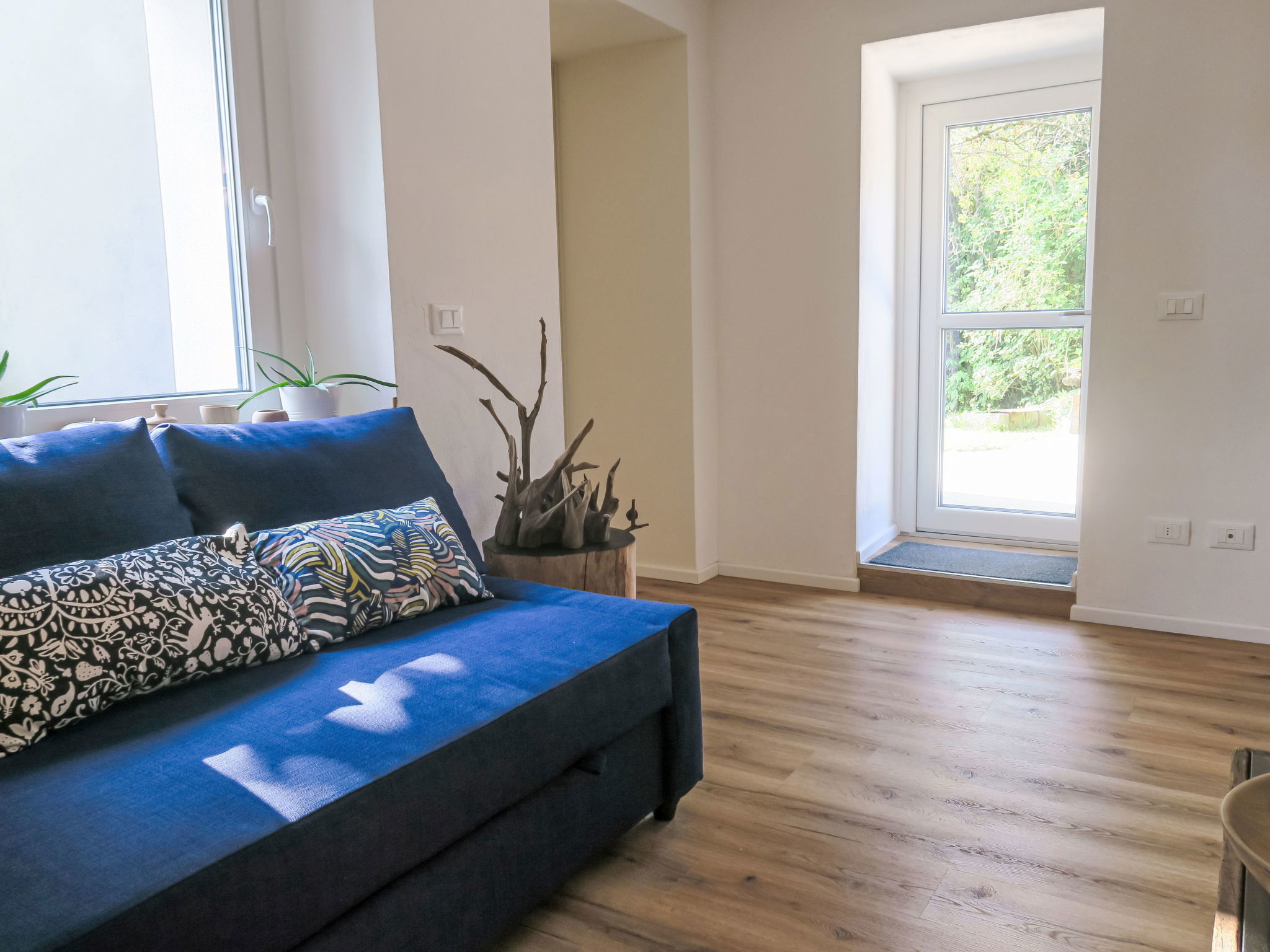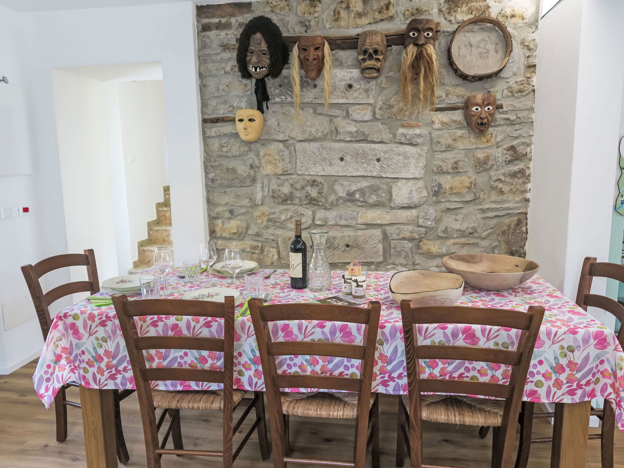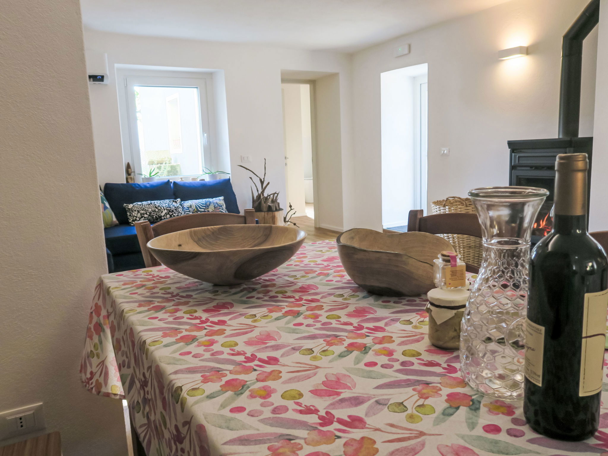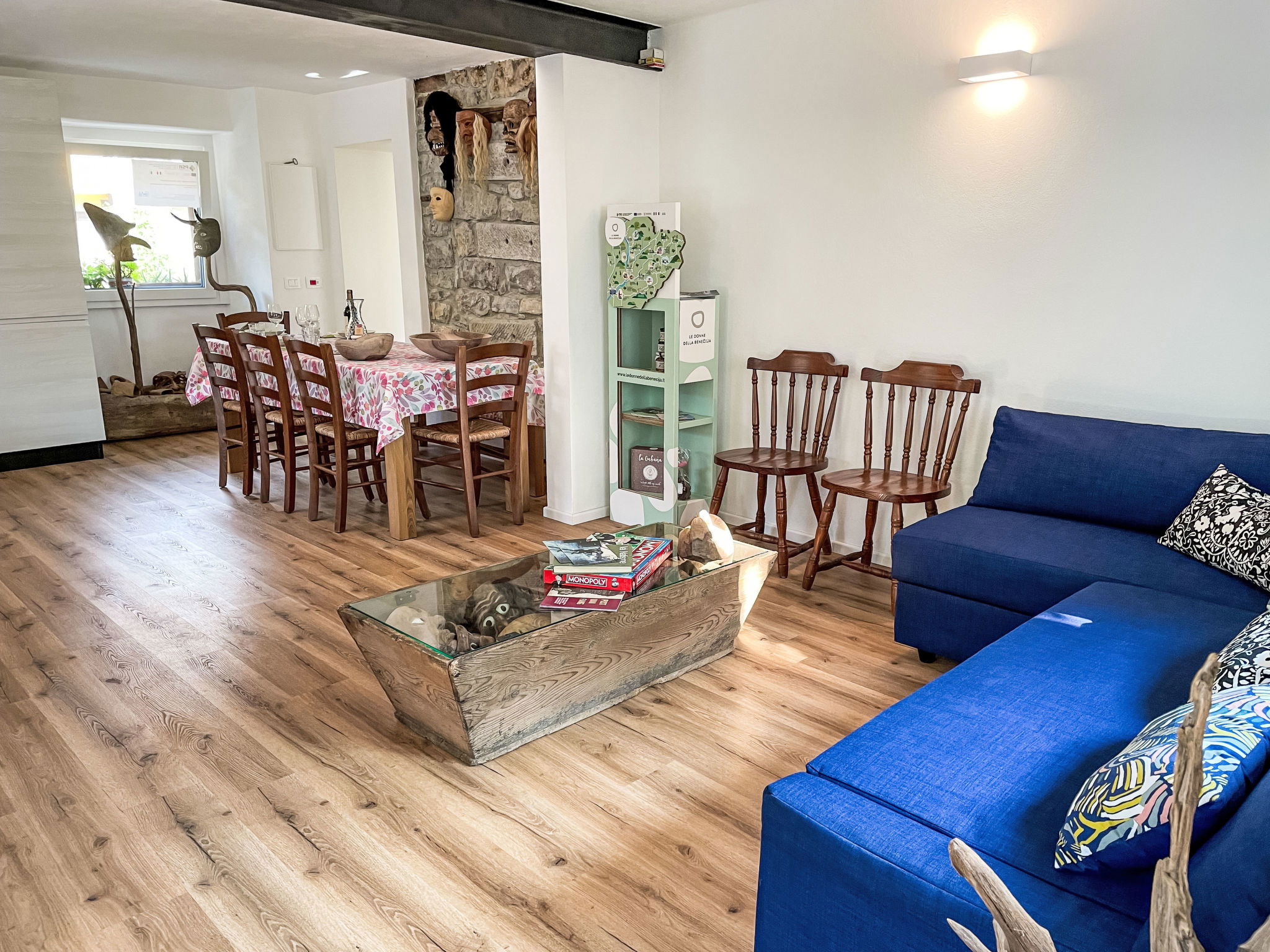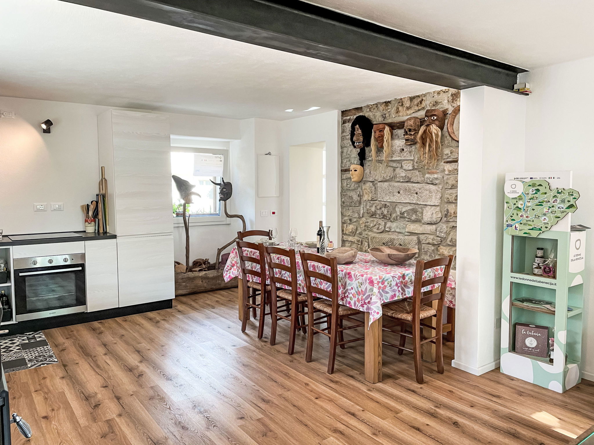 Pulfero: Single-family house "delle Maschere", 2 storeys, renovated in 2023. In the district of Rodda/Clavora 10 km from the centre of San Pietro al Natisone, 16 km from the centre of Cividale, 32 km from the centre of Udine, in a quiet position, 70 km from the sea, 5 km from the river. Private: property, terraced garden (not fenced) with trees, meadow. Garden furniture, fireplace. In the house: sauna. Motor access (4.5 km mountain road). Parking (for 3 cars) at the house. Grocery 10 km, supermarket 16 km, bar 5 km, bus stop 4.5 km, sandy beach "Grado" 70 km, shingle beach "Fiume Natisone" 5 km. Nearby attractions: Kobarid-Soca Valley 21 km. There are 3 e-bikes for free available for our guests. The owner is a passionate woodcarver and has decorated the house with his handmade masks.