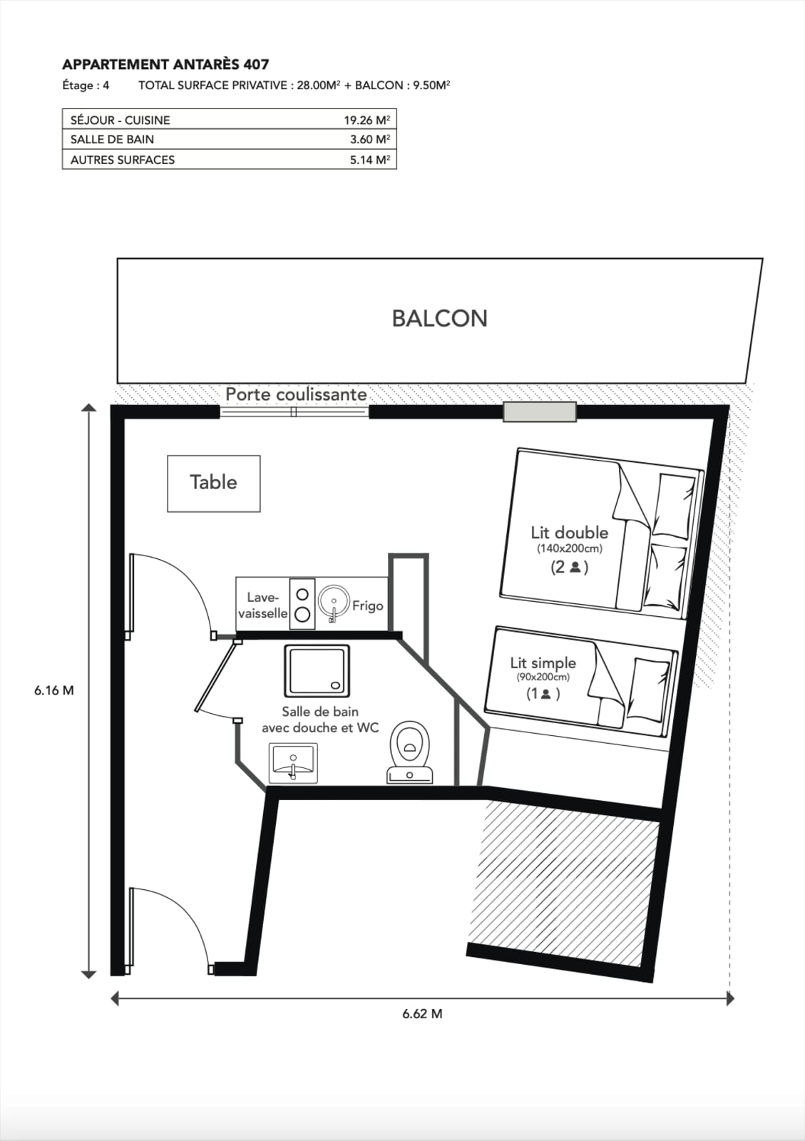 The studio, located on the 4th floor of residence Antarès, is laid out as follows :