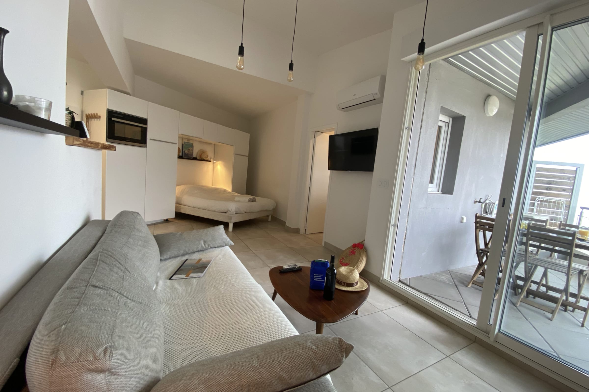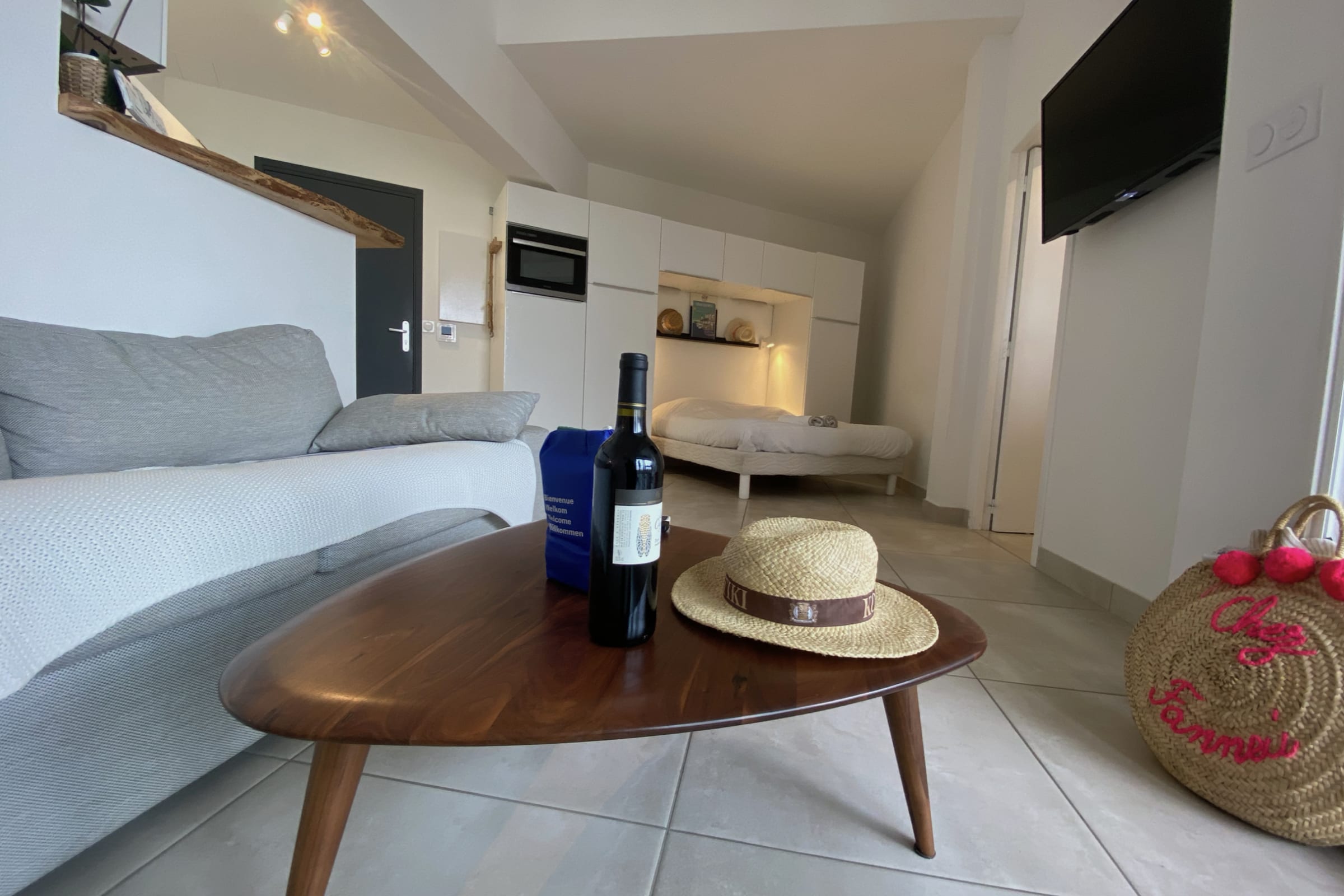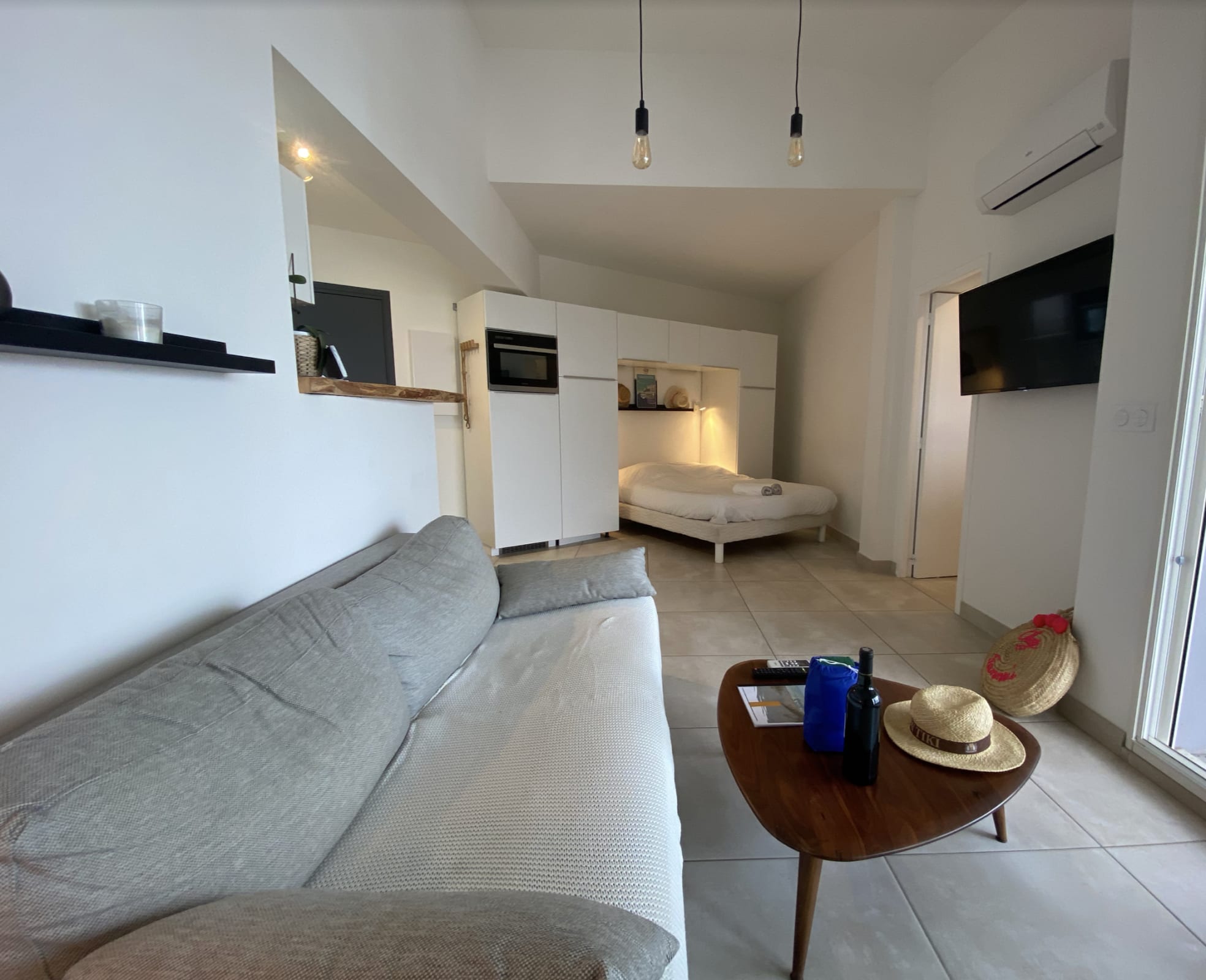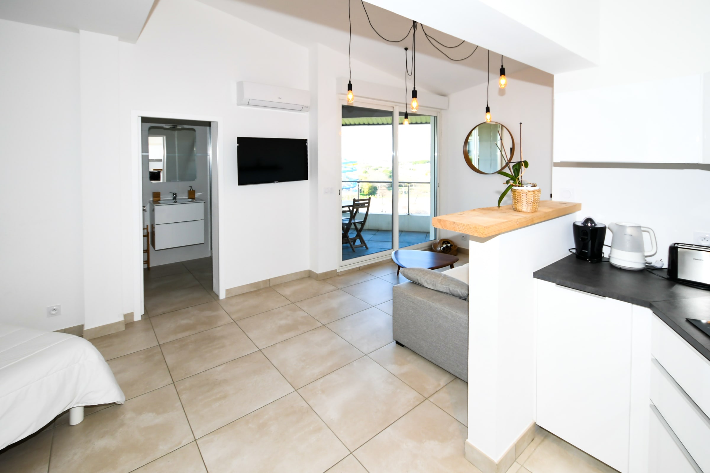 This comfortable studio is located on the 4th and top floor of a modern seafront residence with elevator – Château Leenhardt – offering direct beach access through the garden. Right in the heart of the village, in a quiet and sought-after area, everything is within walking distance: shops, markets (town center and Boucanet), restaurants, tapas bars, cinema…