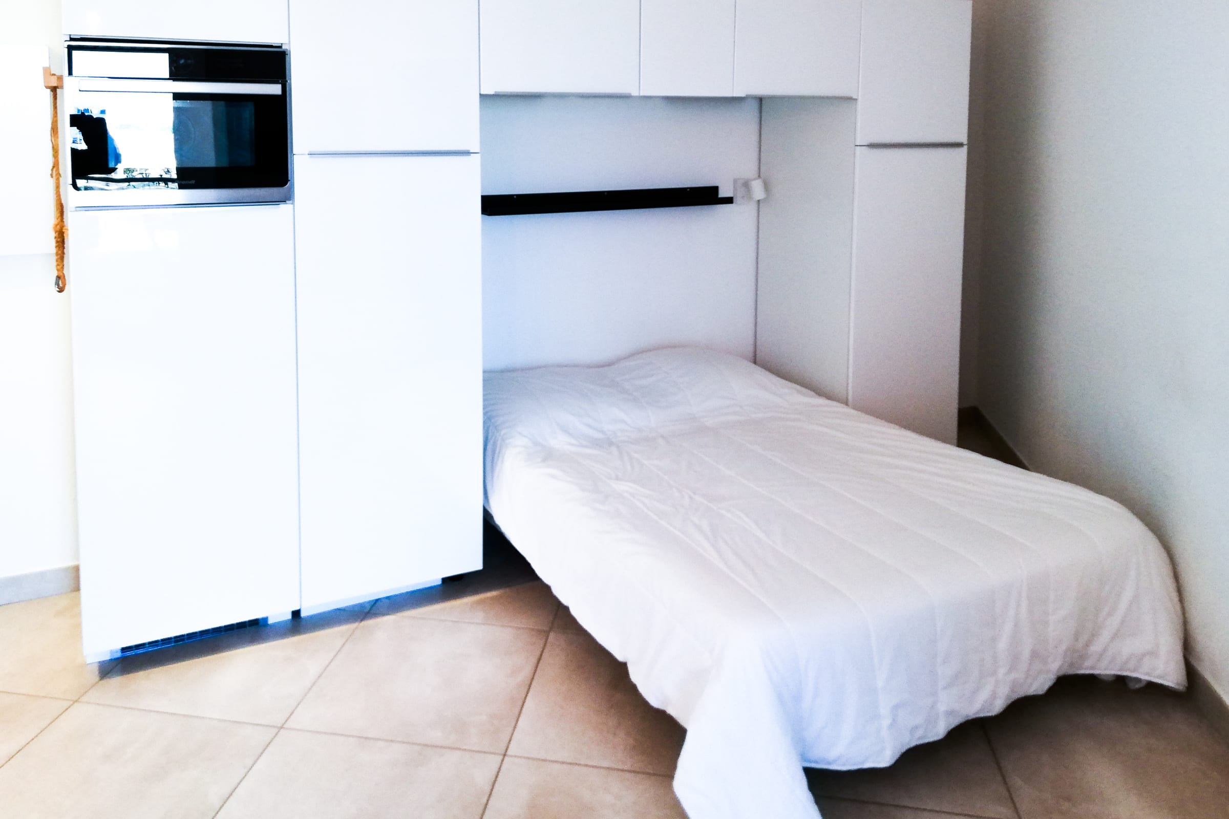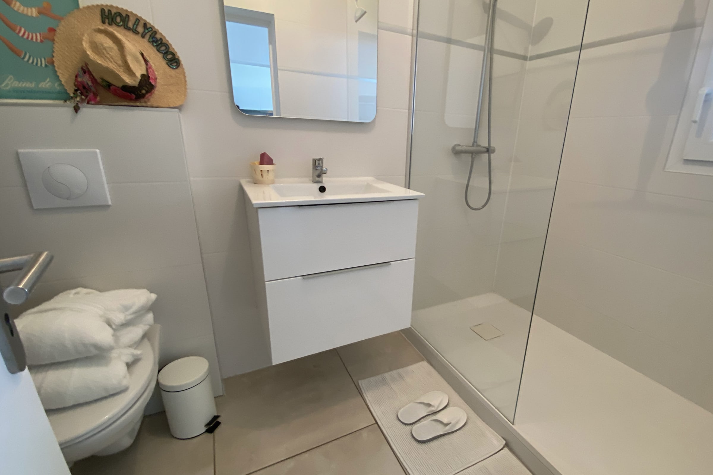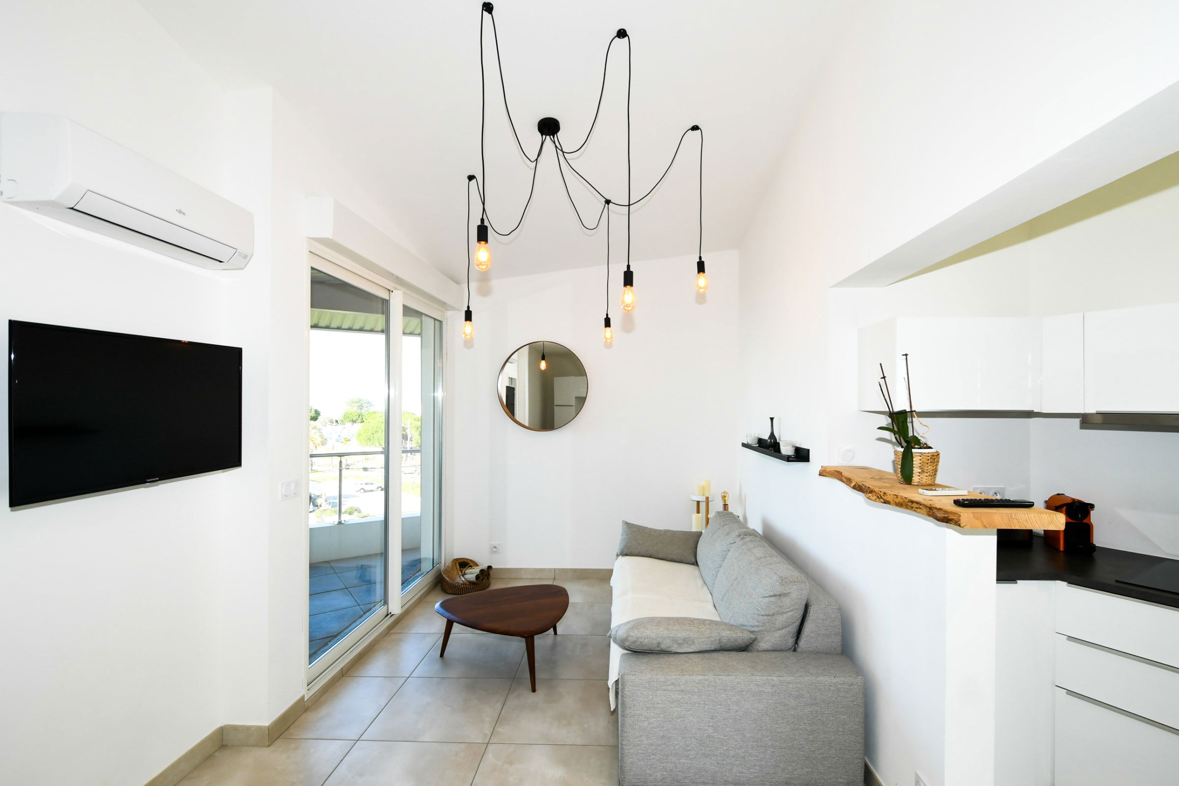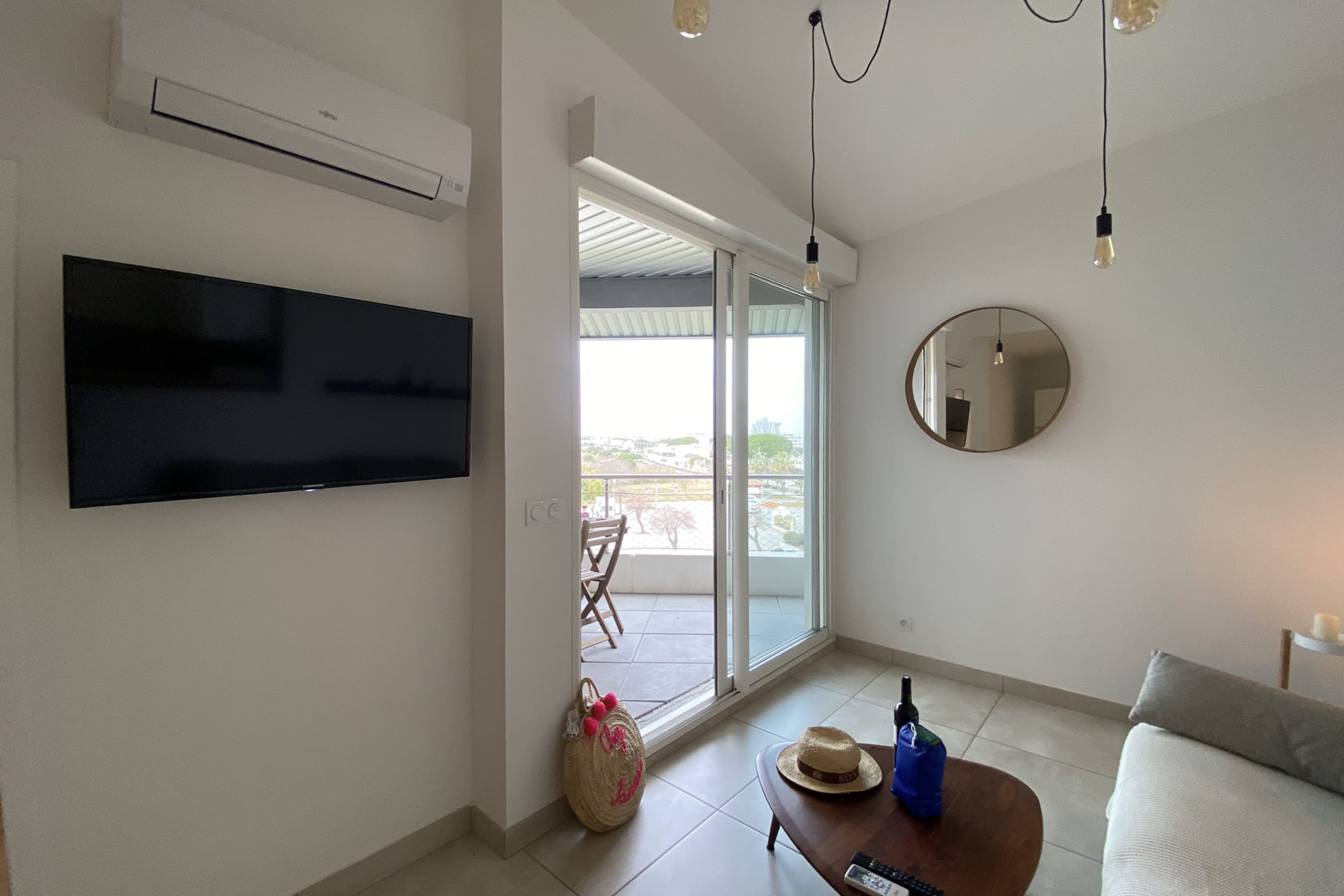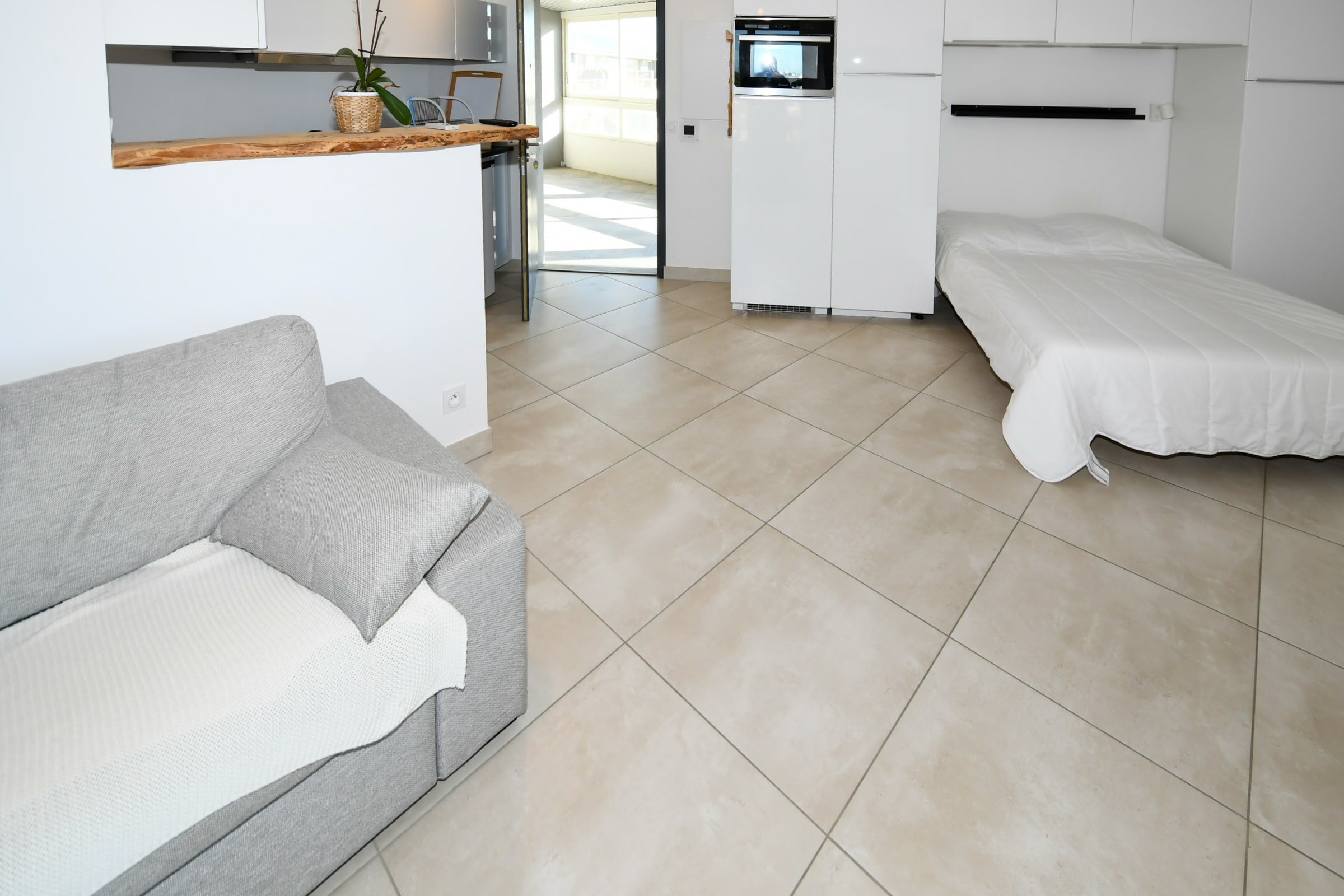 This comfortable studio is located on the 4th and top floor of a modern seafront residence with elevator – Château Leenhardt – offering direct beach access through the garden. Right in the heart of the village, in a quiet and sought-after area, everything is within walking distance: shops, markets (town center and Boucanet), restaurants, tapas bars, cinema…