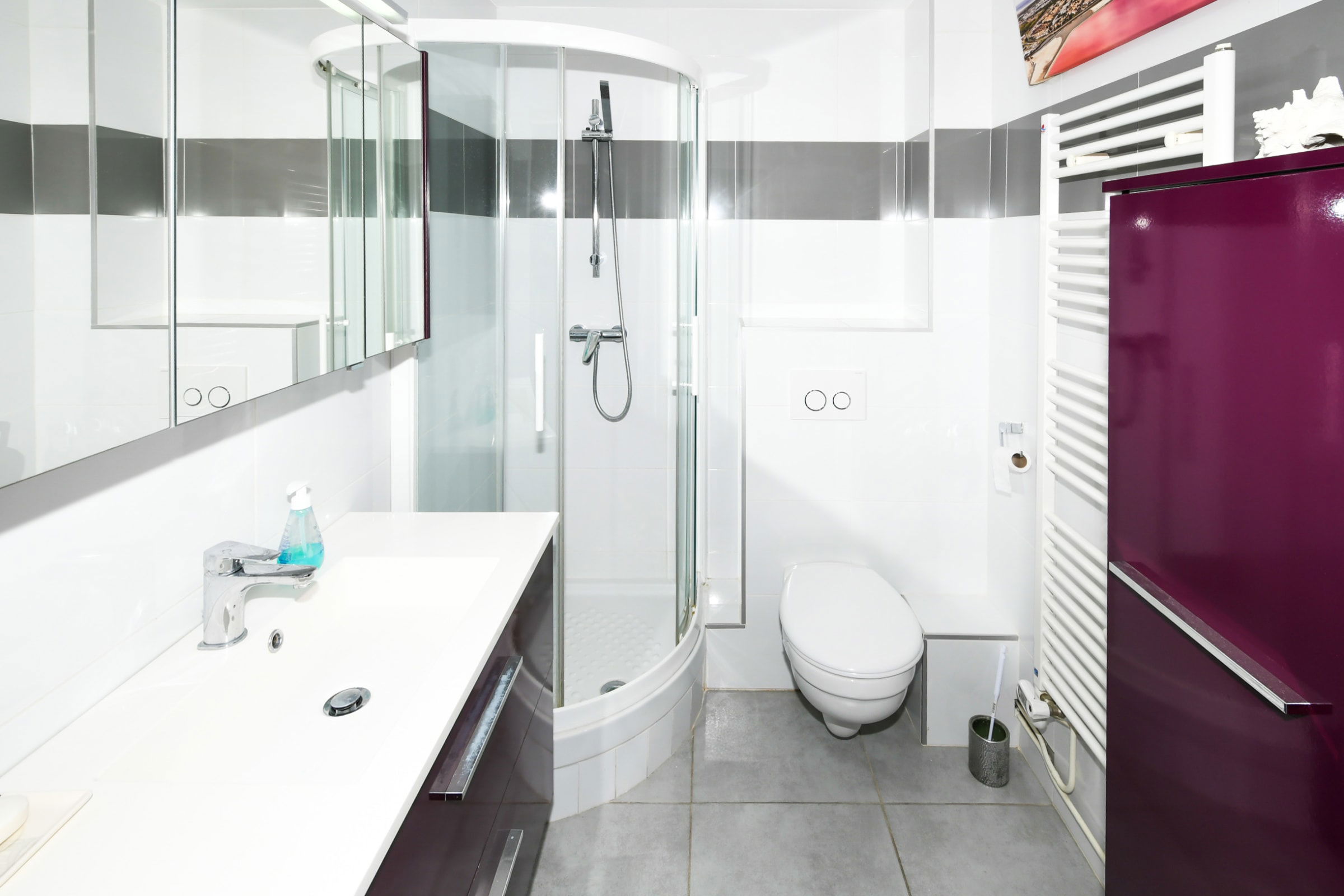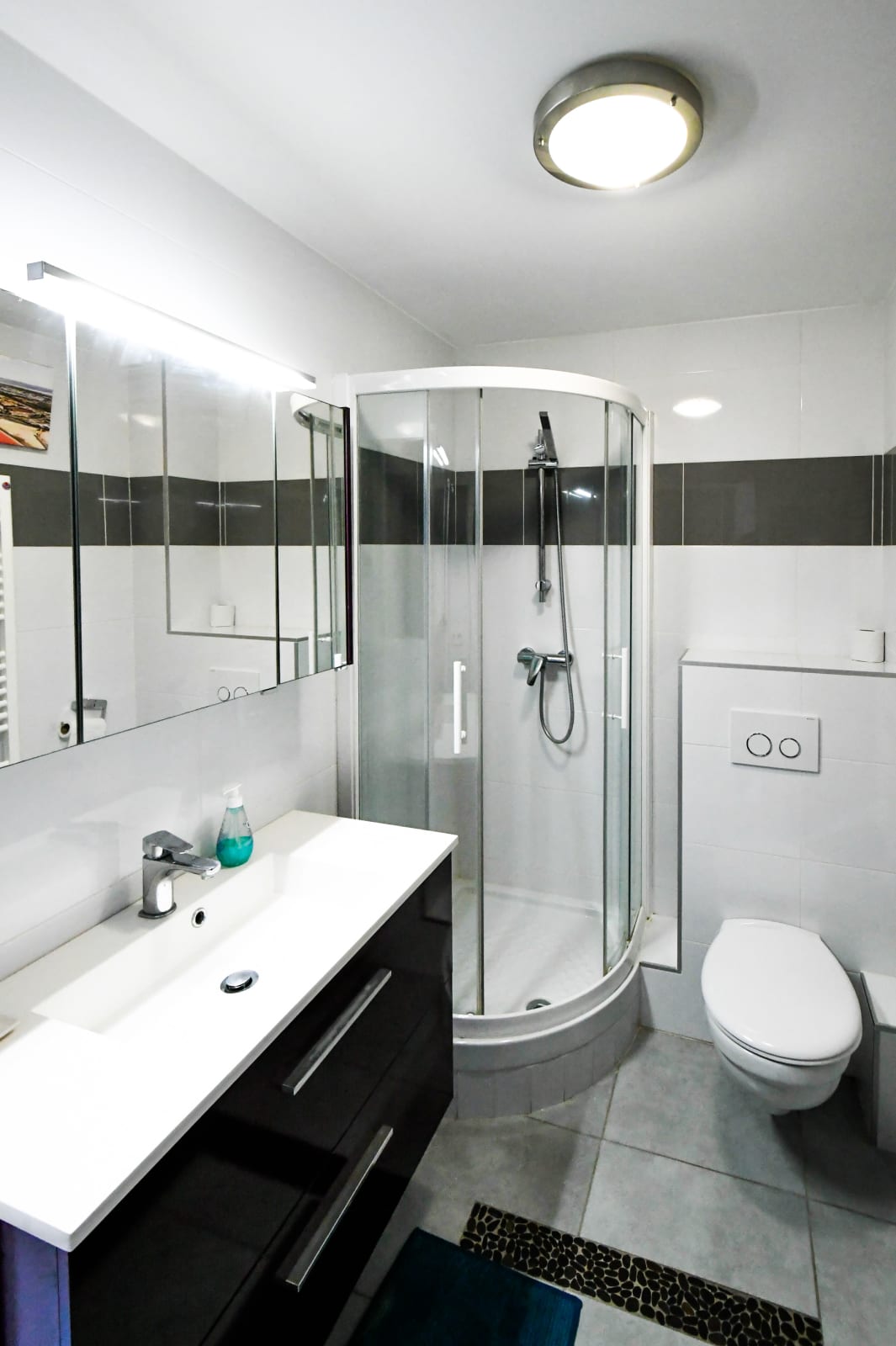 The apartment features a bathroom with a shower and a non-separated toilet.