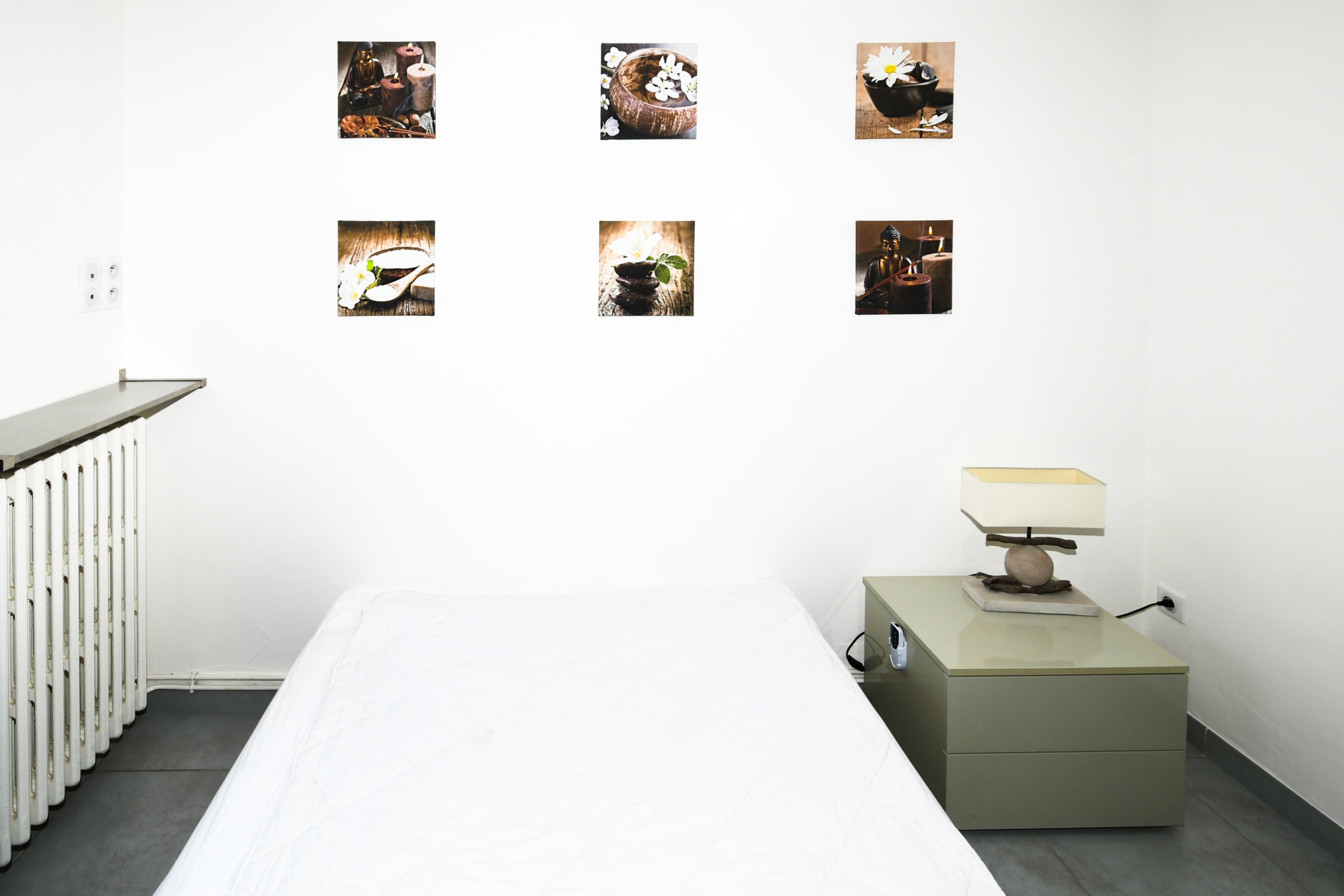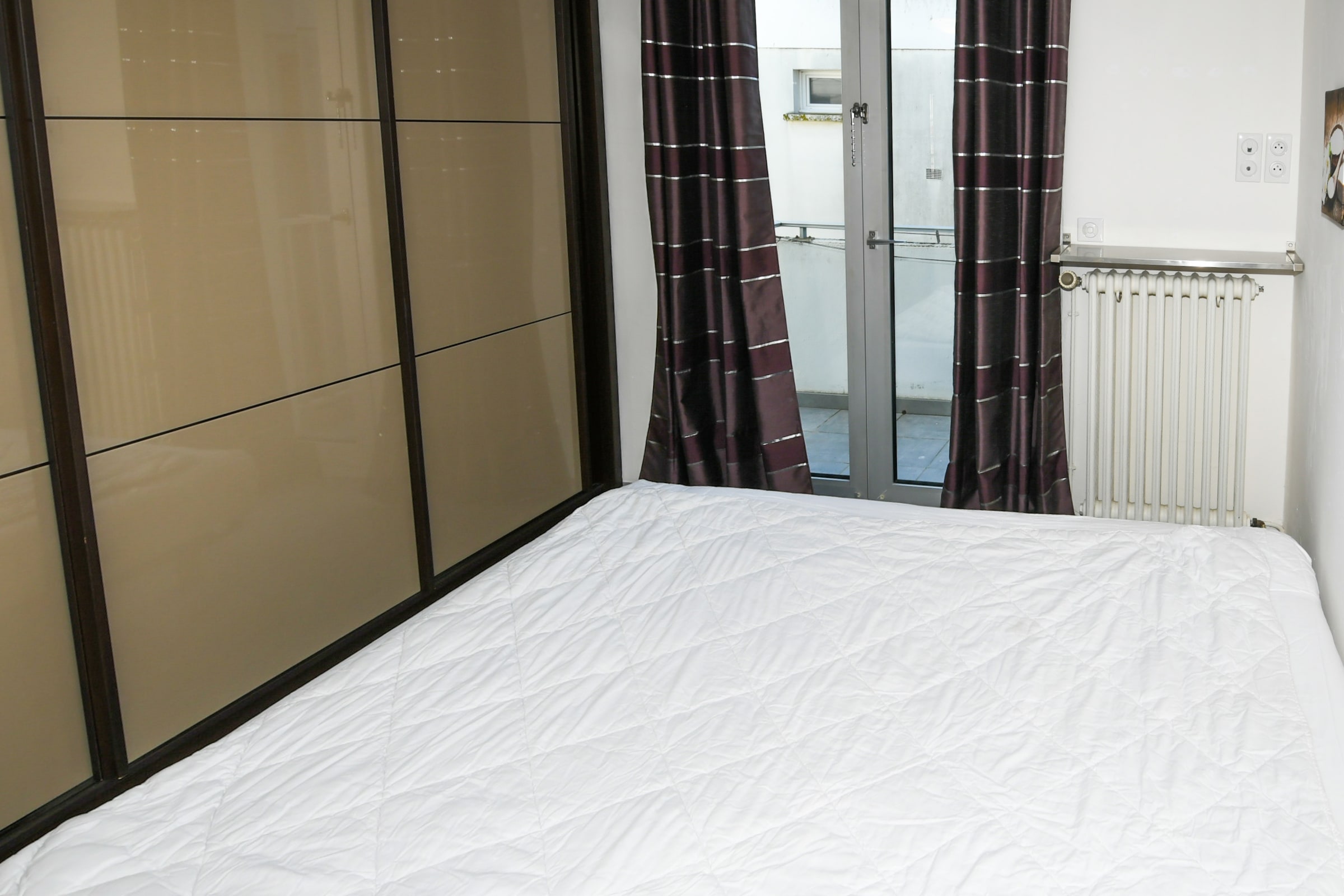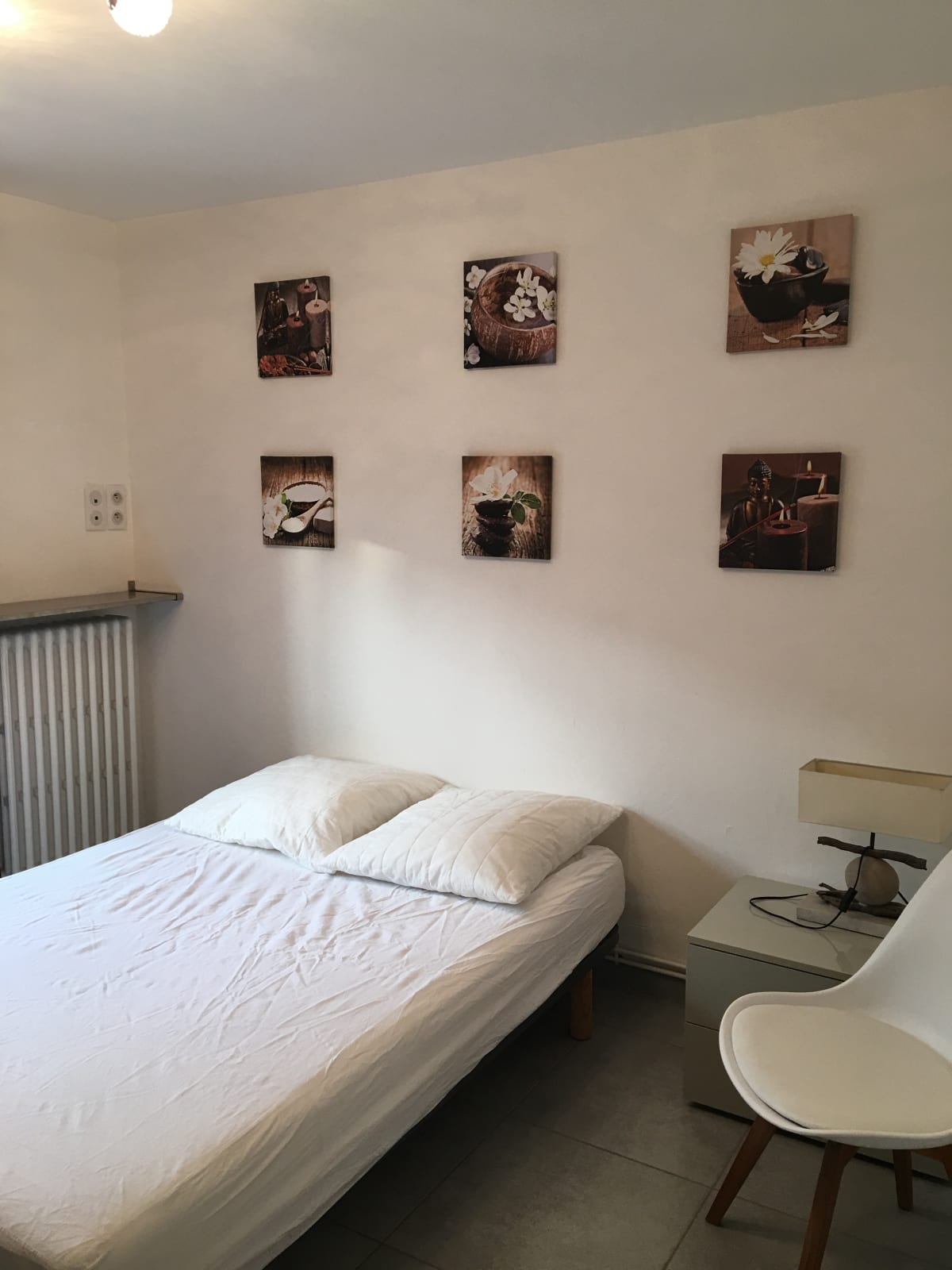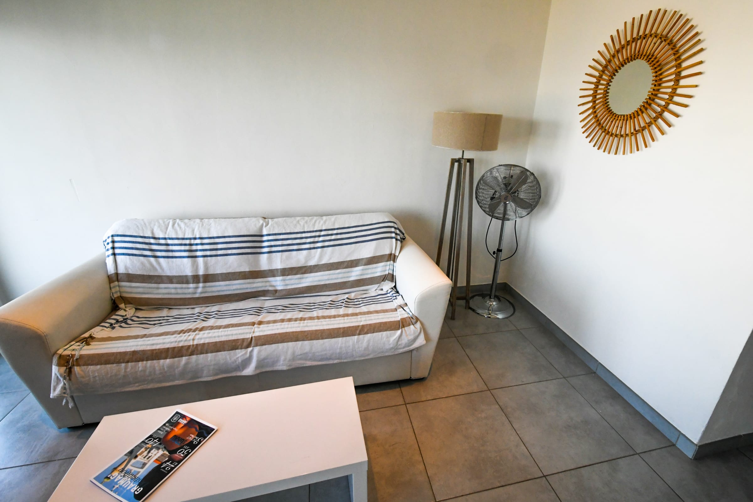 The living room is bright and welcoming, with a convertible sofa, a TV, and air conditioning. Enjoy the calm and relax in the warm bedroom with a simple and elegant decor.