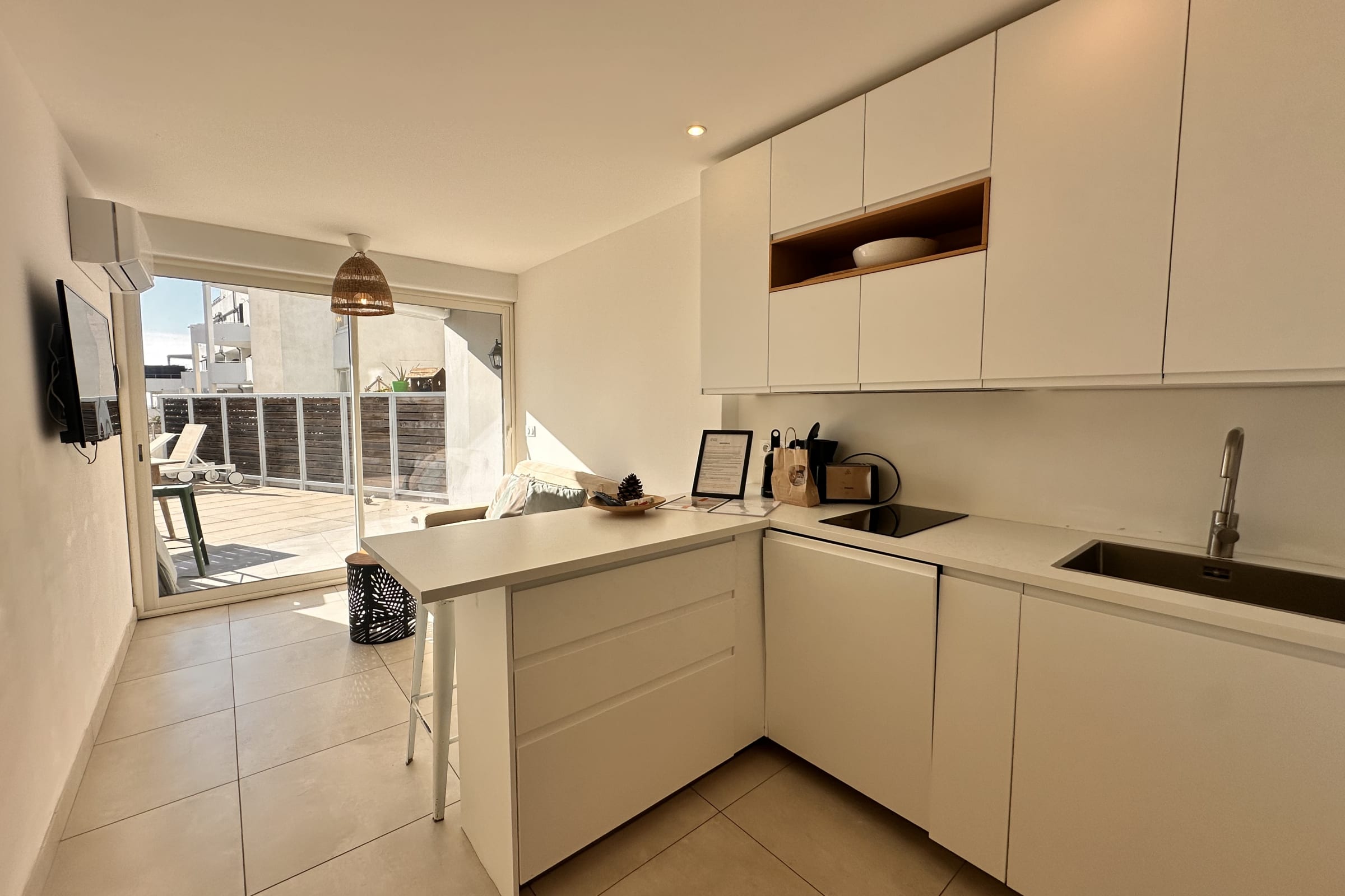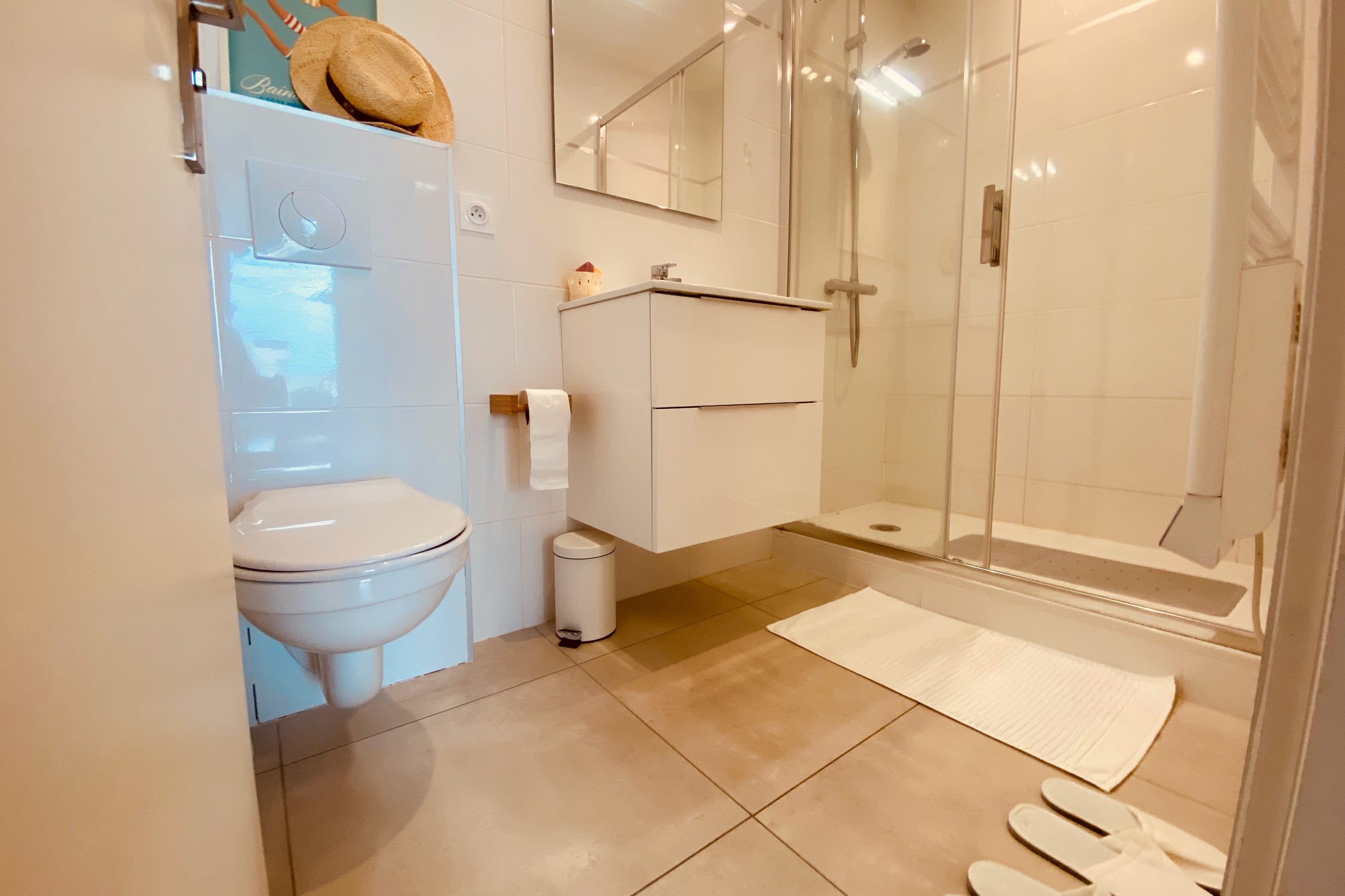 This fully equipped studio is located on the 1st floor (with elevator) of a modern seafront residence – Château Leenhardt – offering direct access to the beach through the garden. Ideally situated in the heart of the village, in a quiet and highly sought-after neighborhood, everything is within walking distance: shops, markets (town center and Boucanet), restaurants, tapas bars, cinema…