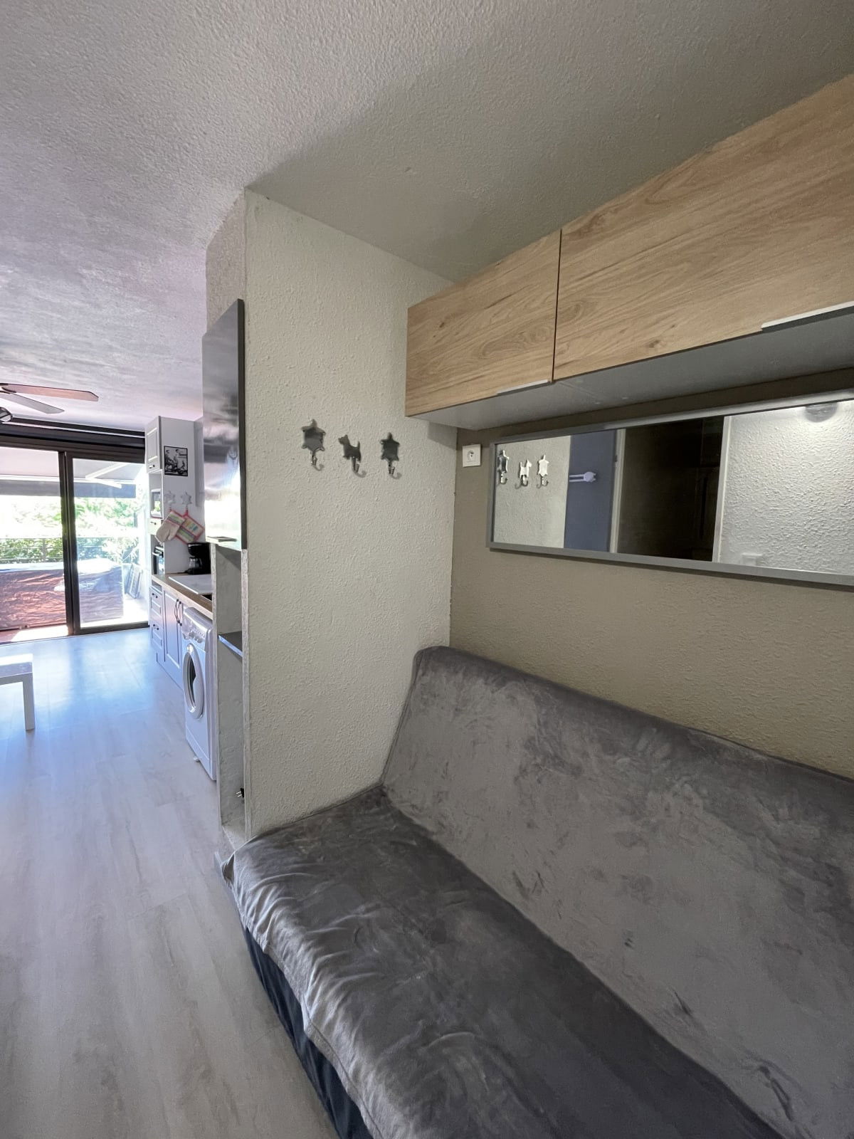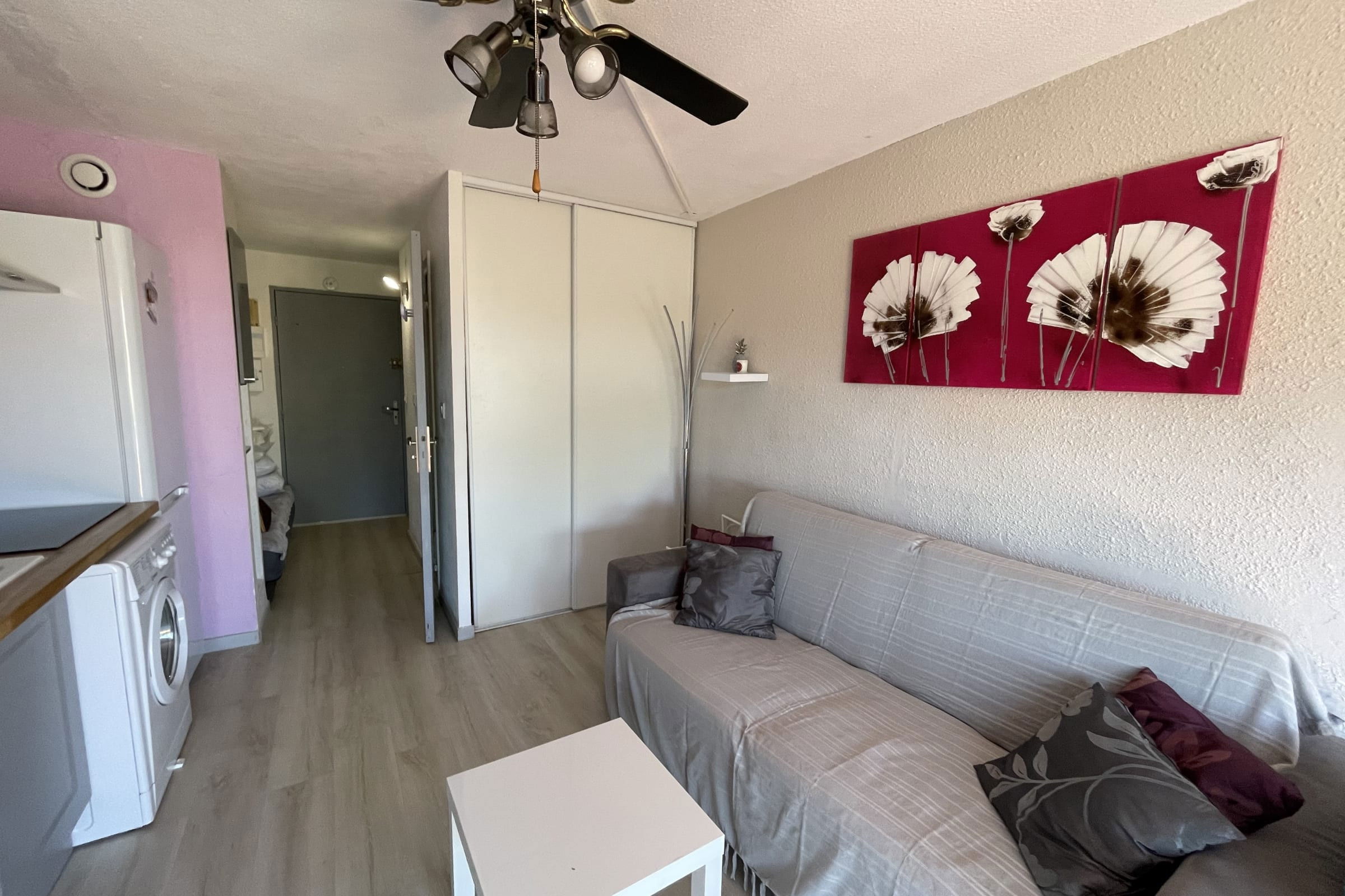 This apartment is facing East and is located on the ground floor of a well-maintained 1980s residence. The security of the apartment is ensured by a digital code. The apartment is laid out as follows: a kitchenette, a living room, and a shower room. It also has electric convector heating, which is individual. The interior of this apartment is in excellent condition.