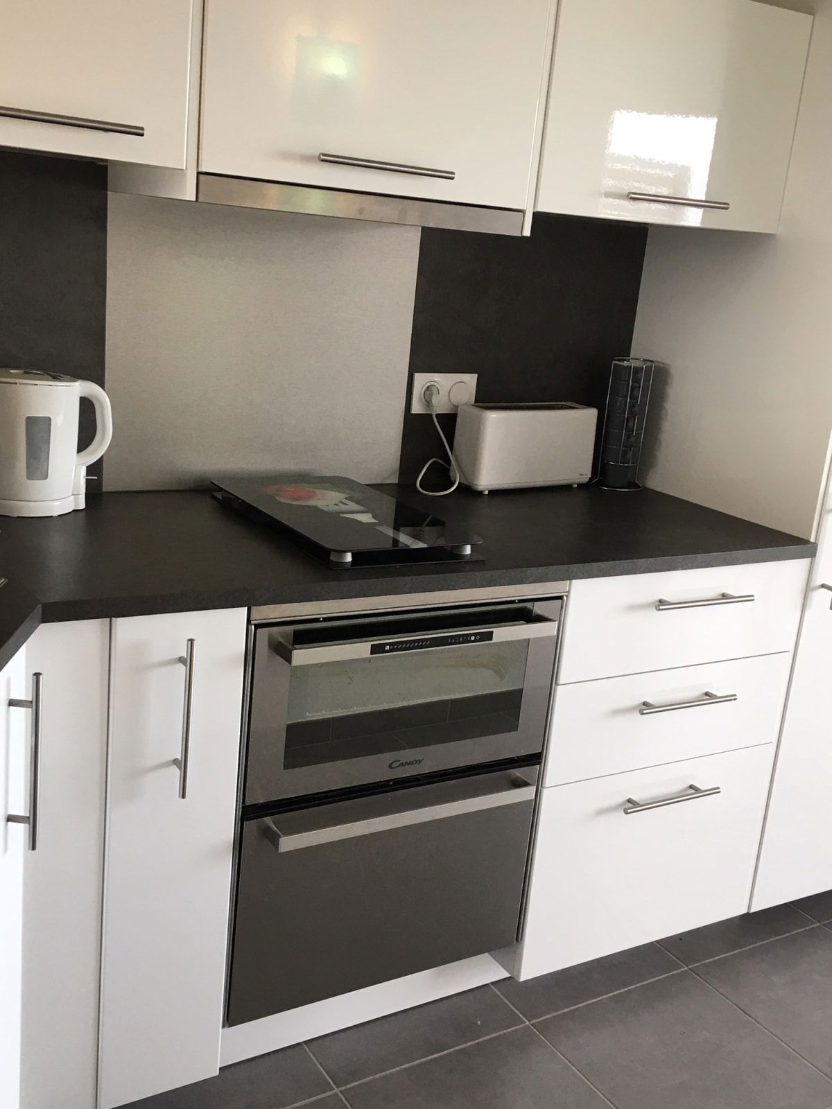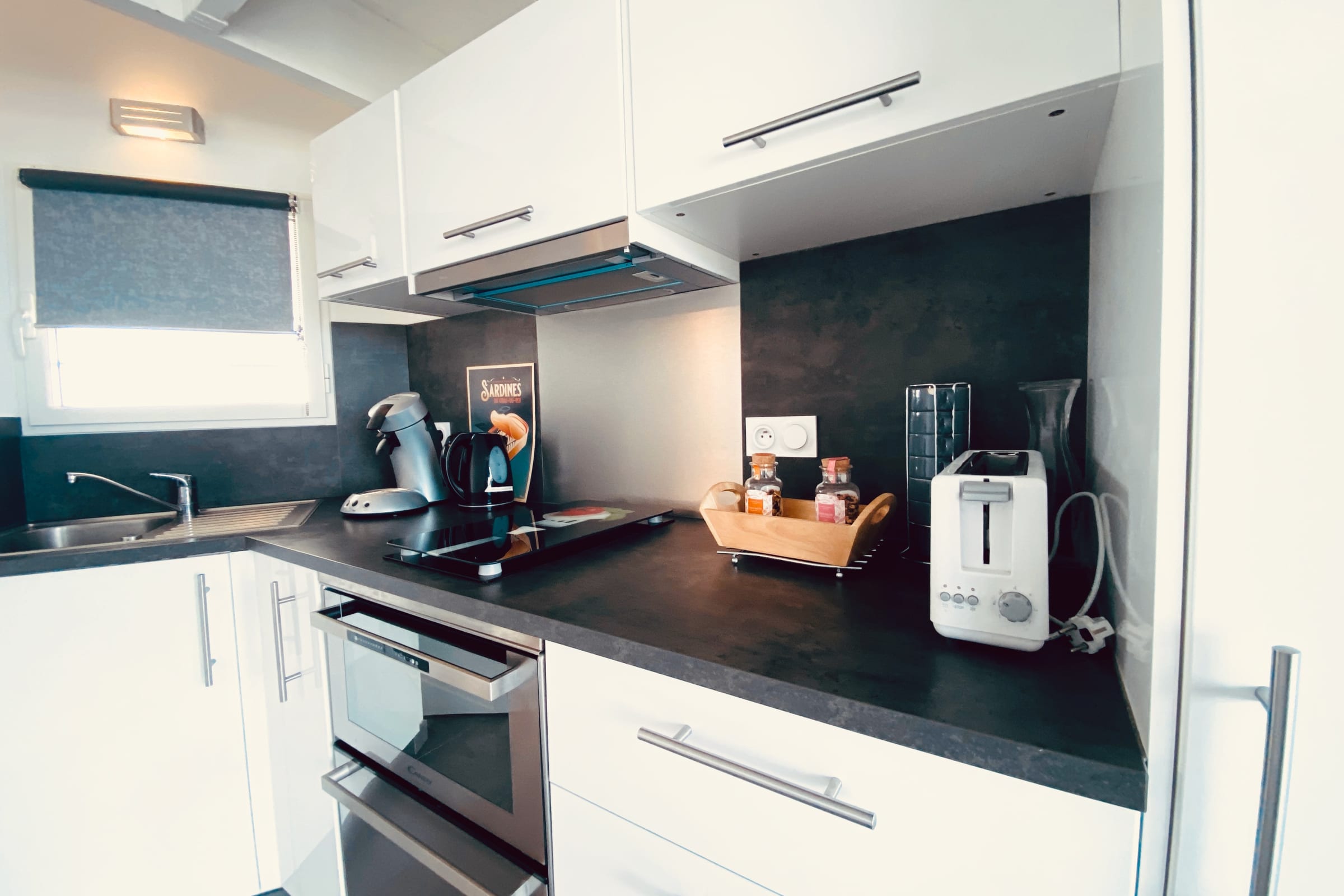 Open kitchen: coffee machine, kettle, toaster, oven, microwave, fridge, utensils