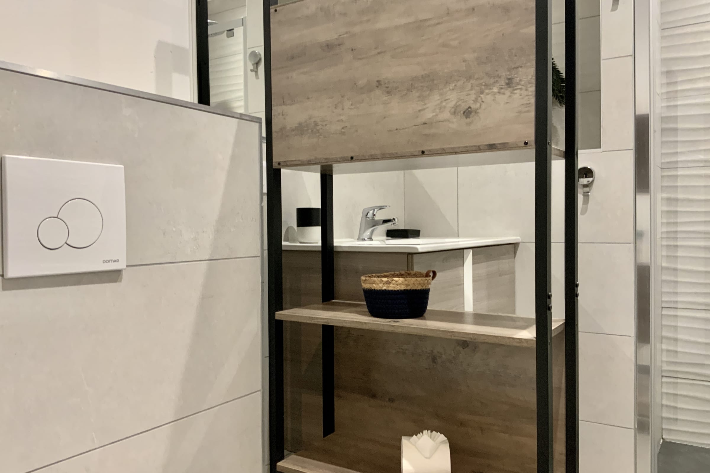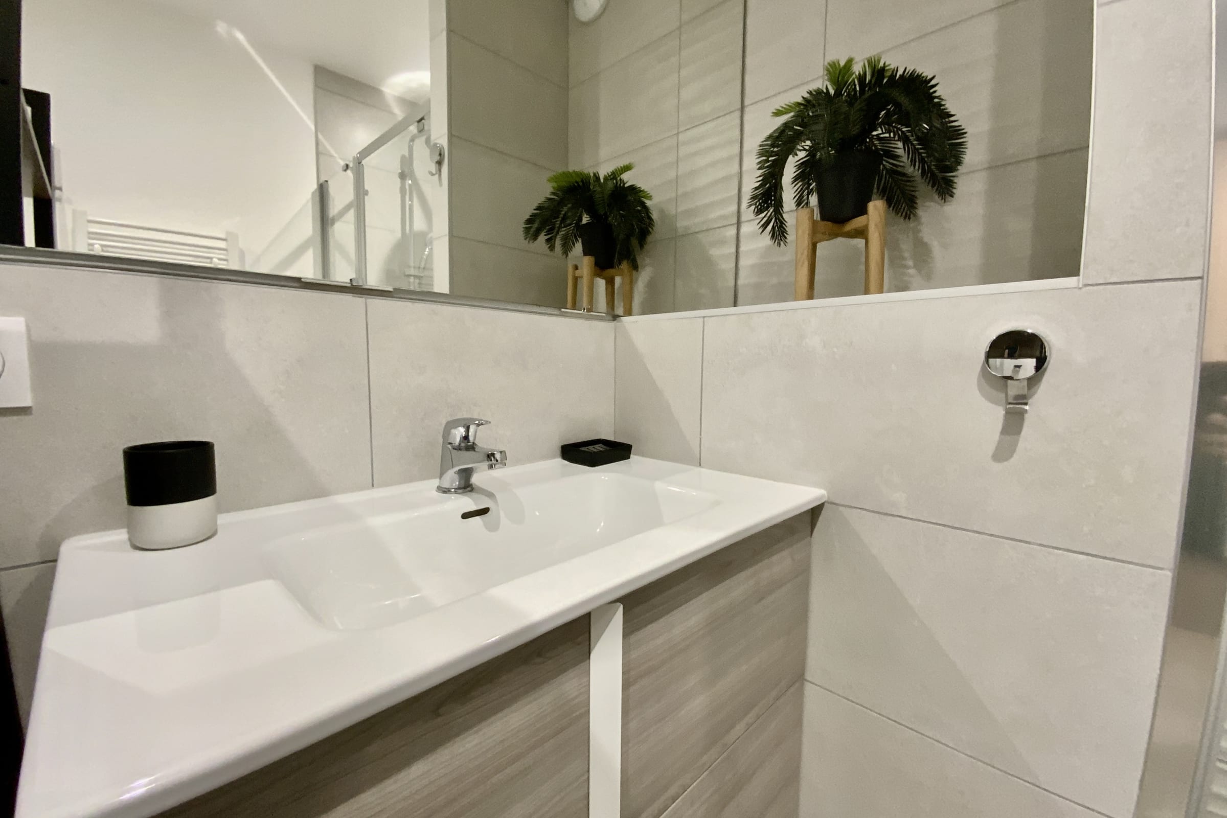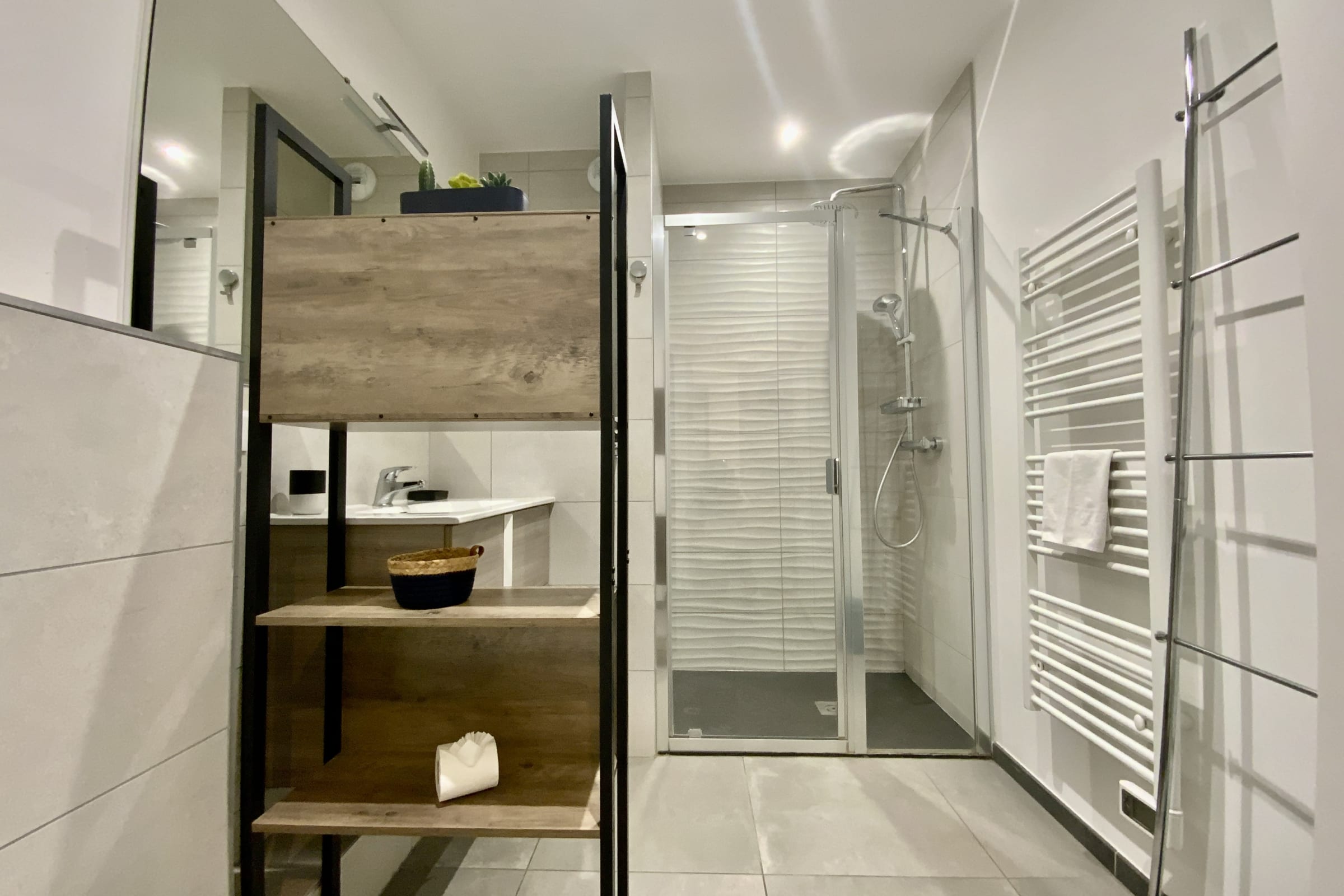 The apartment has a bathroom with a shower.
