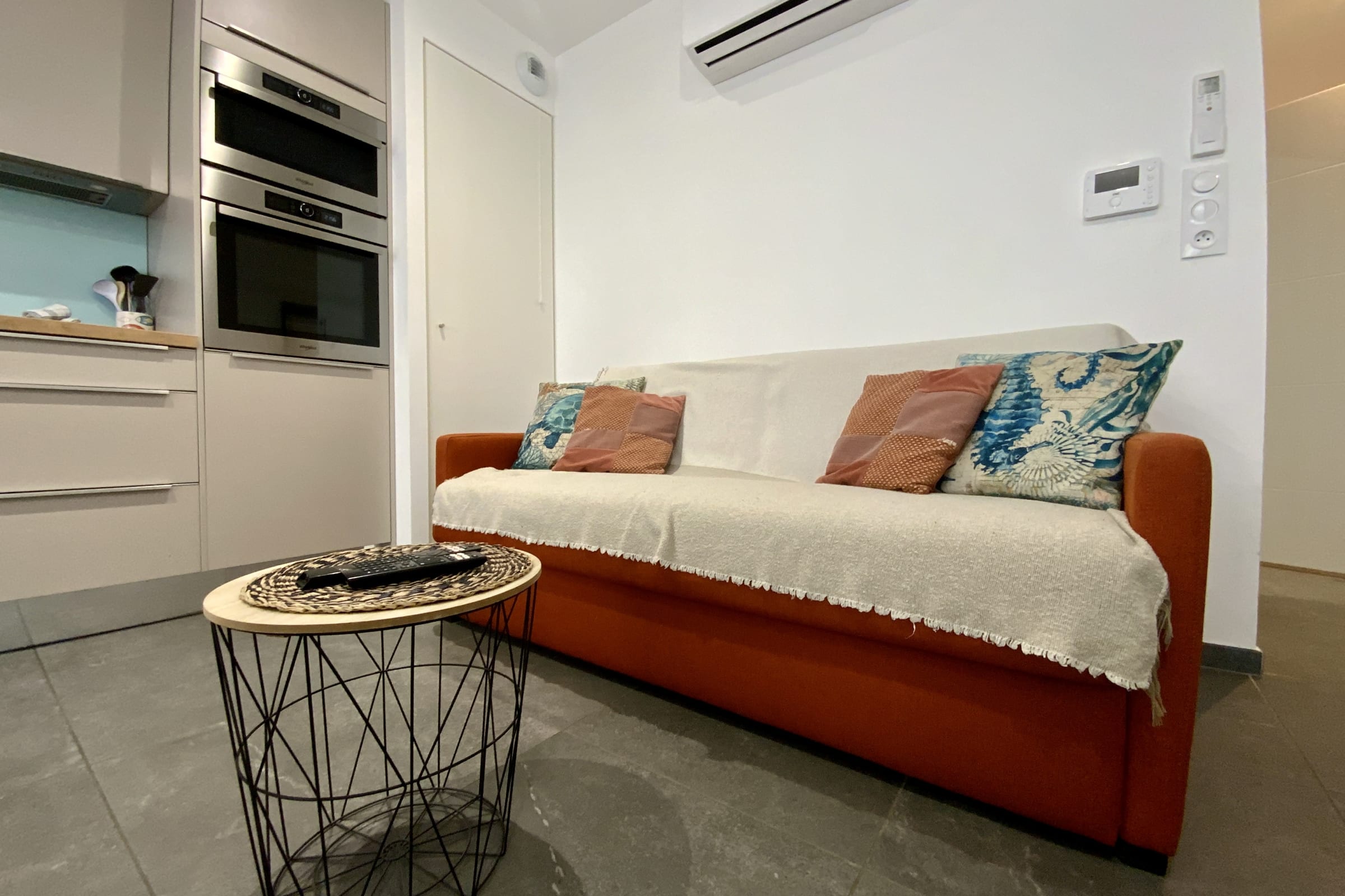 The living space is spacious and modern, with a convertible sofa, a TV.