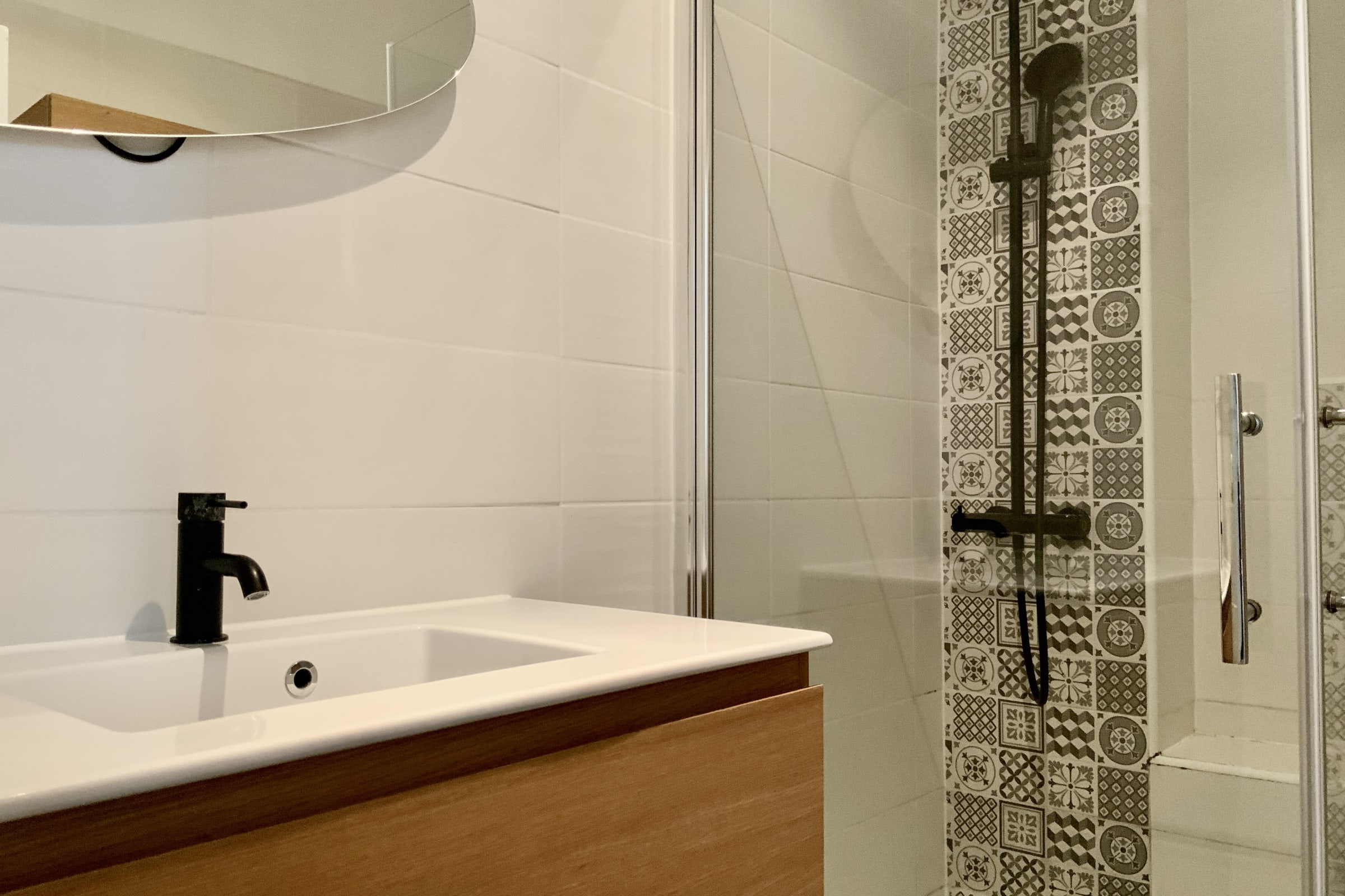 The apartment also has a newly renovated bathroom with an Italian shower and modern décor, as well as a separate WC.