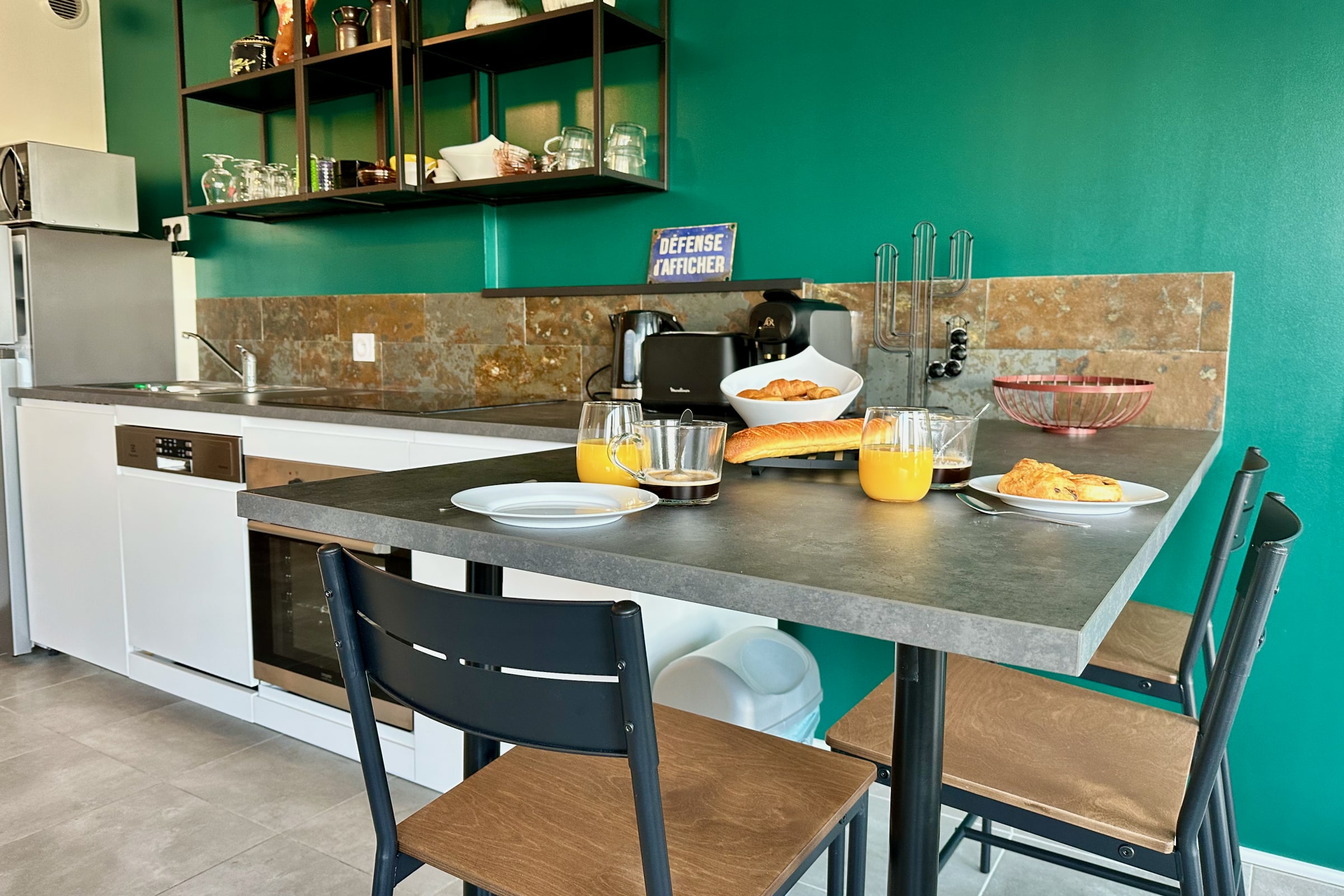 A fully equipped open kitchen (coffee machine, kettle, toaster, oven, microwave, fridge…)
