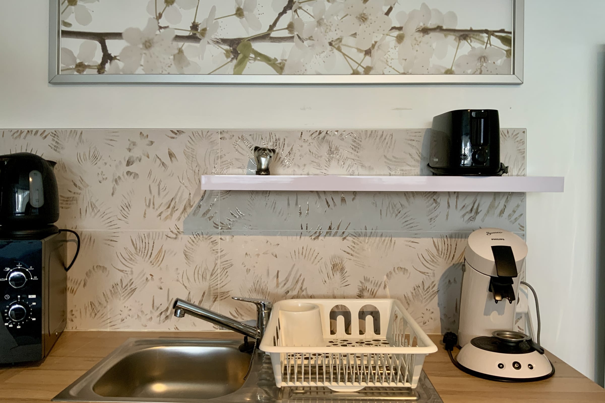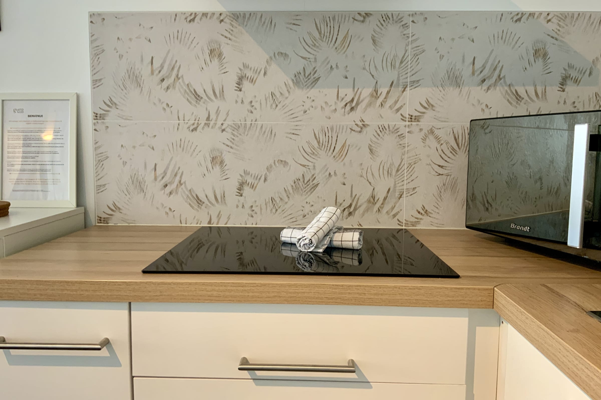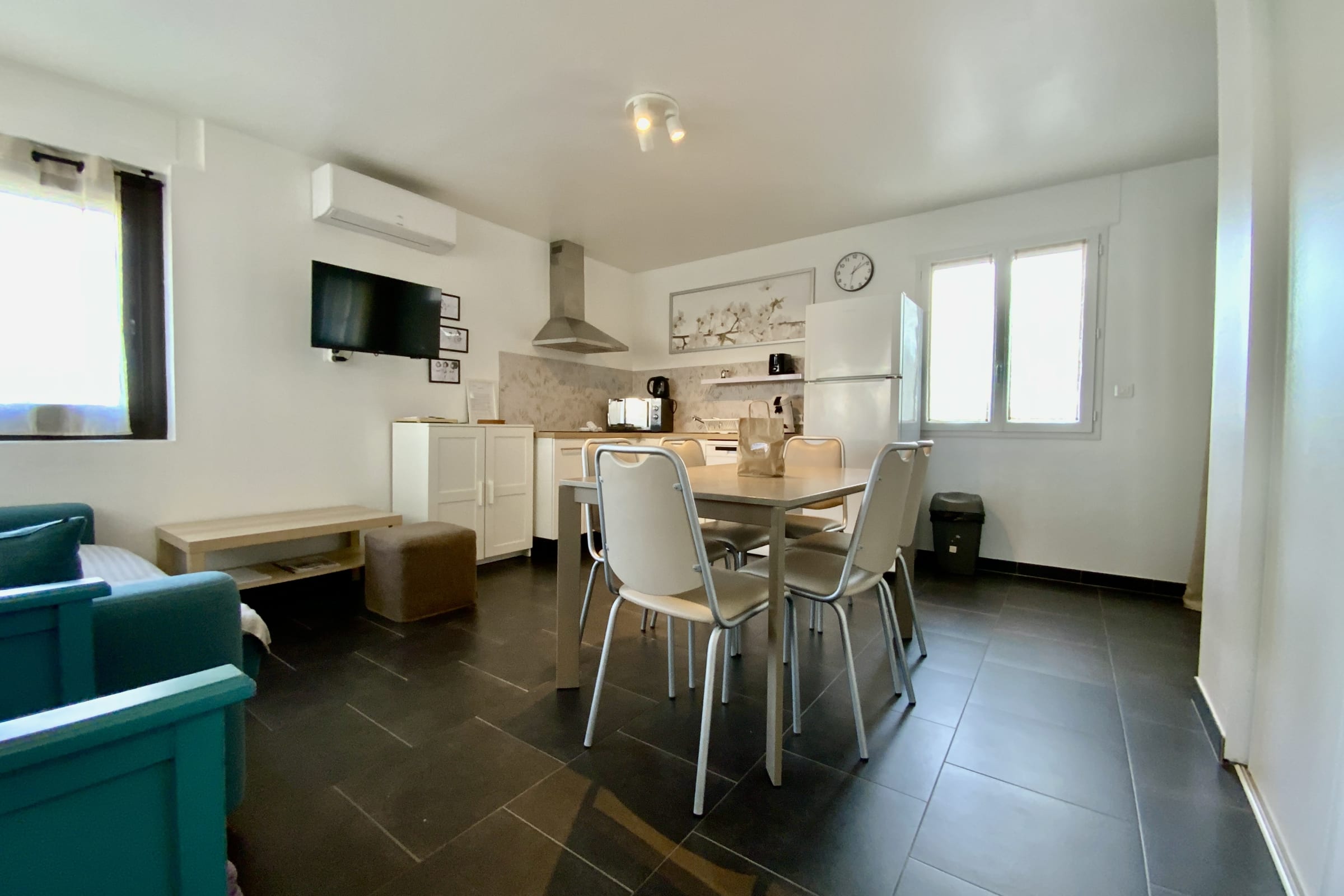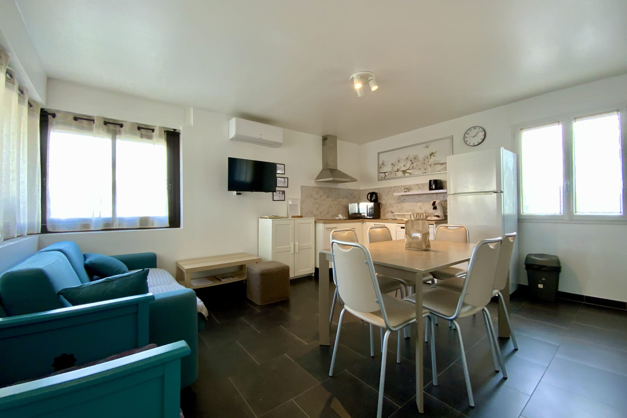 You’ll find a spacious living area with an open kitchen, fully equipped with everything you need: kettle, toaster, coffee machine, etc. There’s a dining area with a table for 4 people, a living room with TV, air conditioning, and a bathroom with WC. The beach is just a few steps away, and there are beautiful walks directly from the residence. You can enjoy amazing sunsets and fully appreciate the sea during your stay.