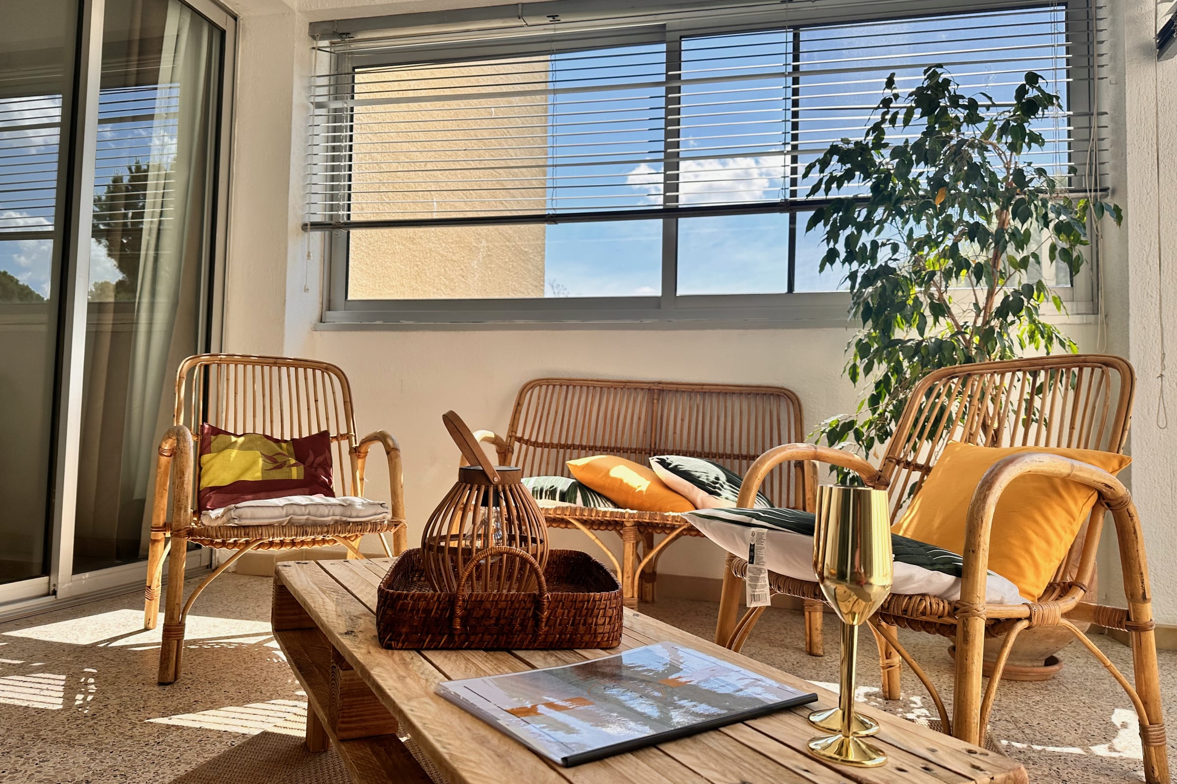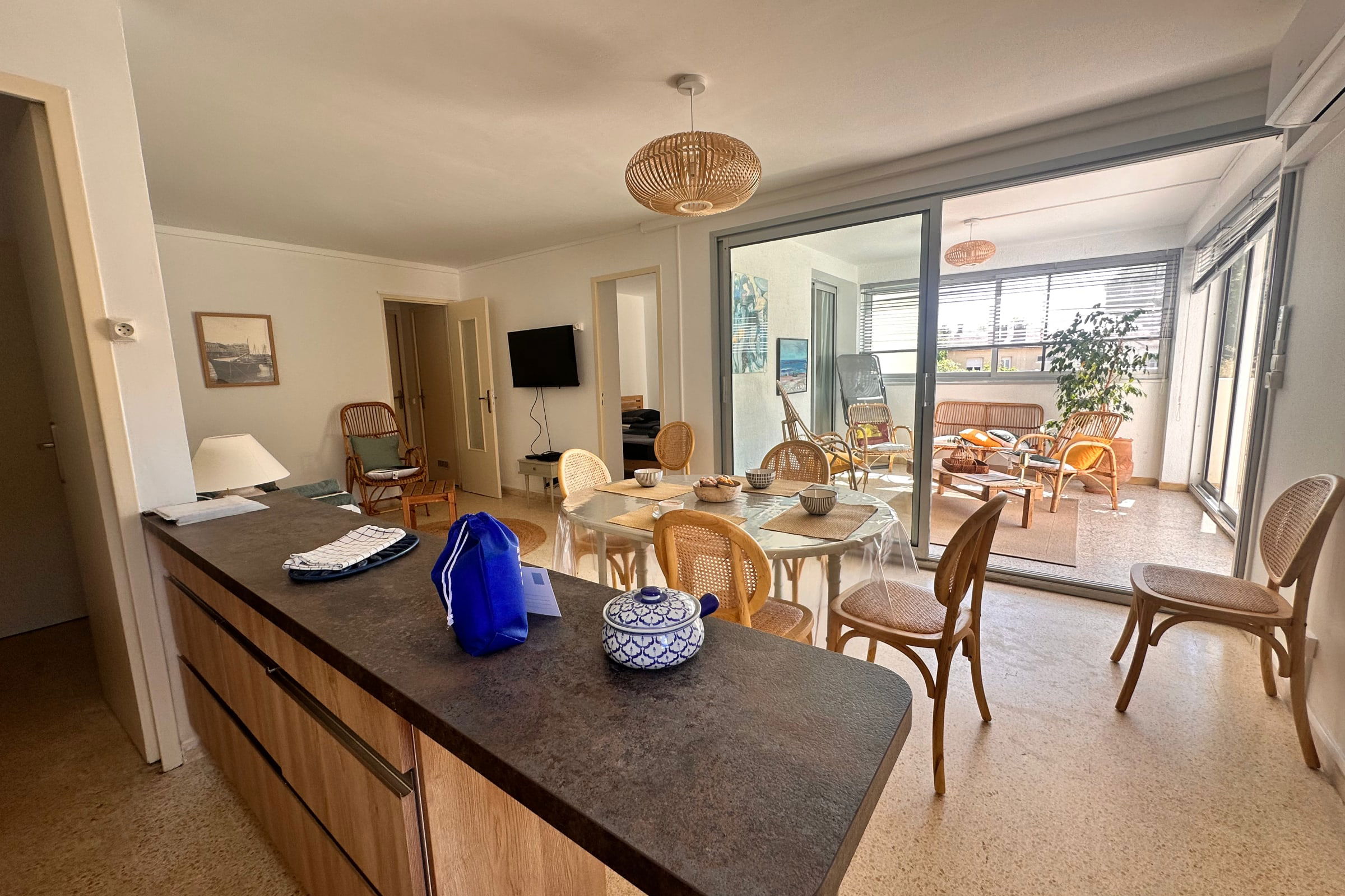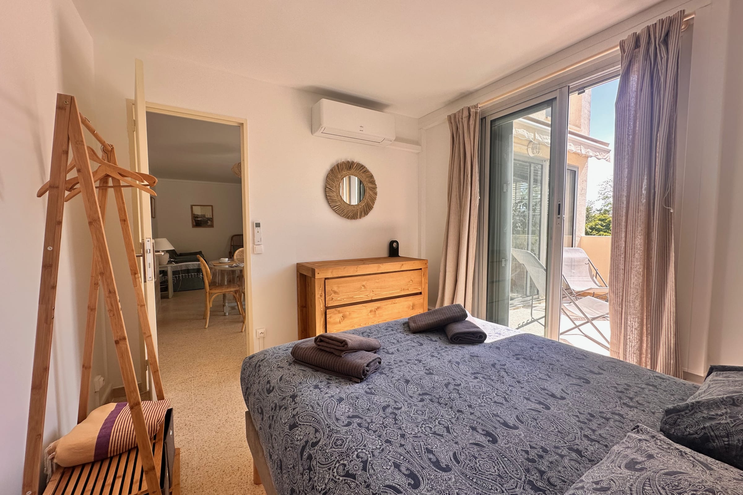 Located on the 1st floor of a secure residence, the apartment features a bright, air-conditioned living area with a relaxing space and access to a covered terrace, perfect for outdoor meals or unwinding after a day at the beach.