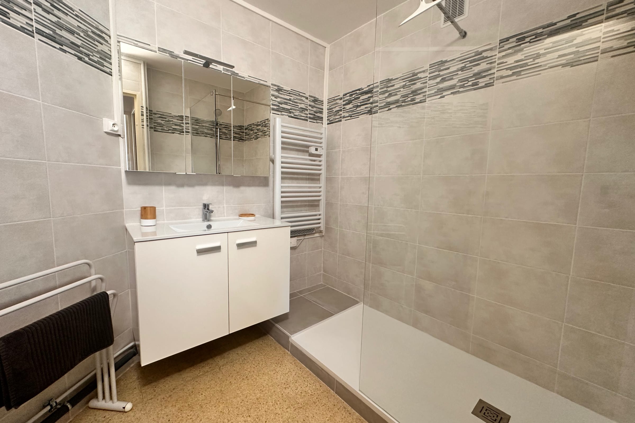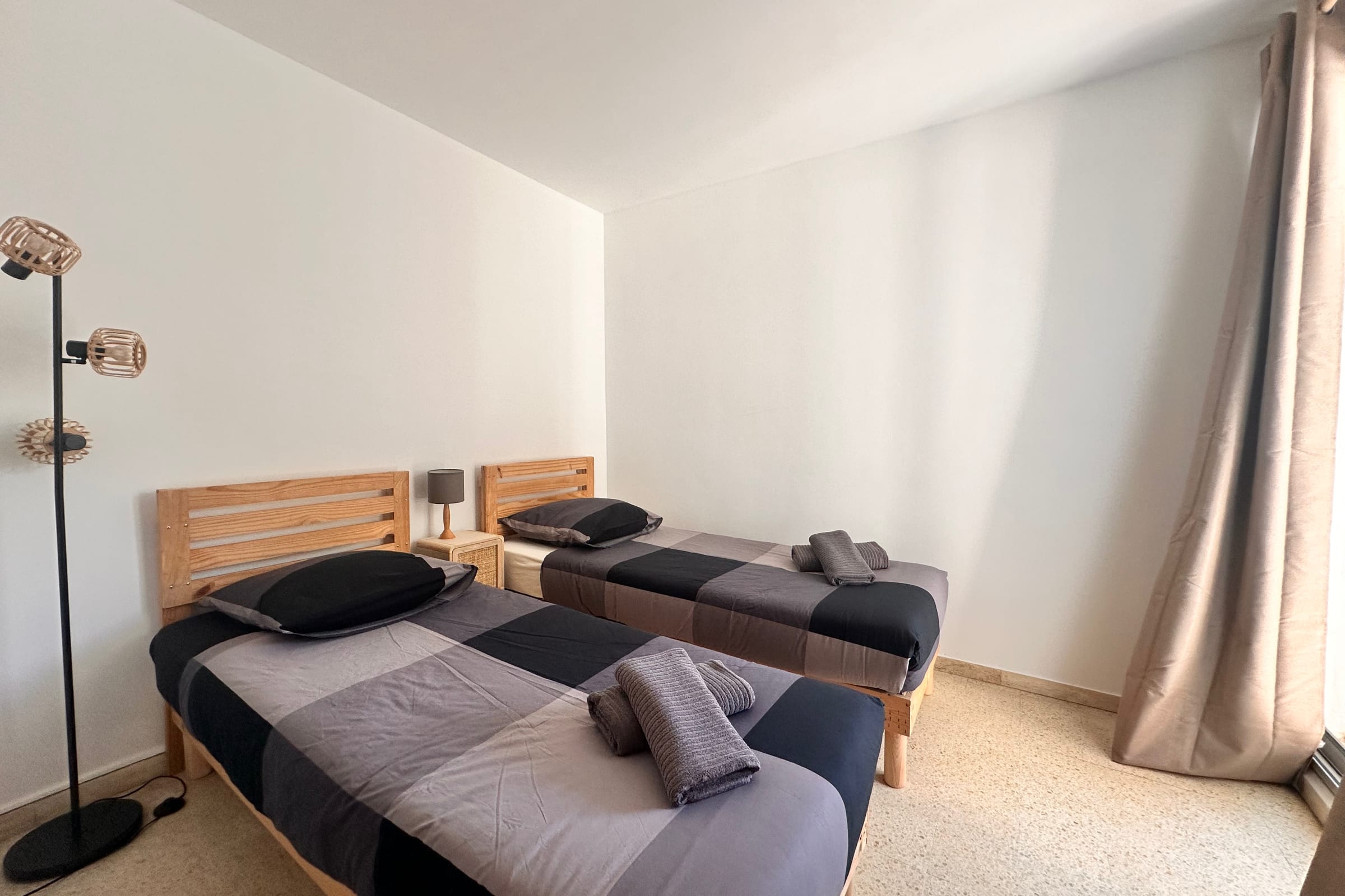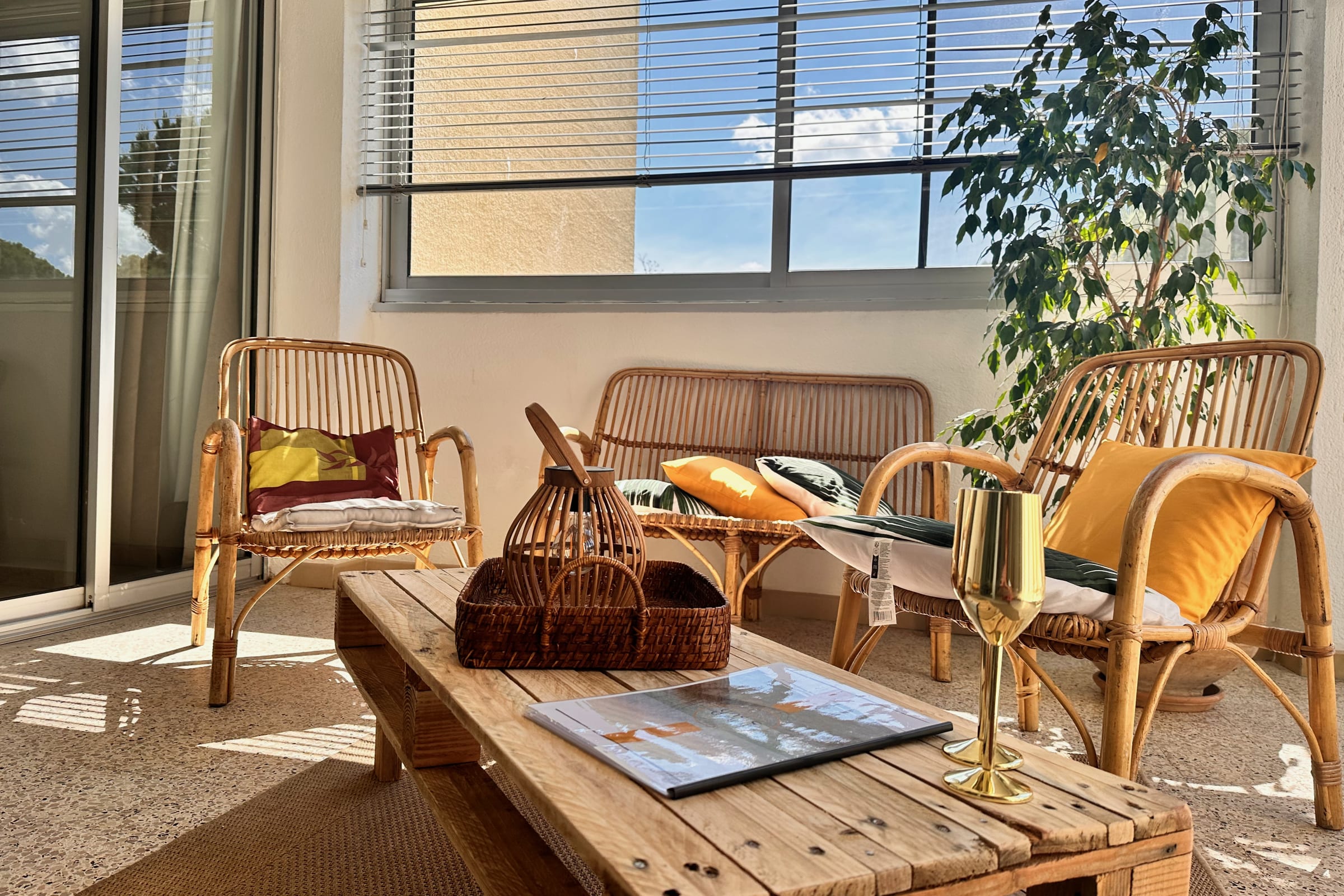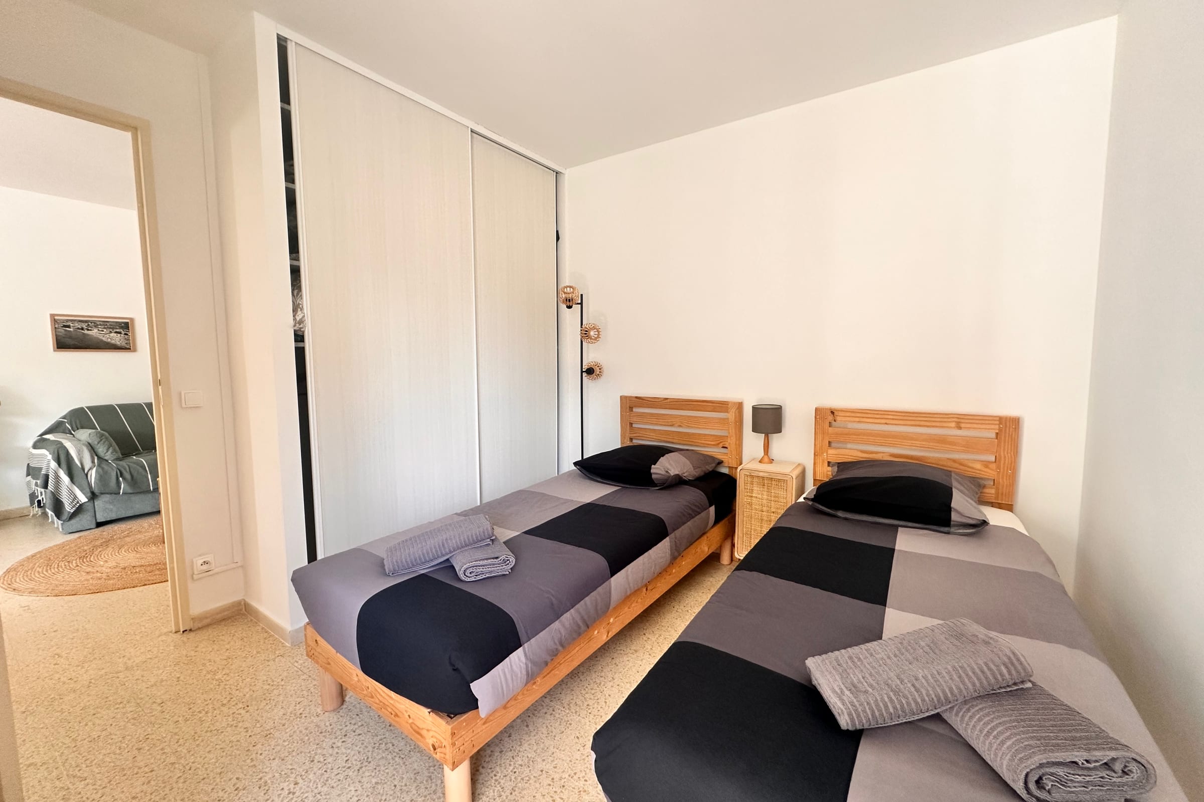 Located on the 1st floor of a secure residence, the apartment features a bright, air-conditioned living area with a relaxing space and access to a covered terrace, perfect for outdoor meals or unwinding after a day at the beach.