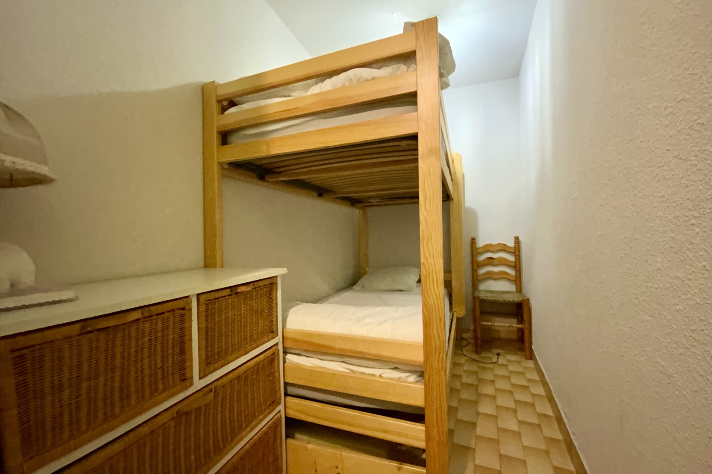 The apartment "Les Vagues" consists of an entrance with a cabin room featuring a bunk bed, an open-plan kitchen fully equipped, and a bright living area with direct access to a superb sea-view terrace. The terrace is perfect for enjoying your breakfast or dining outdoors. A spacious separate bedroom with a double bed also gives access to the terrace, providing you with a peaceful retreat.