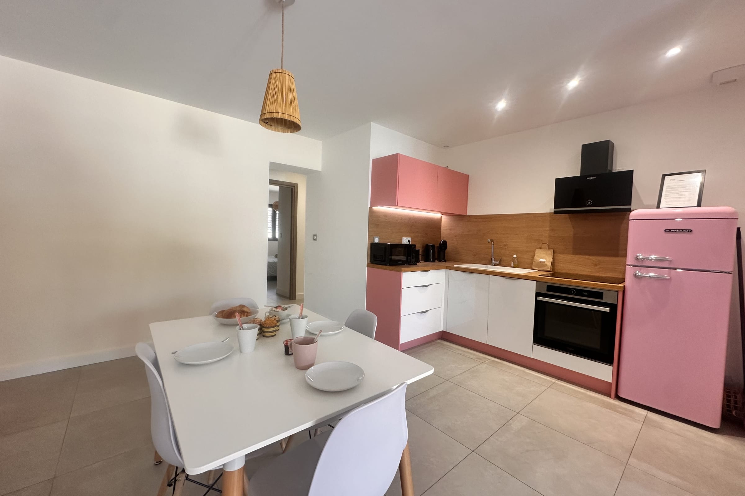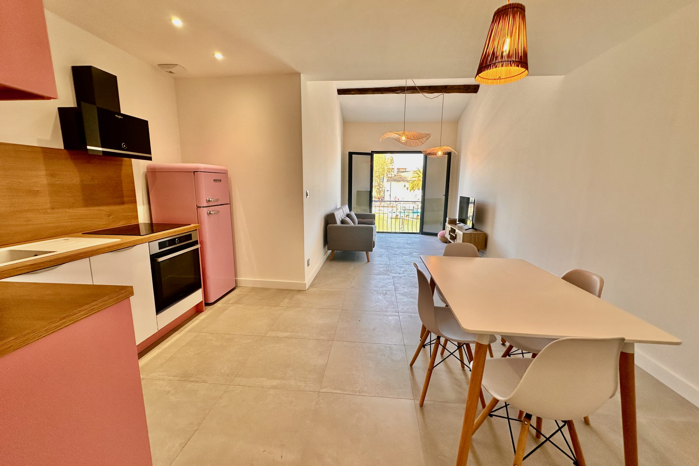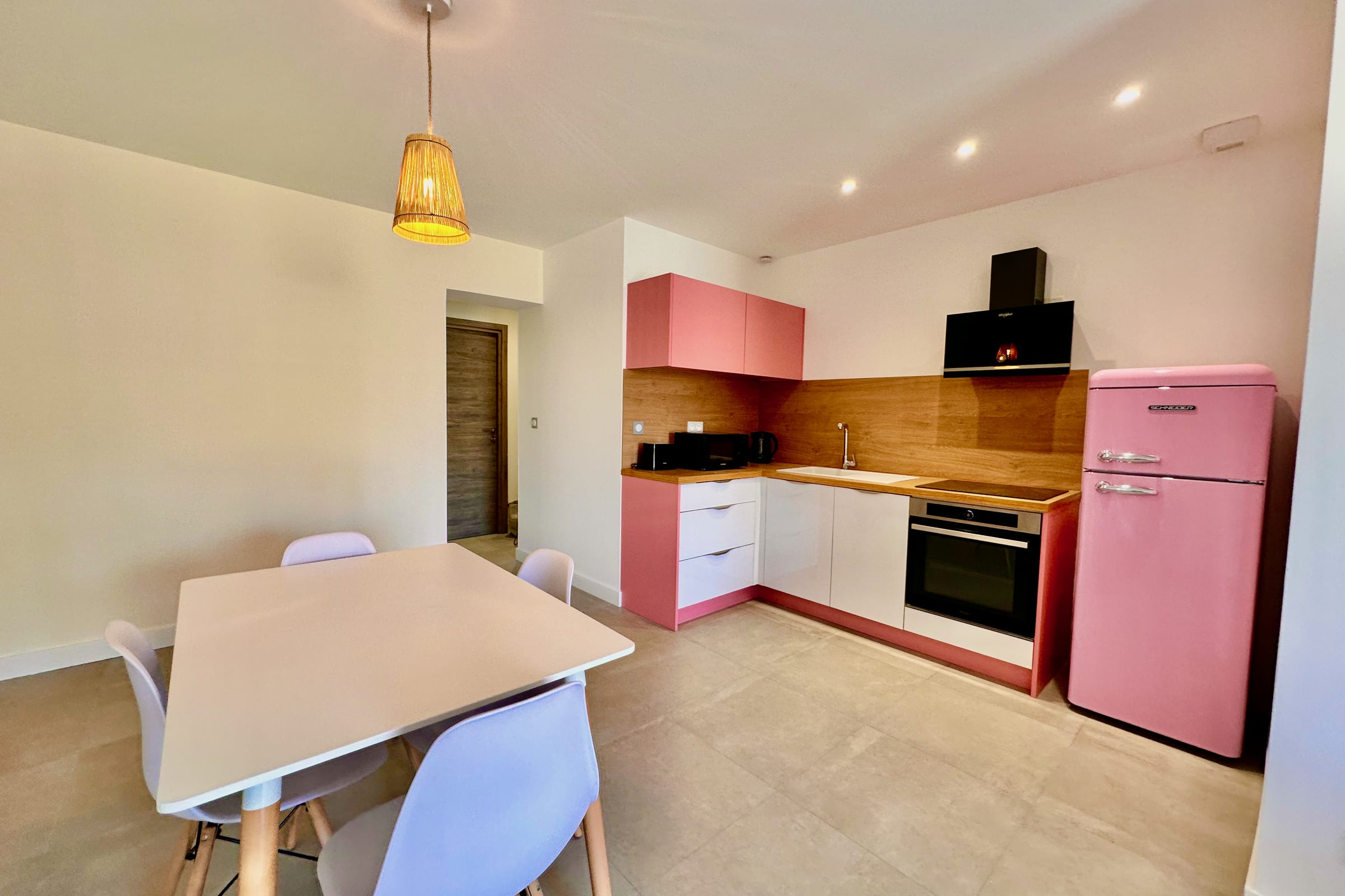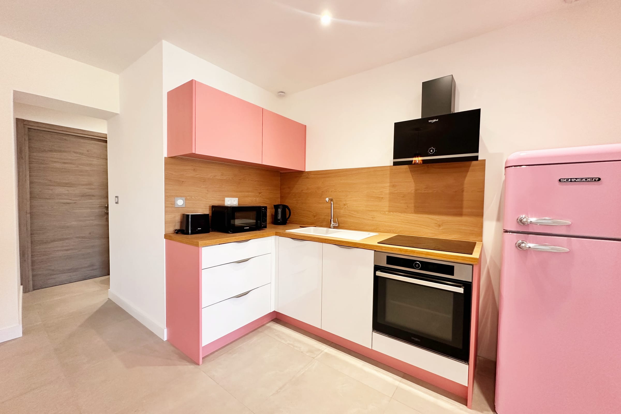 The property has been beautifully renovated with attention to detail. A touch of color during your vacation? You’ll enjoy a lovely living space, with a kitchen in vibrant pink tones that gives it a dynamic look you'll love! The kitchen is fully equipped and has everything you need for your breakfasts and lunches: coffee machine, toaster, kettle, etc. The living area is bright, and the real highlight will be when you discover the stunning view of the Fishing Port from the balcony of the apartment.