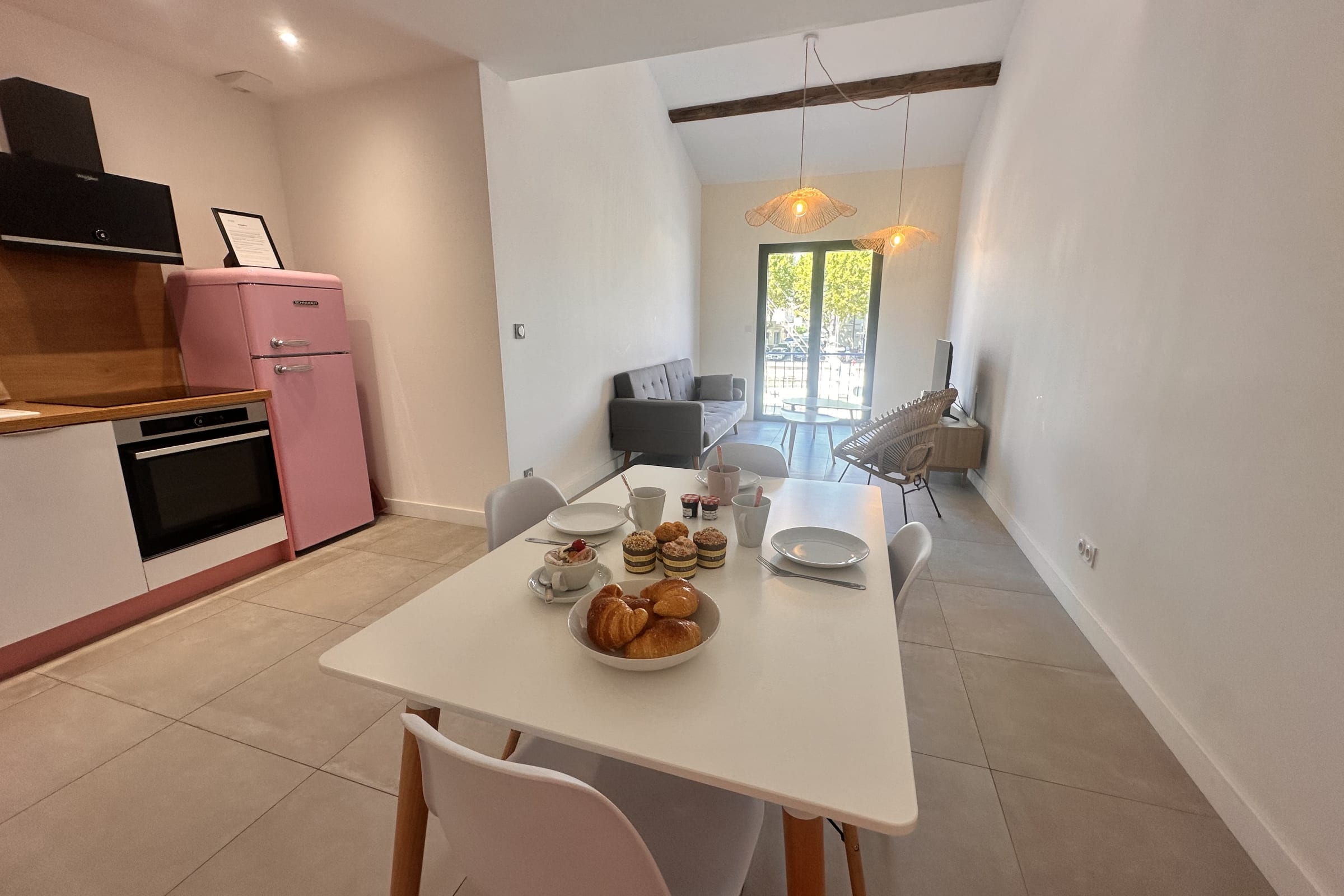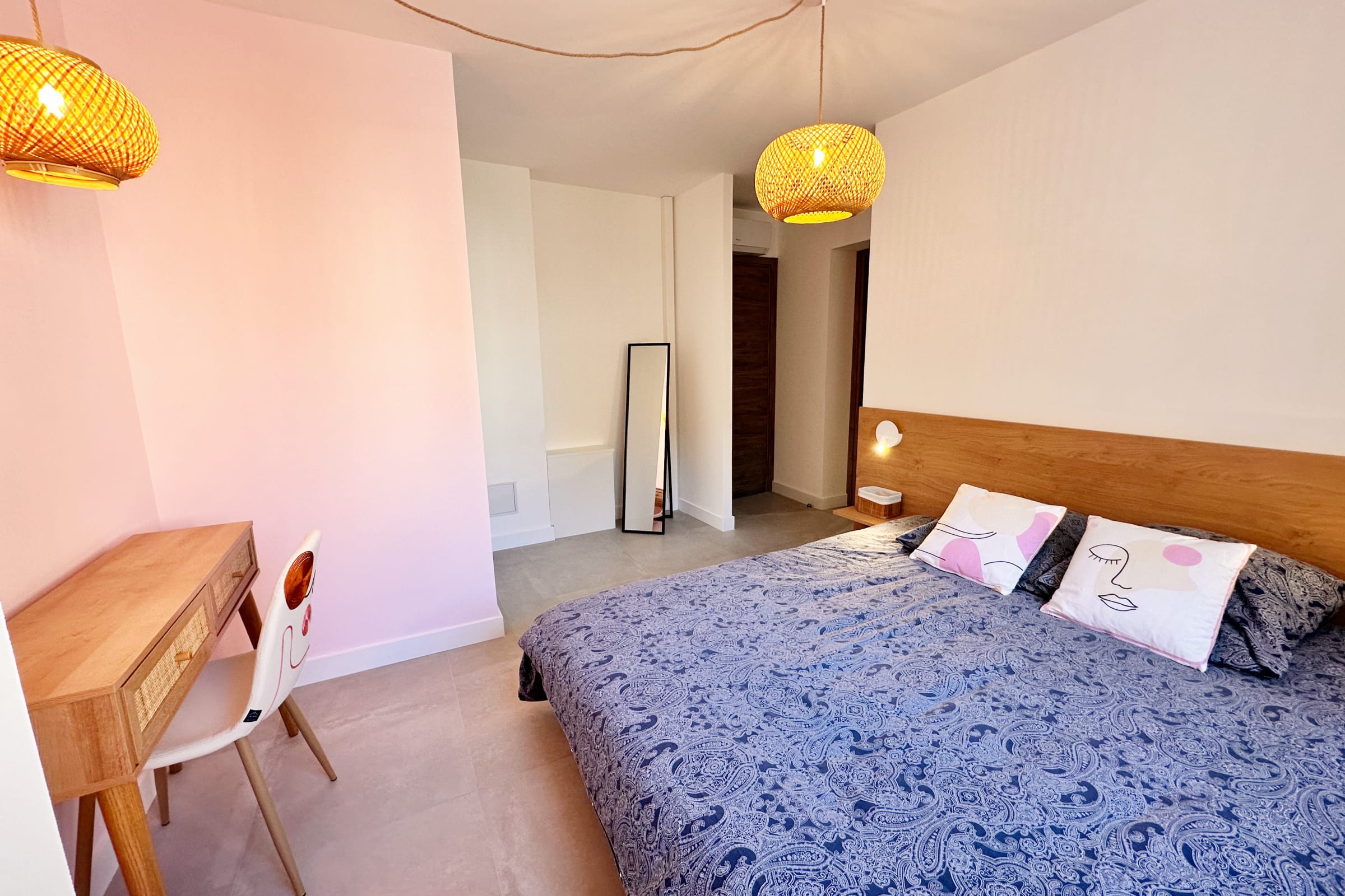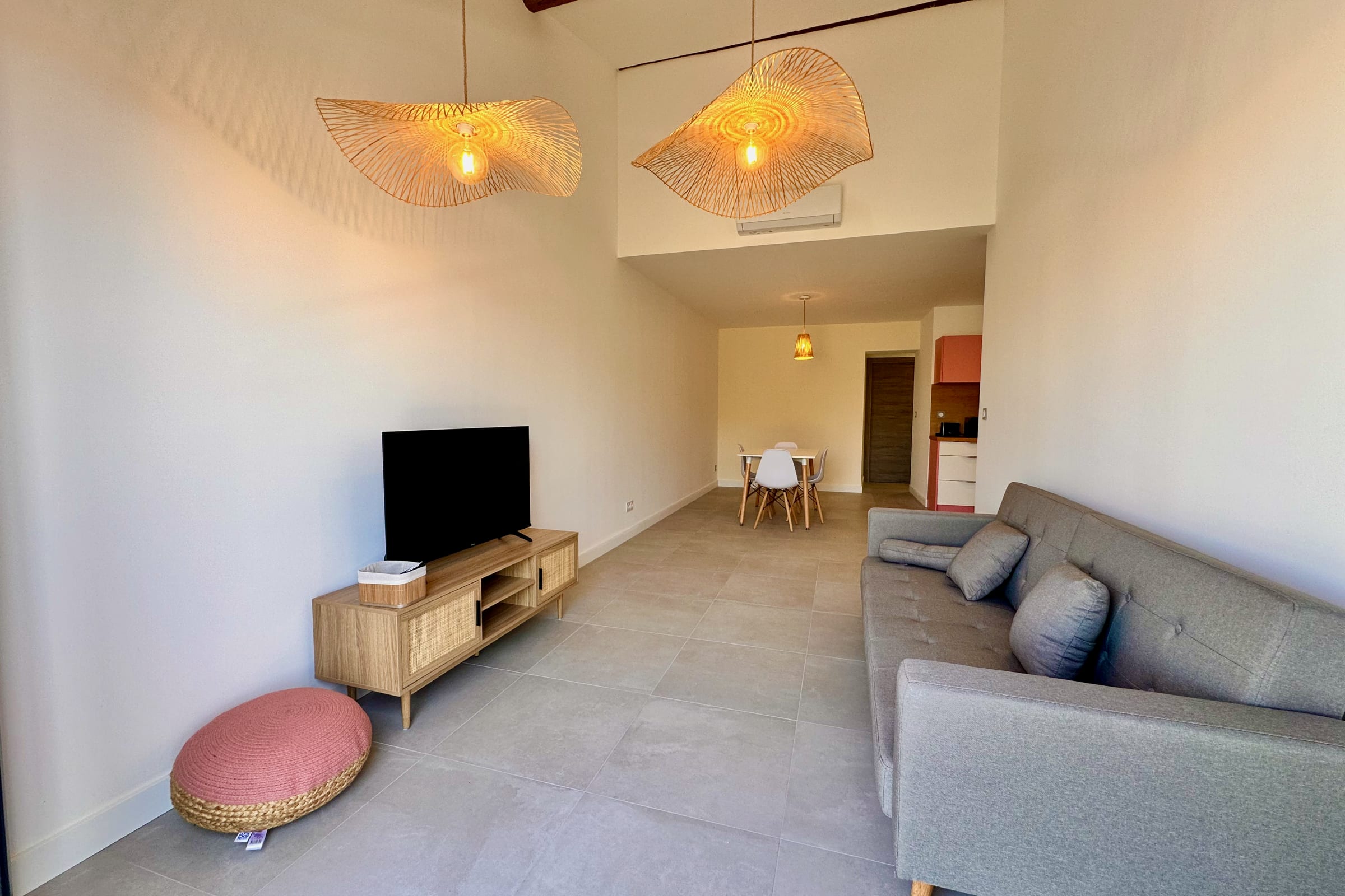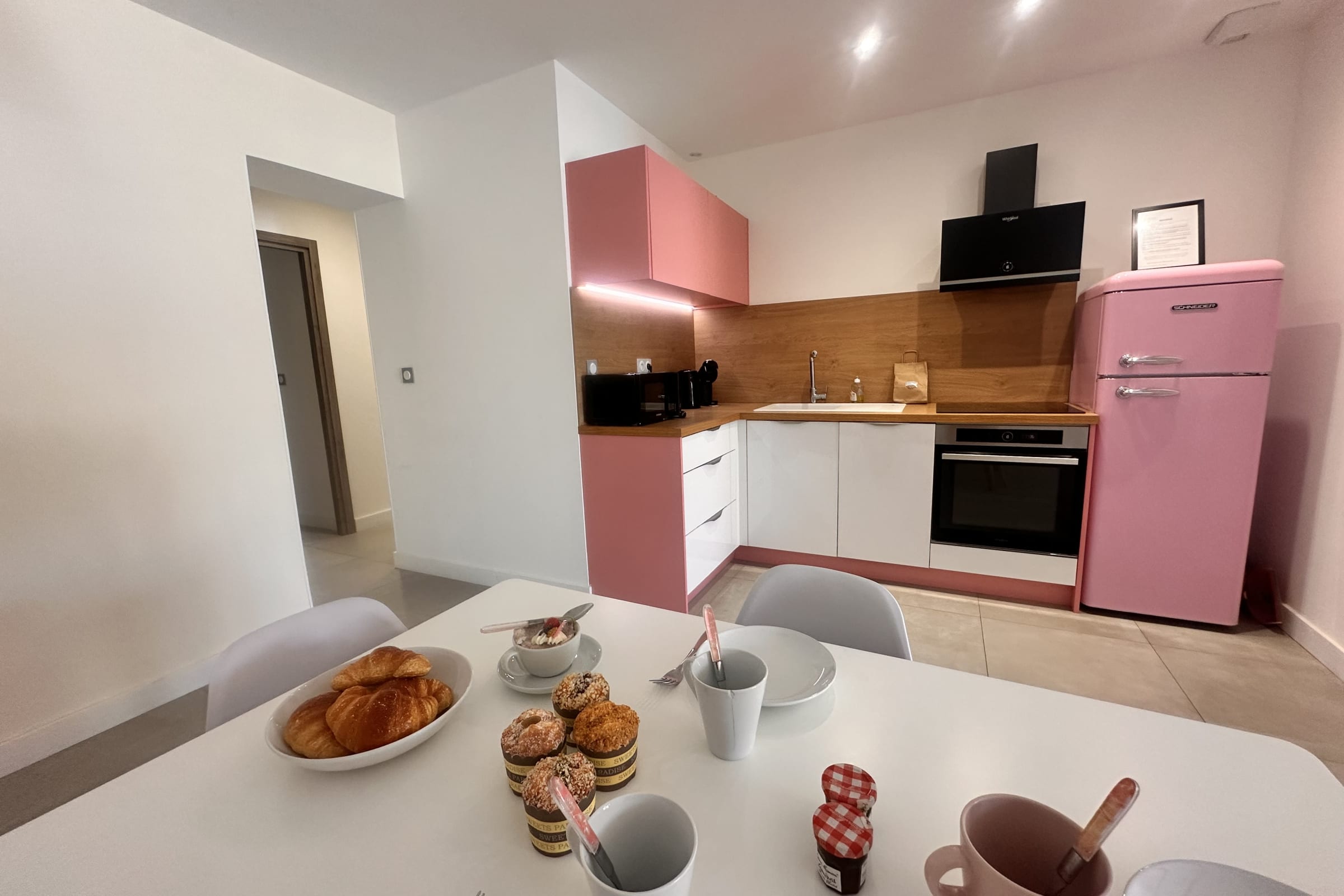 The property has been beautifully renovated with attention to detail. A touch of color during your vacation? You’ll enjoy a lovely living space, with a kitchen in vibrant pink tones that gives it a dynamic look you'll love! The kitchen is fully equipped and has everything you need for your breakfasts and lunches: coffee machine, toaster, kettle, etc. The living area is bright, and the real highlight will be when you discover the stunning view of the Fishing Port from the balcony of the apartment.