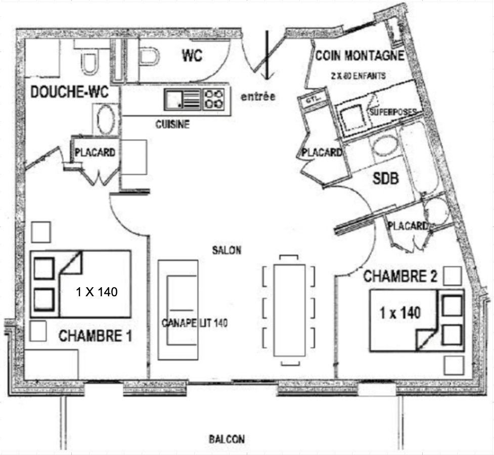 The apartment has a living room with a 140cm sofa bed, a master suite with a 140cm bed and en-suite shower room with WC, a bedroom with a 140cm bed, a cabin with two 90cm bunk beds (NB: the top bunk is not suitable for children under 6), a bathroom and a separate WC.