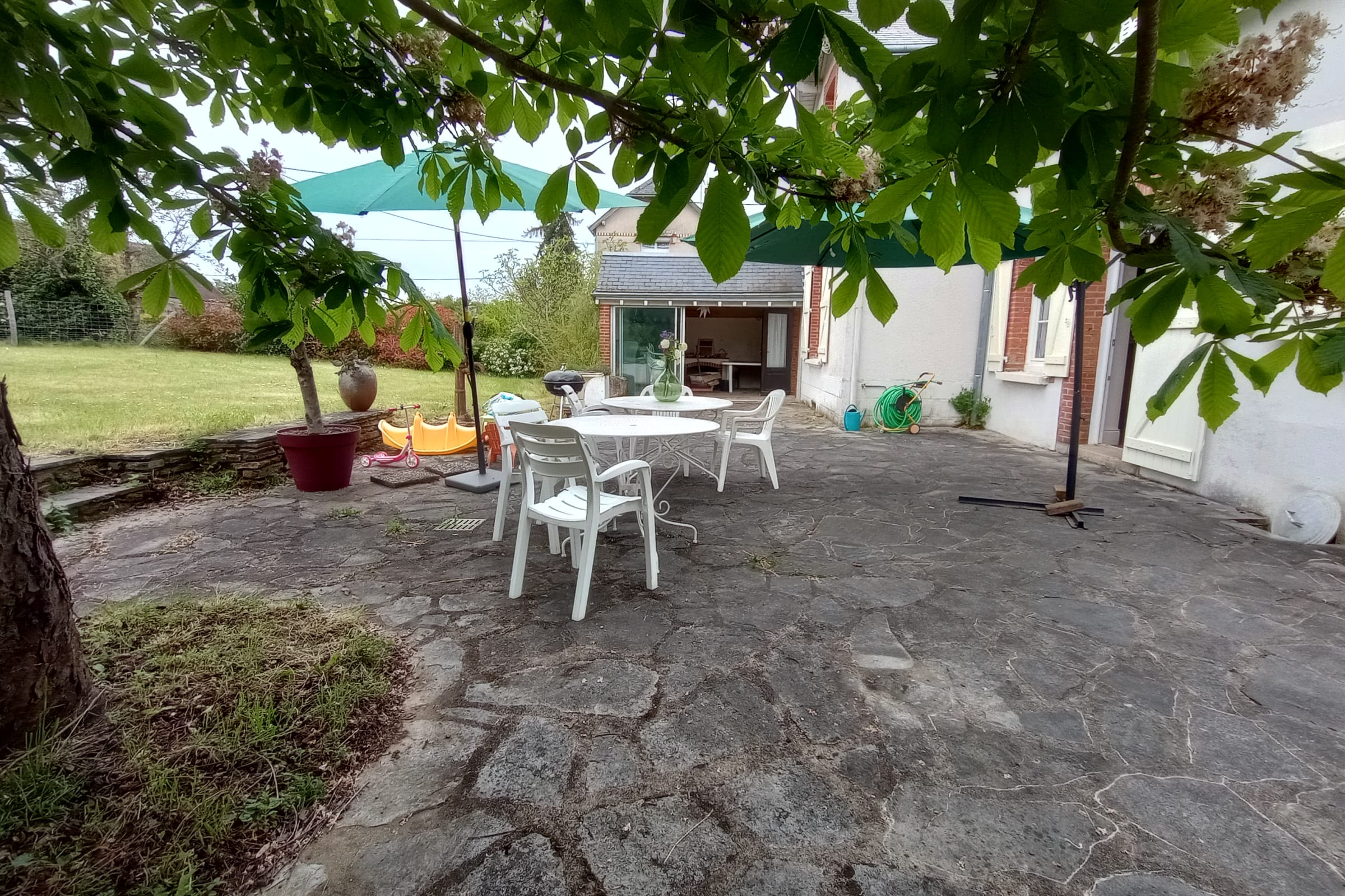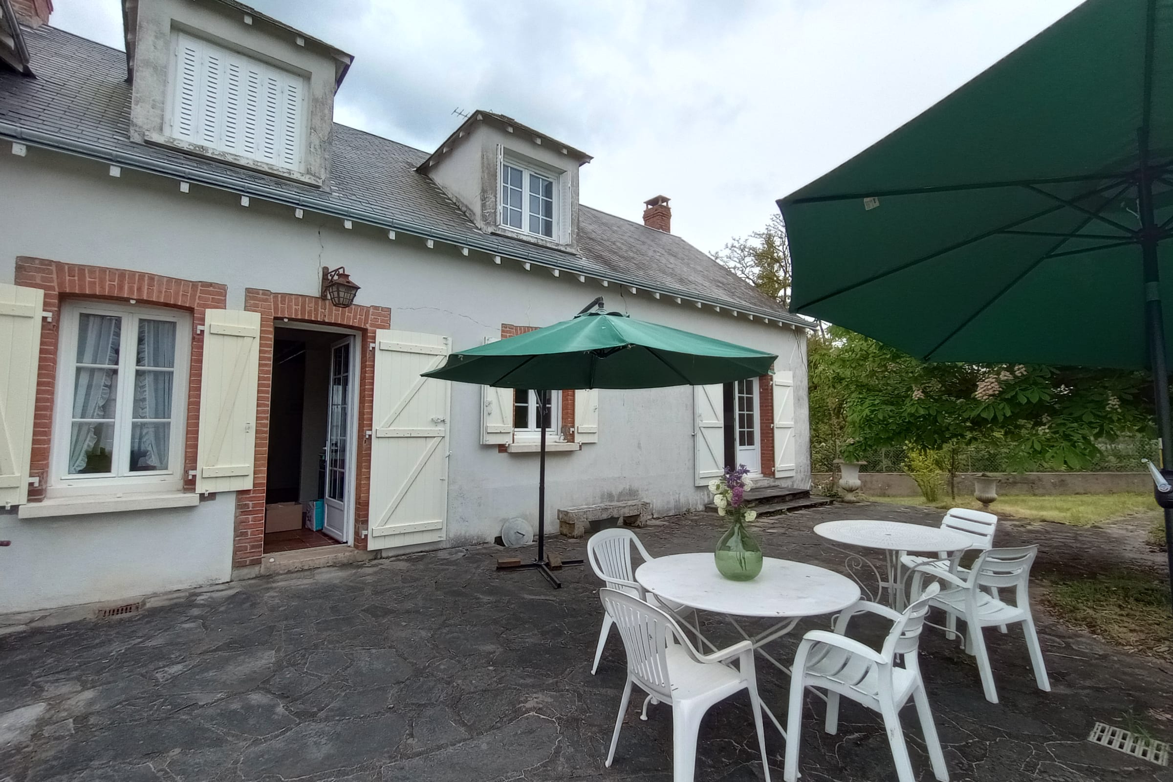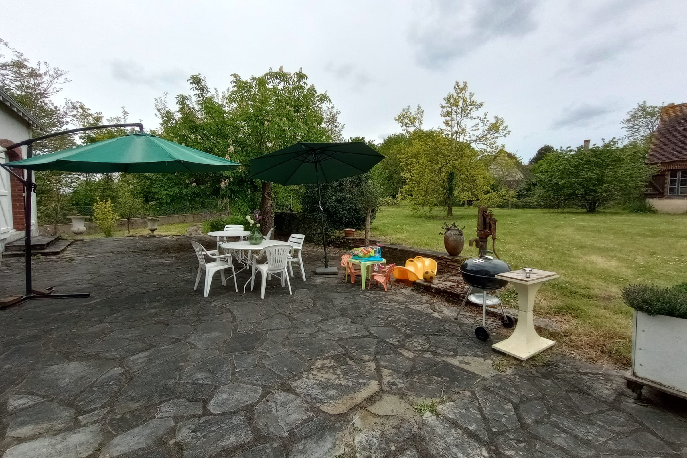 Friendly Outdoor Space: Outdoor table with parasol, barbecue, and a large grassy area perfect for children to play.