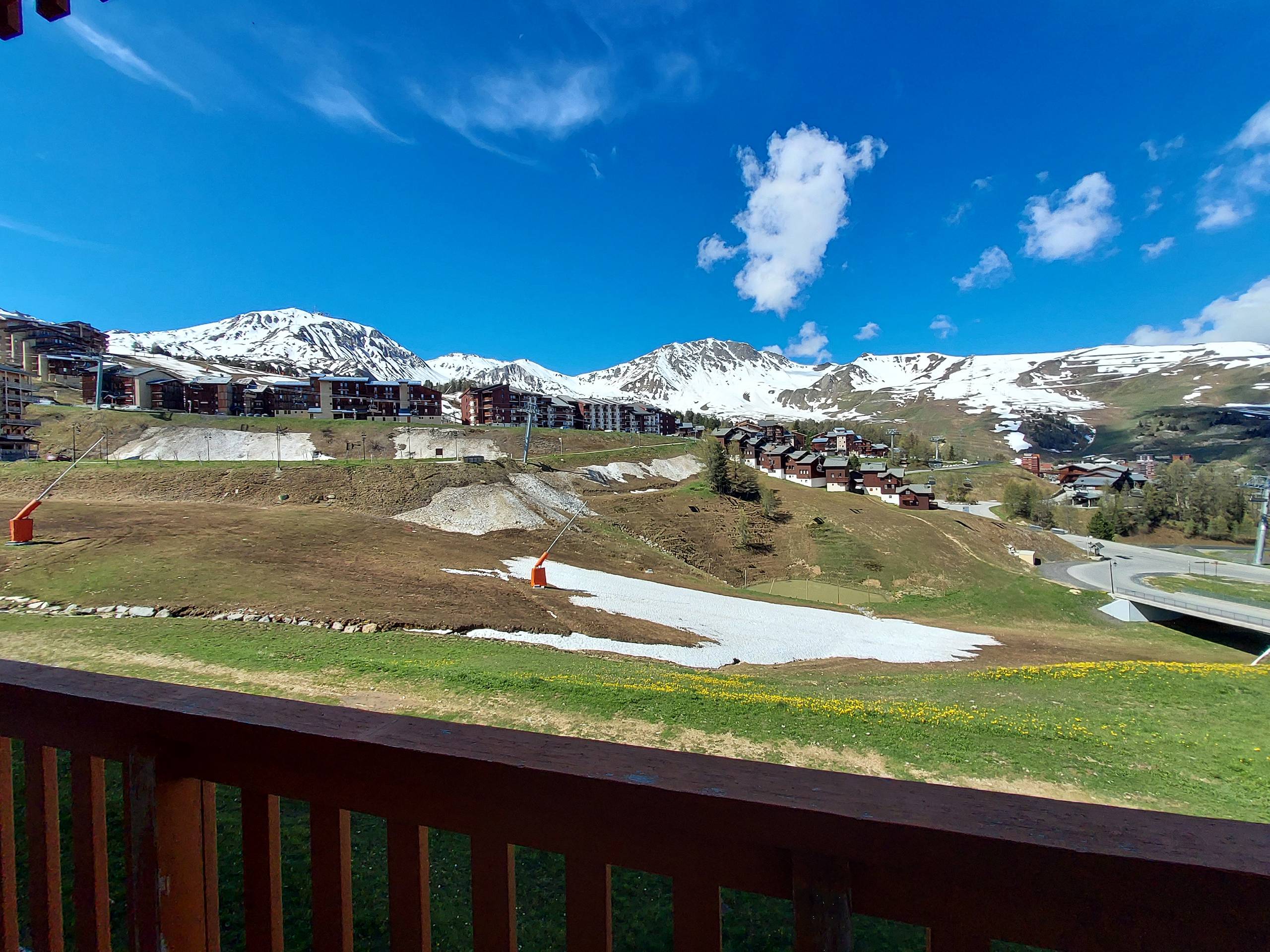 PLAGNE SOLEIL – Residence Mont Soleil A. 3 room apartment with a balcony, facing West, with a south view on the wide blue track that separates Plagne Soleil and Plagne Villages. The residence is located in a peaceful environment, inspired by traditional chalets with wooden facades. It is ski-in, ski-out and close to shops.