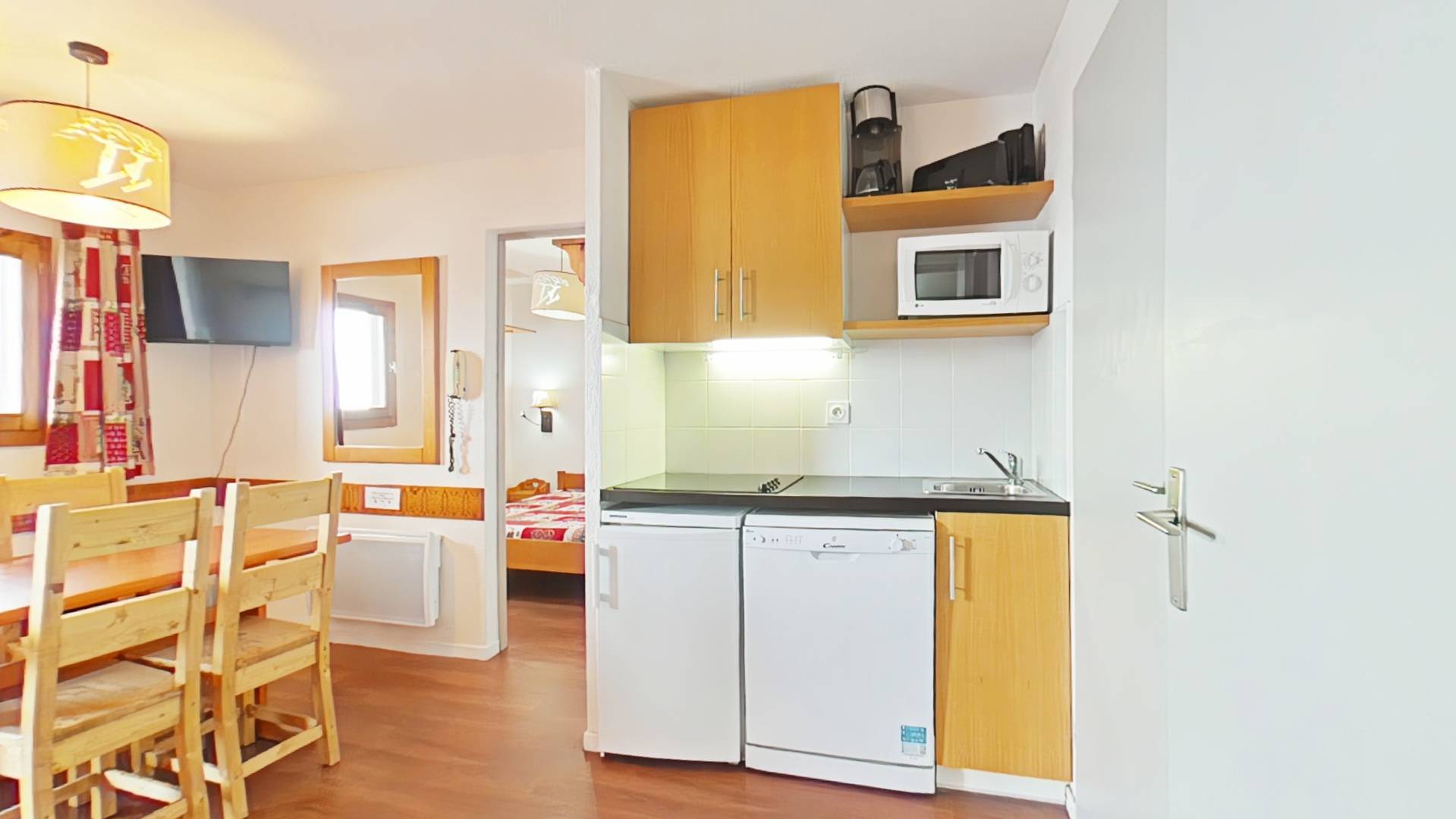 - An open kitchen, equipped with a dishwasher, a refrigerator, a microwave, coffee maker