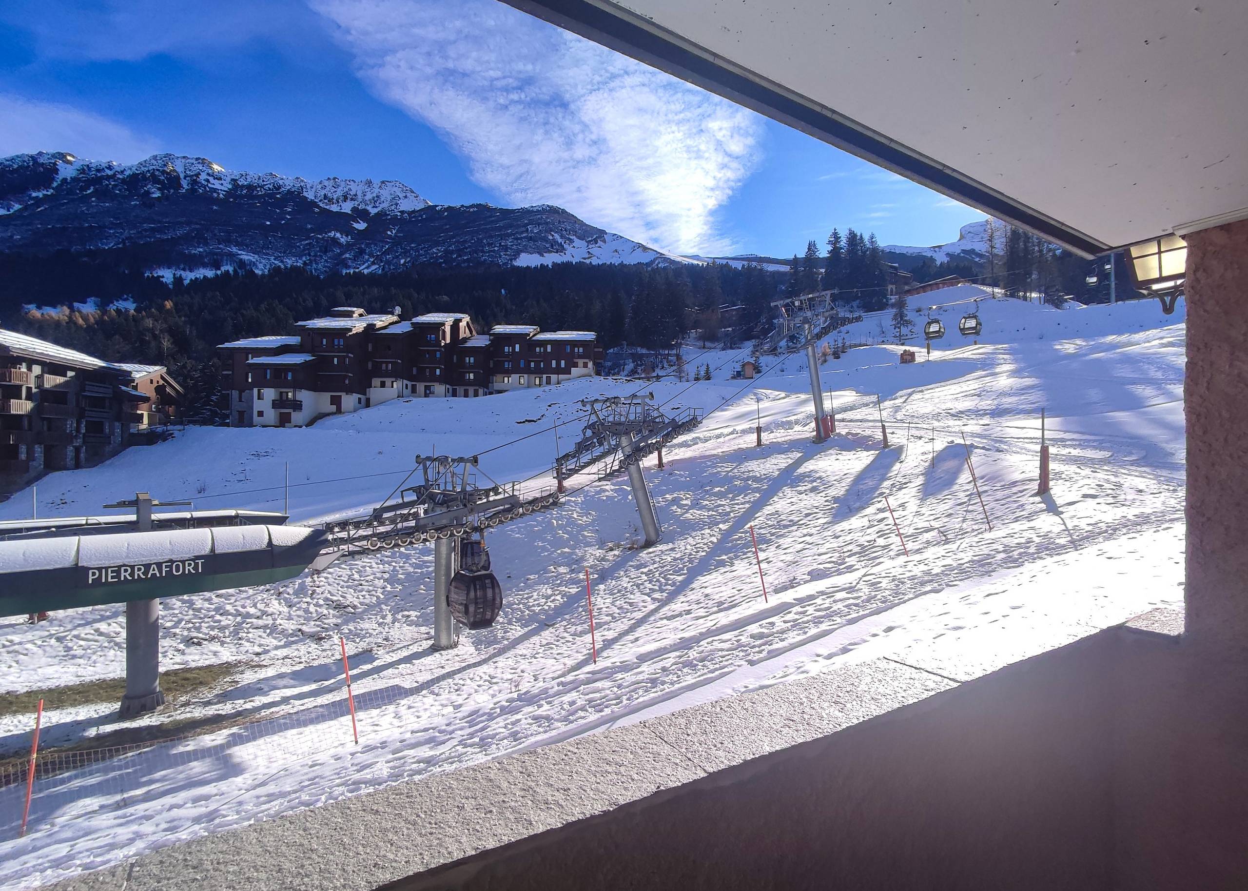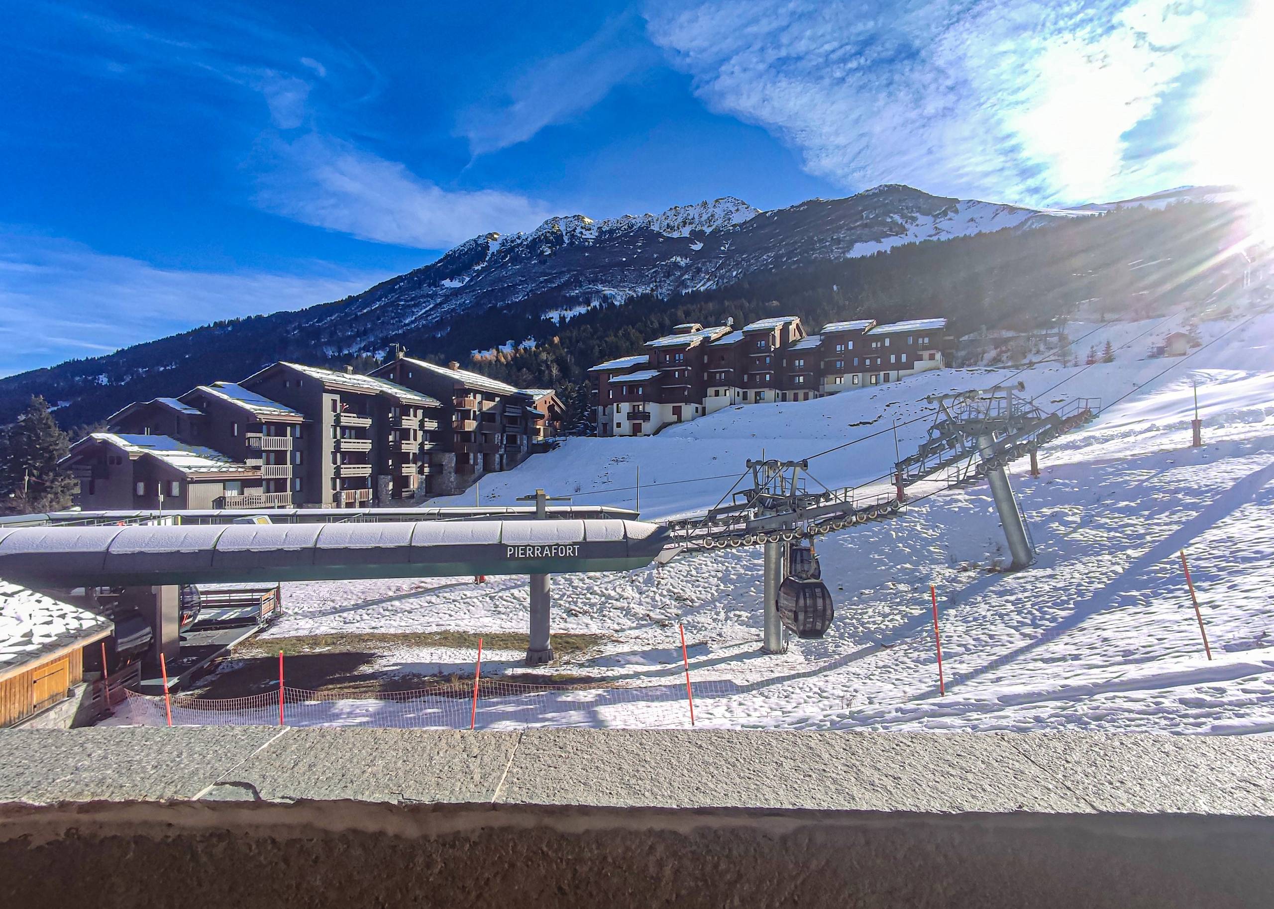 Les Roches Blanches: Charming stone and wood residence on the edge of the piste. The ski departure is via the Pierrafort cable car. The ESF lessons can be reached on foot in less than 5 minutes, or by taking the Télébourg or the free shuttle bus, which also takes you to the resort centre. Shops are just 100 metres away. Pay parking is available in front of the residence.