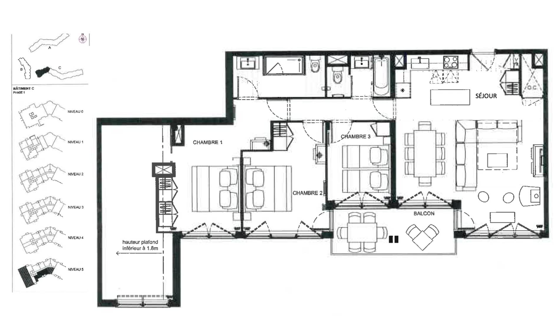 Surface: 110m², 9 persons, on level 5 (from the residence entrance), on the 5th floor (from the main façade) with a lift.