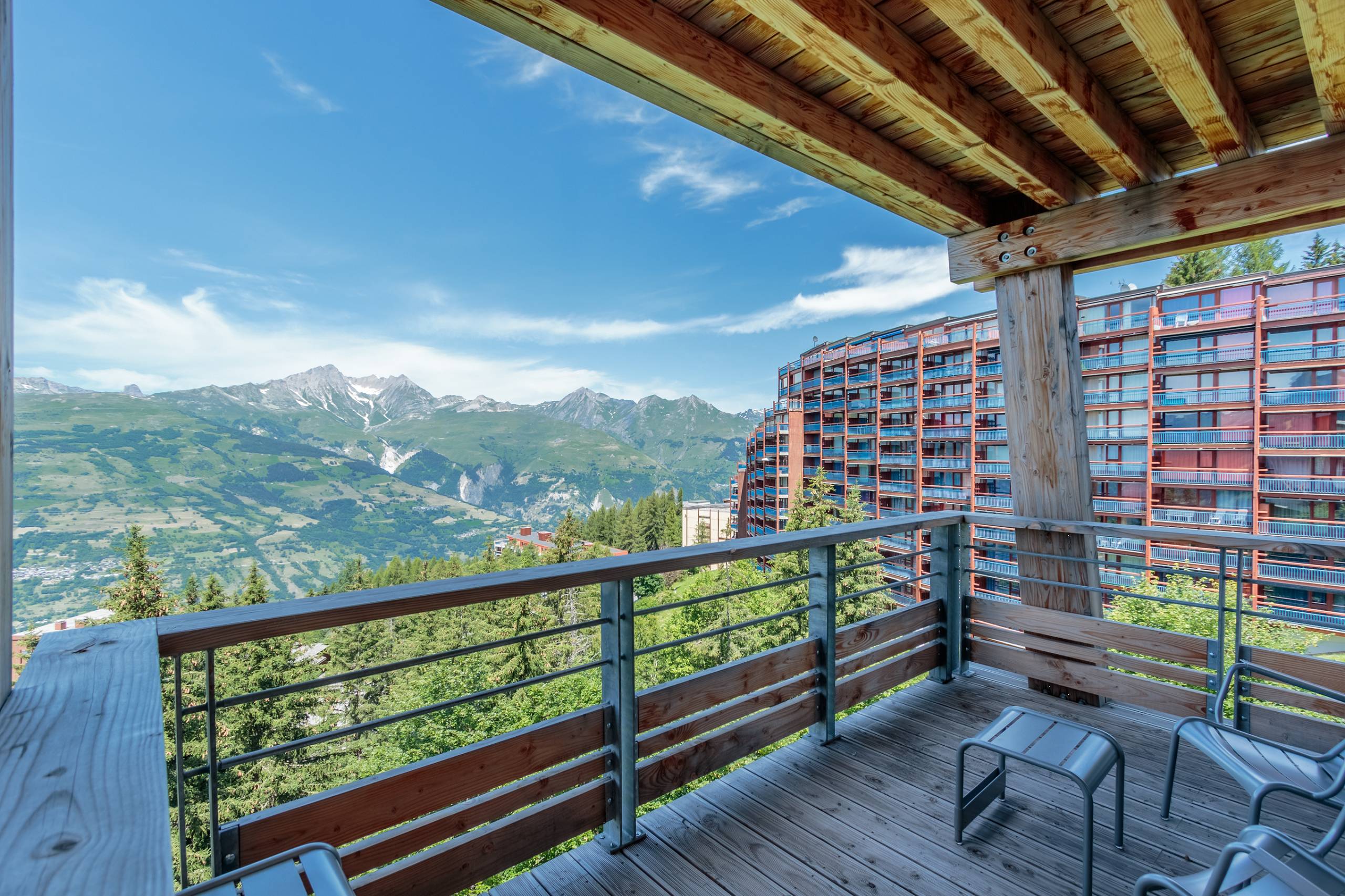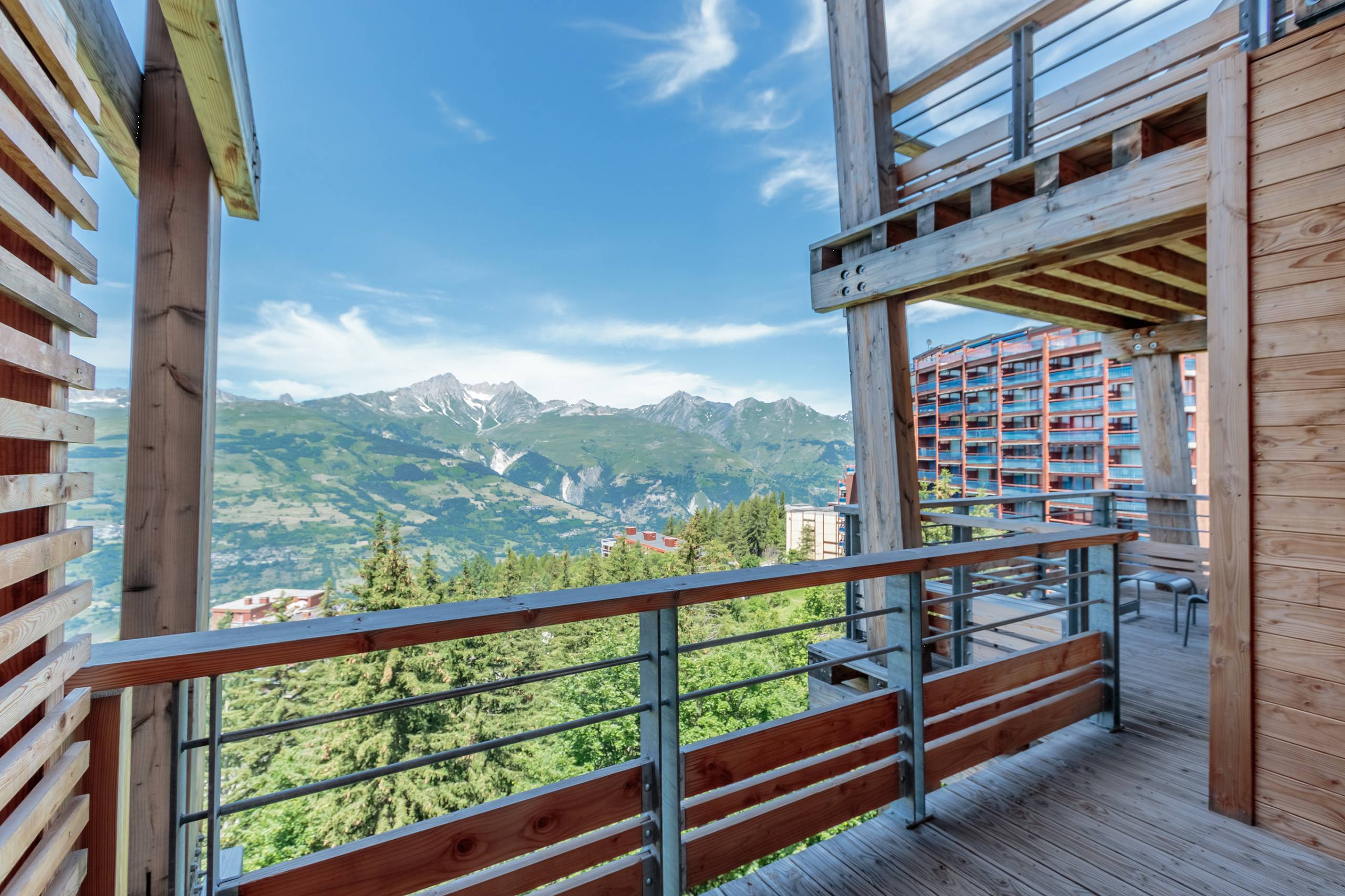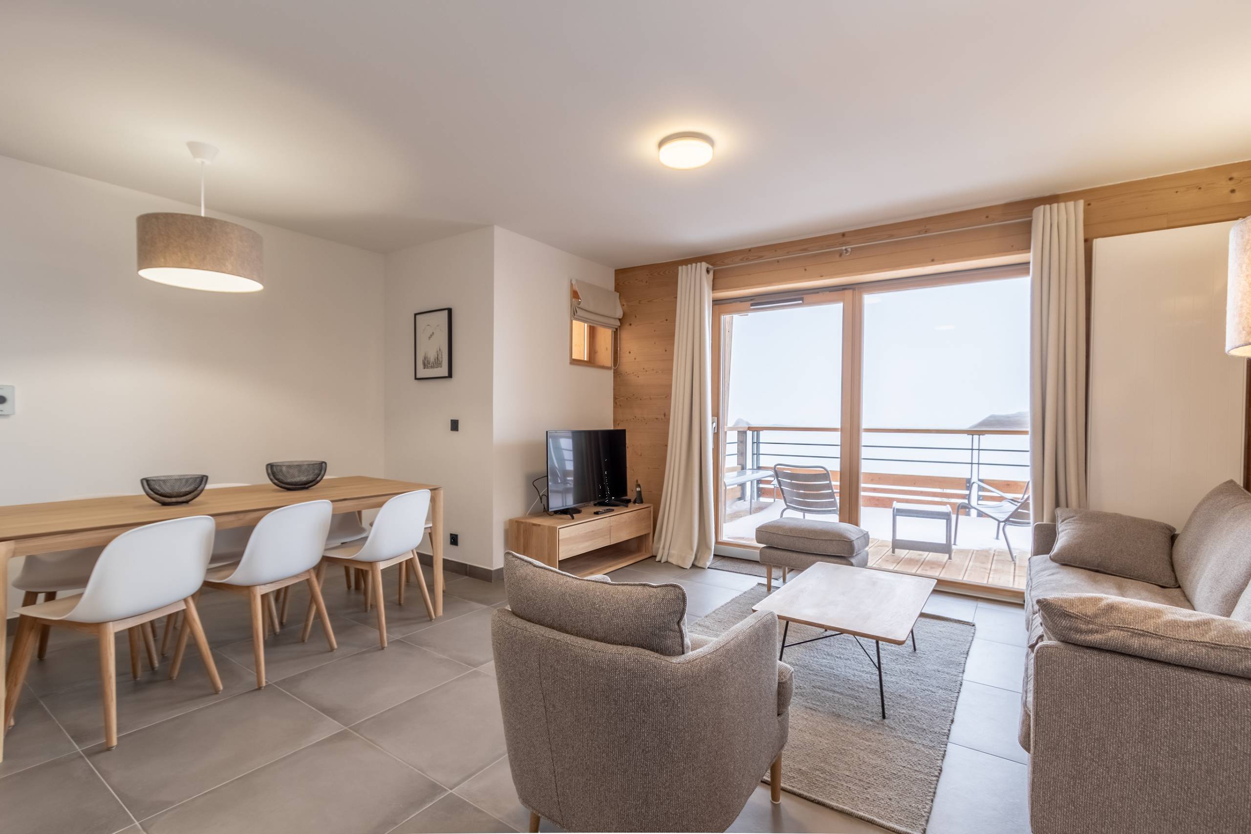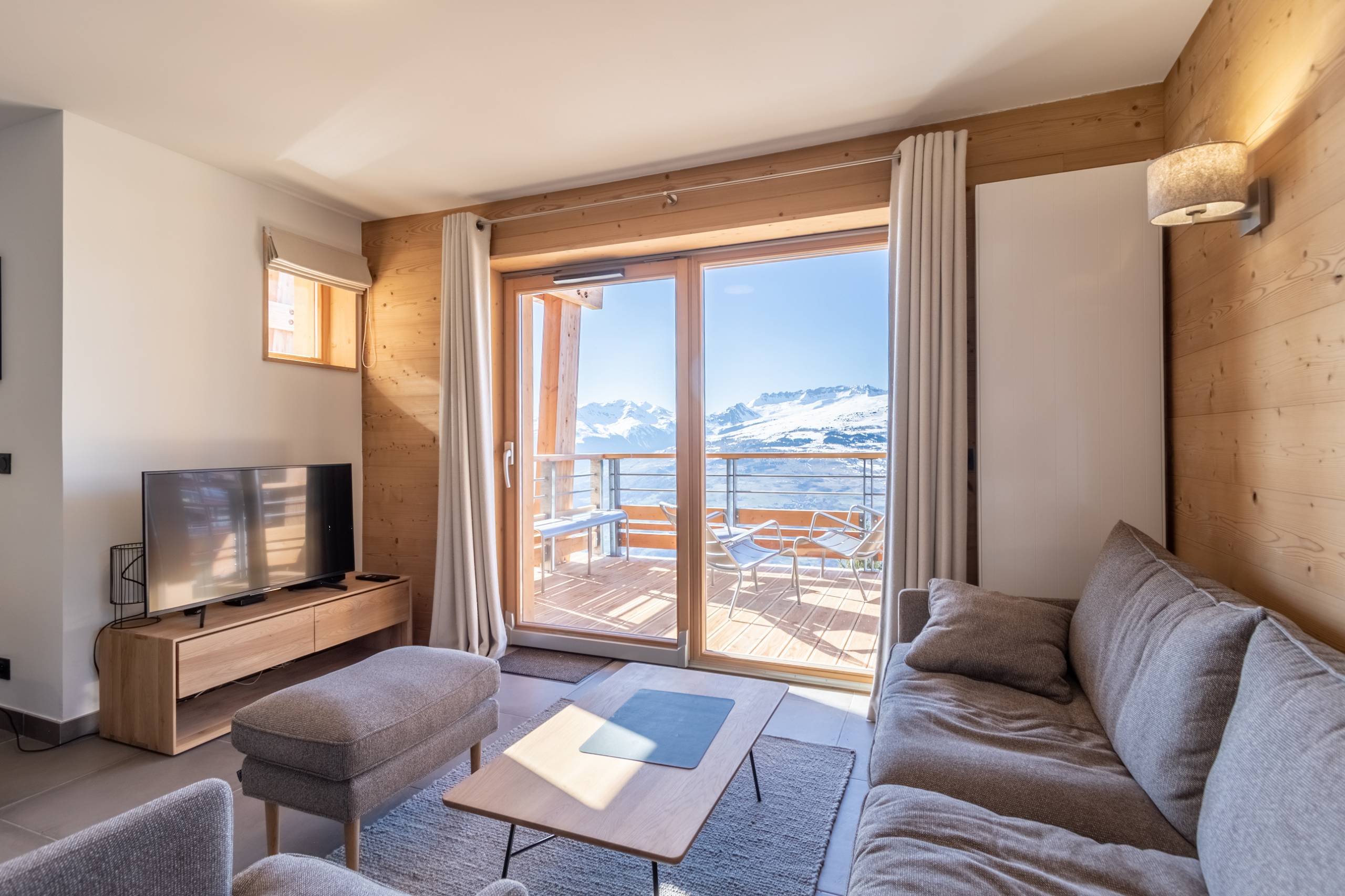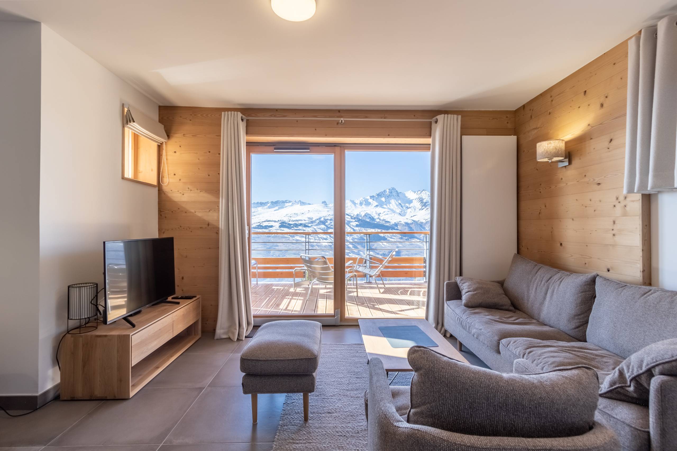 Arcs 1800. It offers high-end comfort and an exceptional panoramic view of the Tarentaise Valley, with a west-facing exposure ideal for enjoying sunsets. Classified 4 Crystals in the Paradiski classification, this property is a guarantee of quality, charm, and comfort. Equipped with a wellness area with sauna, hammam, and fitness room, you will enjoy access to nearby slopes.