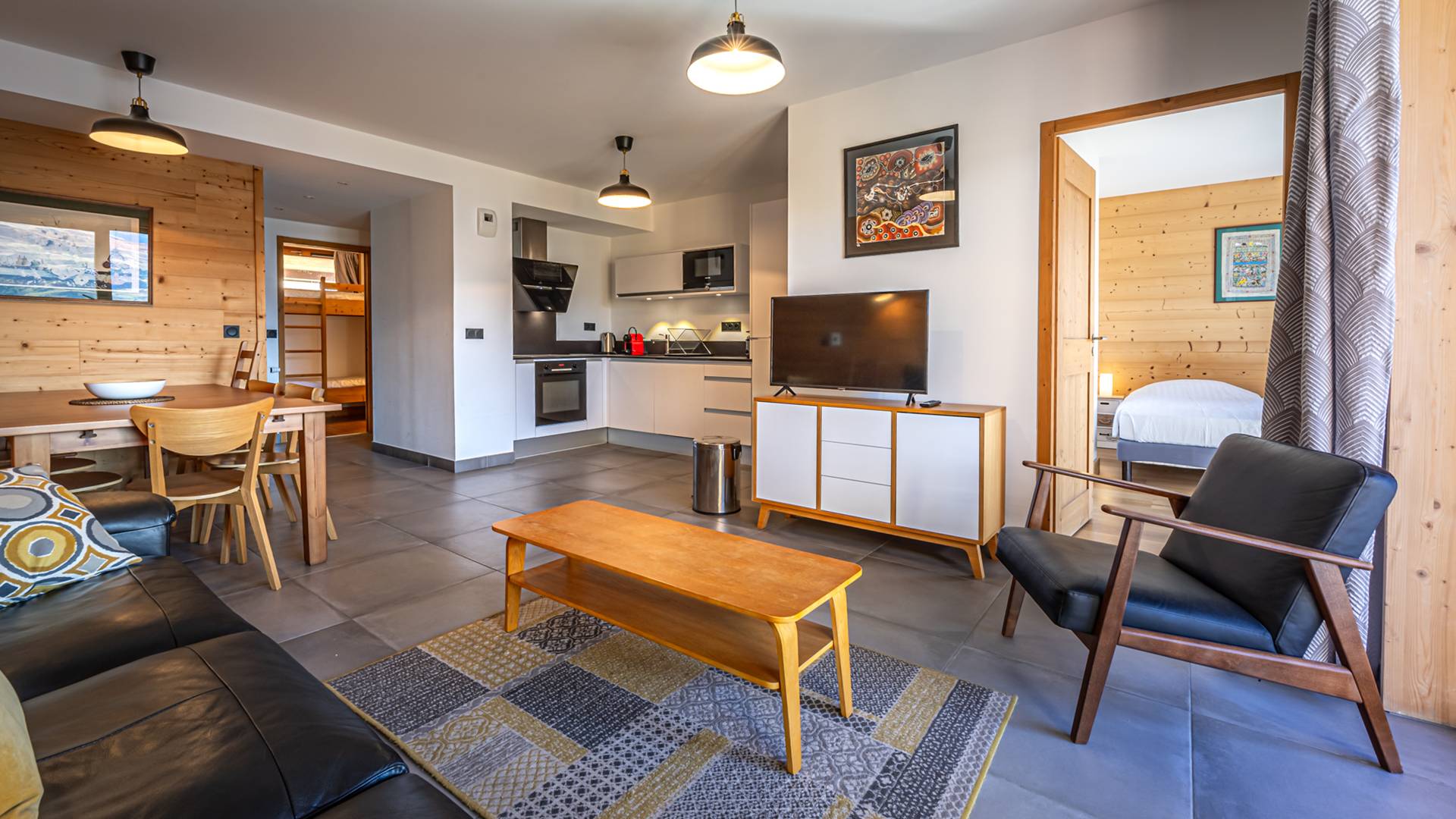 ARCS 1800 - 4* premium Residence : L’ECRIN. Contemporary and wooden atmosphere for this superb 3 room flat + mountain corner, 72 m², spacious, modern and bright, for 6 people offering a magnificent view on the Tarentaise valley. Facing west. Very recent and luxury residence with hotel services, with its wellness area: sauna, hammam and fitness room.