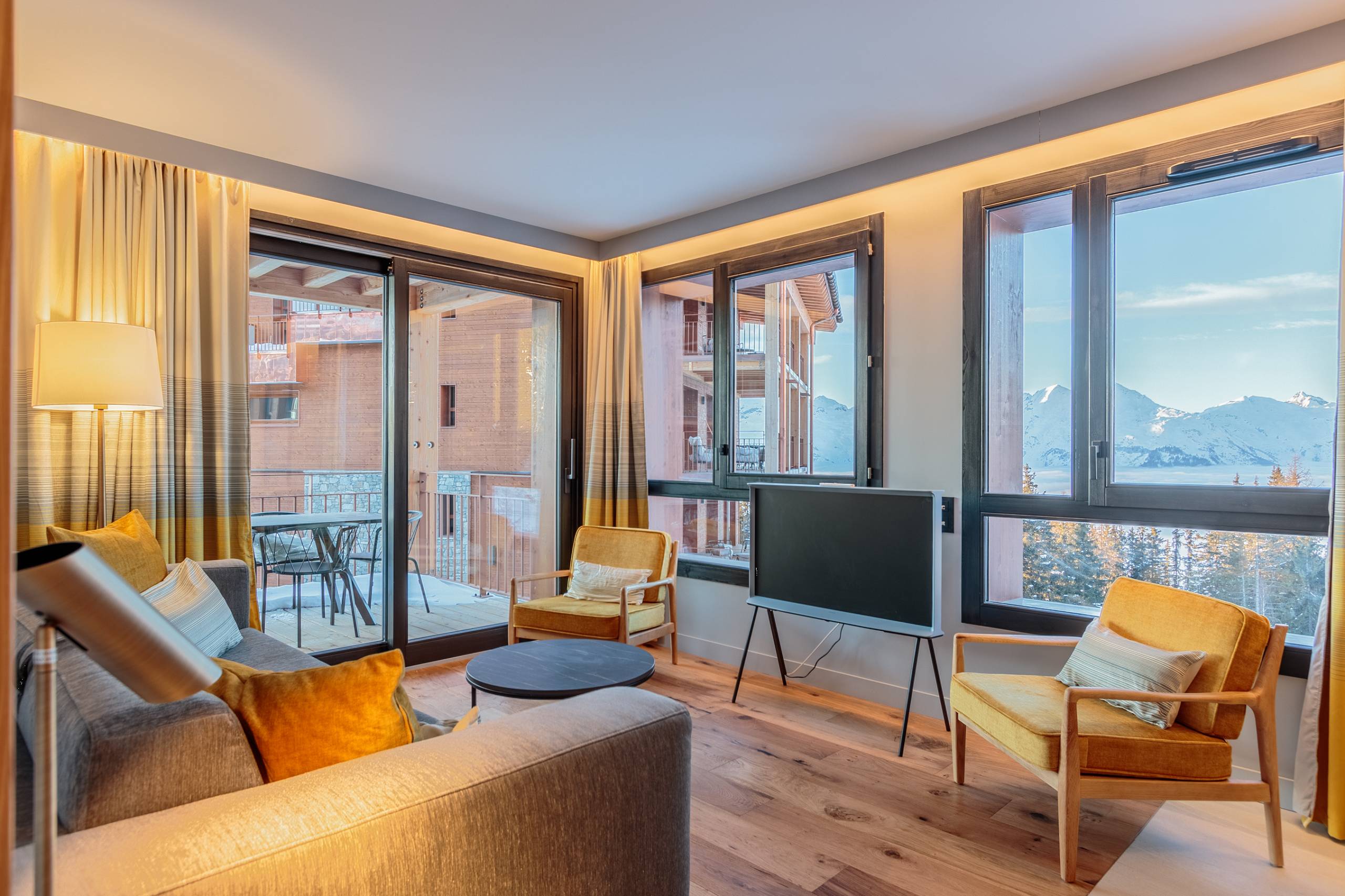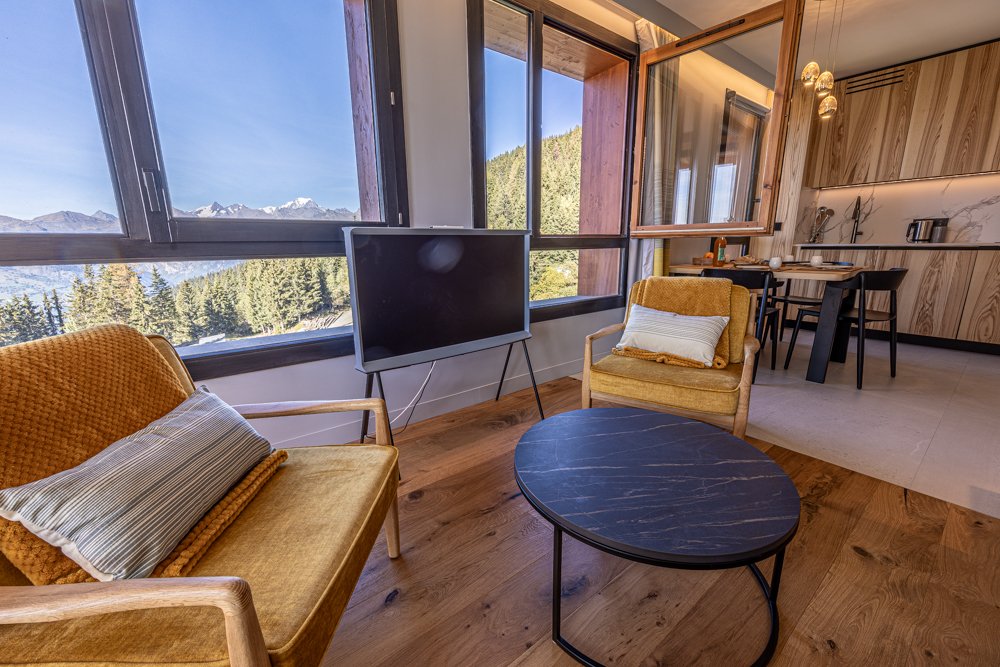 Brand NEW 64 m² apartment for 6 people, with 2 bedrooms + 1 mountain corner and 1 large WEST-facing TERRACE with a magnificent PANORAMIC VIEW of Mont Blanc. Chic and contemporary decoration!