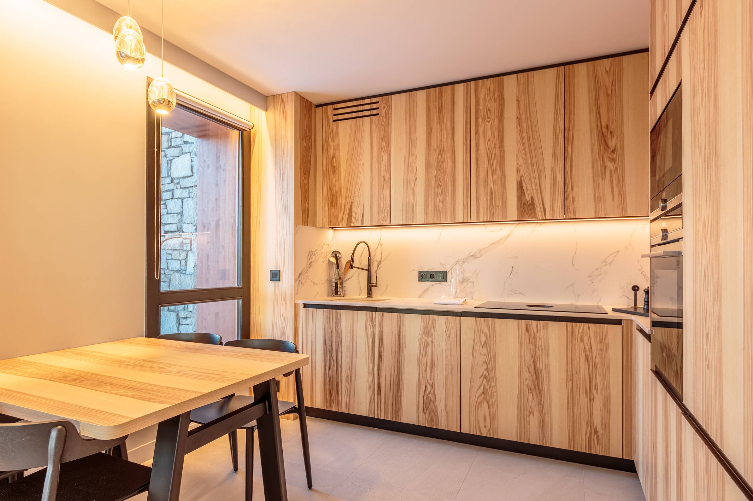 - Fully equipped kitchen open to the living room: oven, microwave, percolator-type coffee machine, Italian coffee maker, kettle, toaster, induction hob, extractor hood. Open to the living room with a large dining table and terrace access.