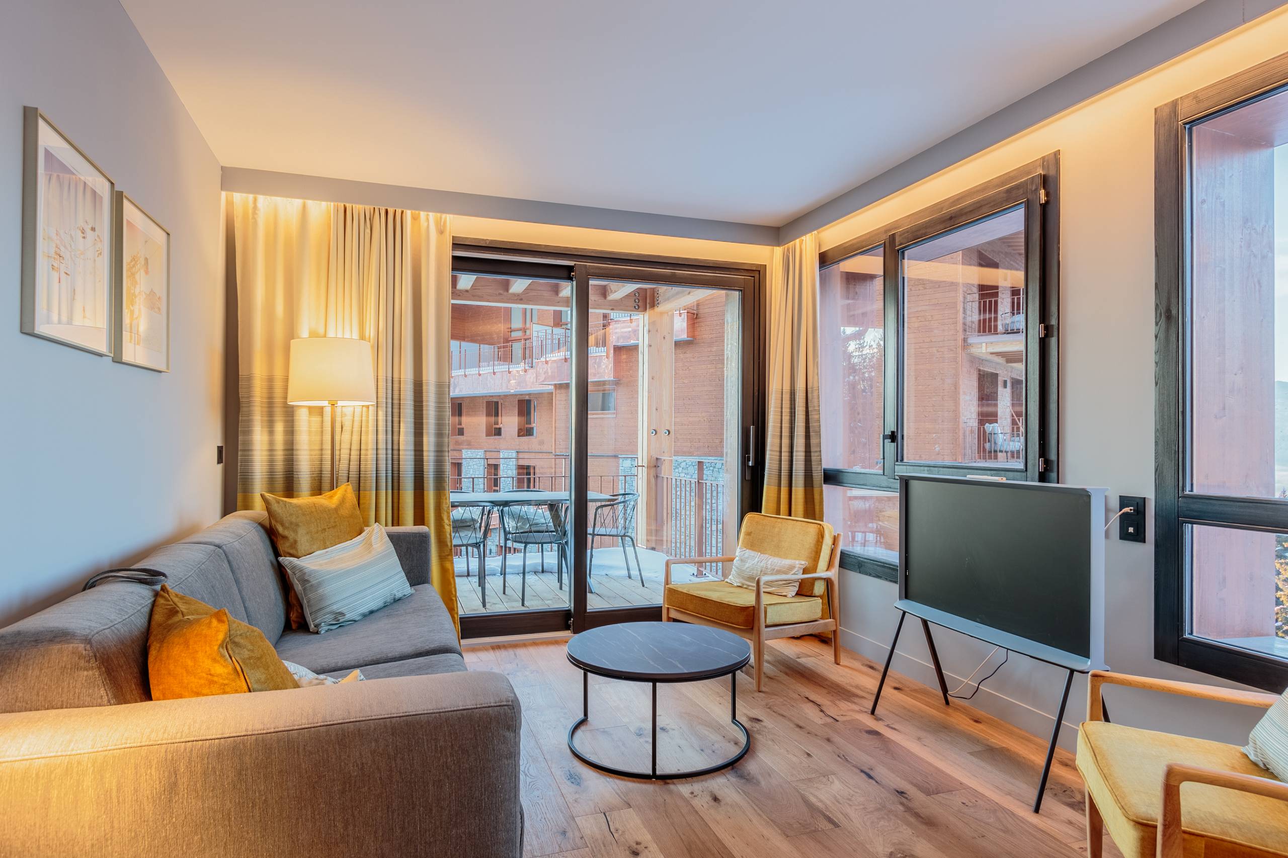 - Living room with terrace access: sofa, 2 armchairs, TV
