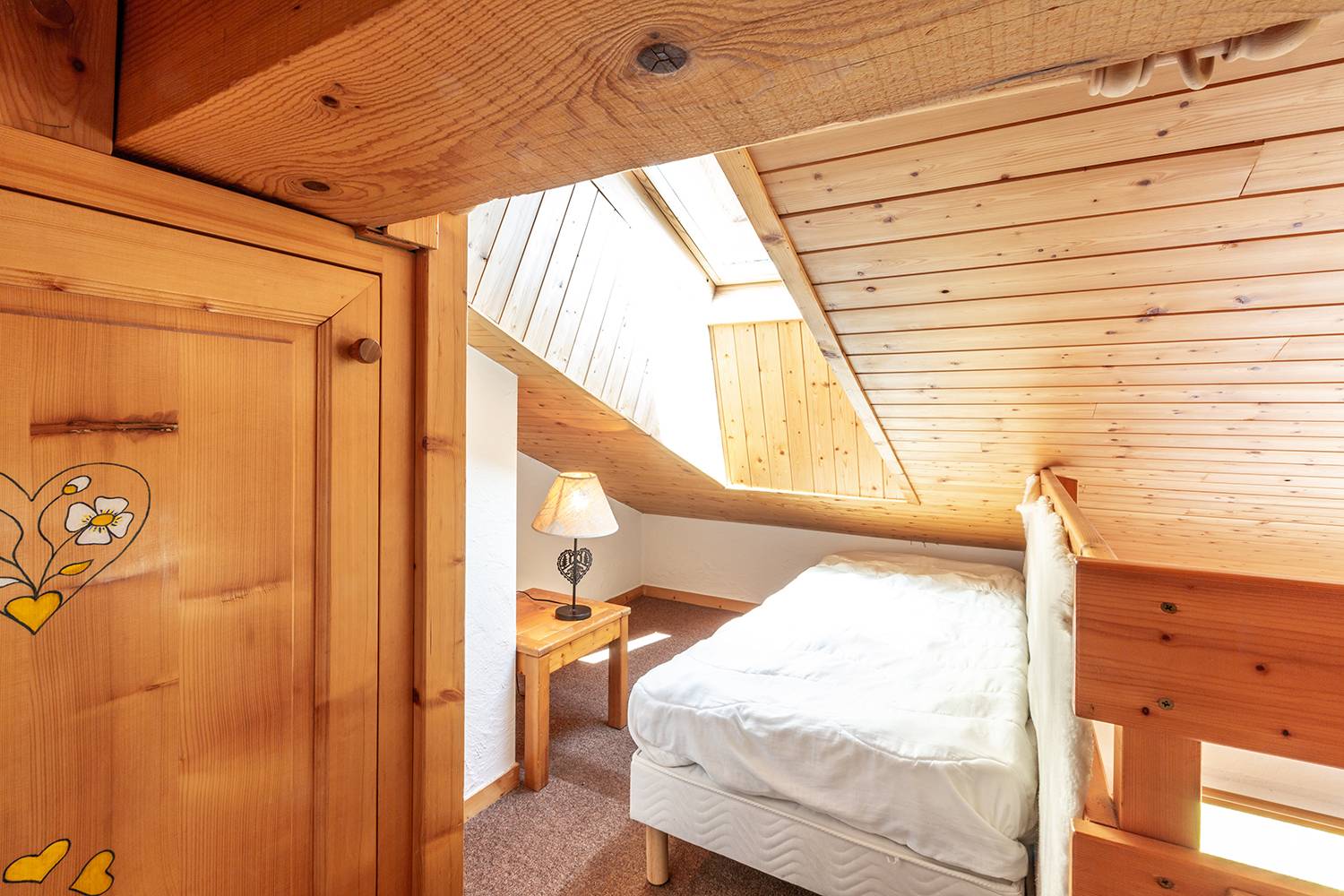 Living room equipped with a television and extended by a corner balcony. One bedroom with 1 double bed (140x190). Shower room and wc. Kitchen equipped with electric hob, oven, microwave, dishwasher, refrigerator, coffee maker, kettle, toaster. Mezzanine with 1 single bed and 1 pull out bed (80x190). Bedroom with a double bed (140x190). Cabine-room with a single bed and a mezzanine bed (80x190). Bathroom and separate wc. Ski locker and closed garage. 3rd floor without lift. Non-smoking apartment / Pets forbidden.
