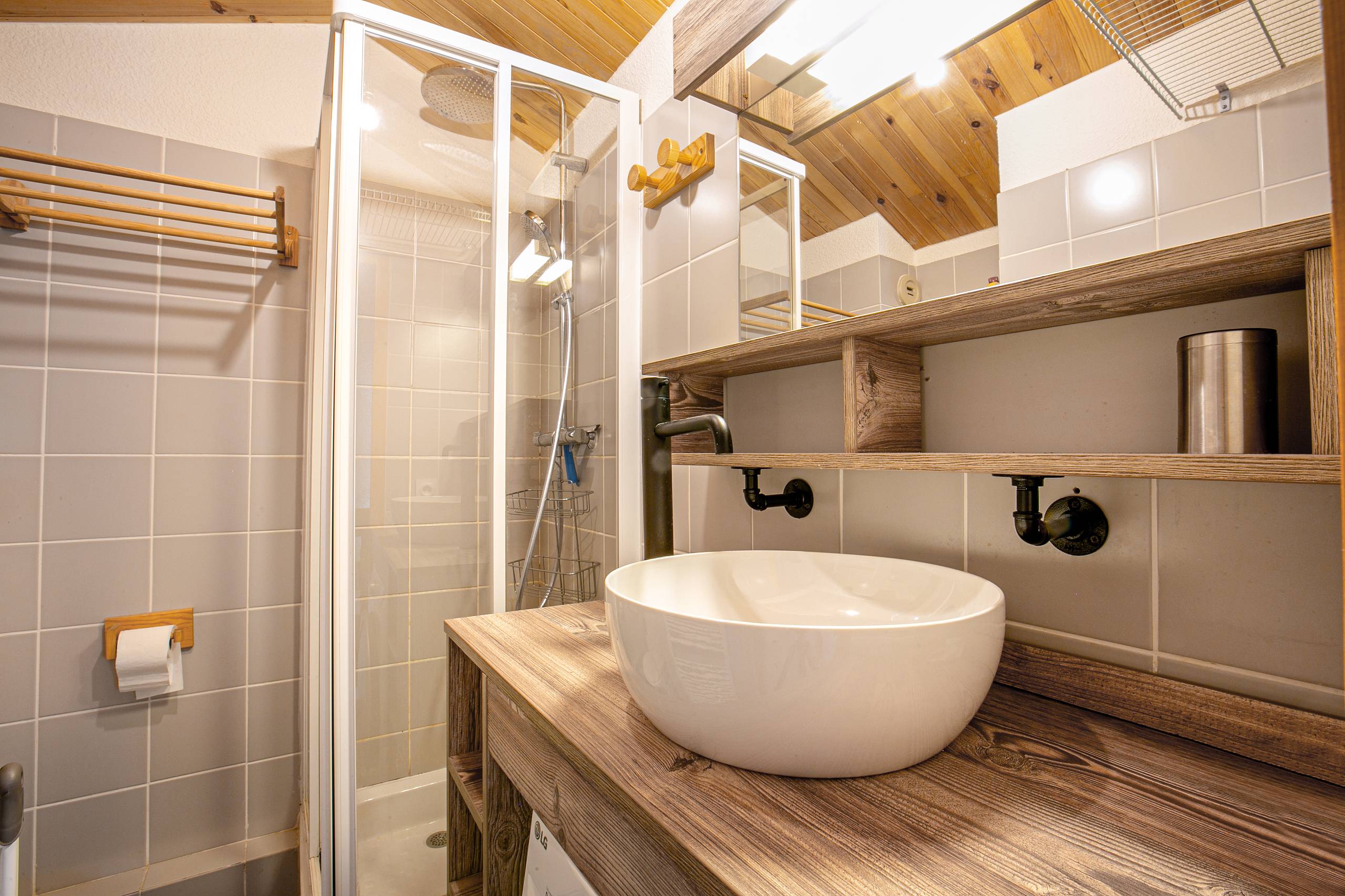 In the living room there is a sofa bed with pull-out bed (80x190) and a TV. The kitchen is equipped with an oven, microwave, extractor hood, fridge, dishwasher, coffee maker, toaster and kettle. Next to the entrance there is a cabin bedroom with a set of bunk beds (90x190). A shower room with wc. Upstairs, there is a bedroom with a double bed (140x190), a mezzanine with a single bed and a pull-out bed (90x190) and a Shower room with wc and washing machine. Balcony, South orientation, ski locker in the residence. Non-smoking apartment. 3rd floor. Pets forbidden.