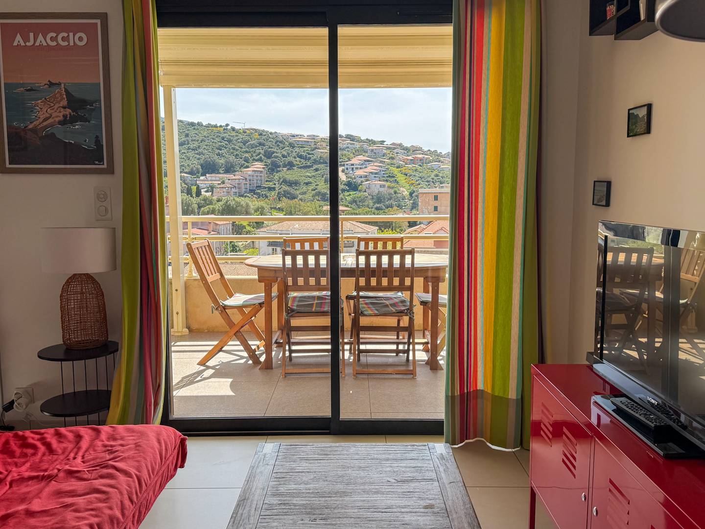 A pleasant terrace with outdoor lounge offering views of the city and the sea.