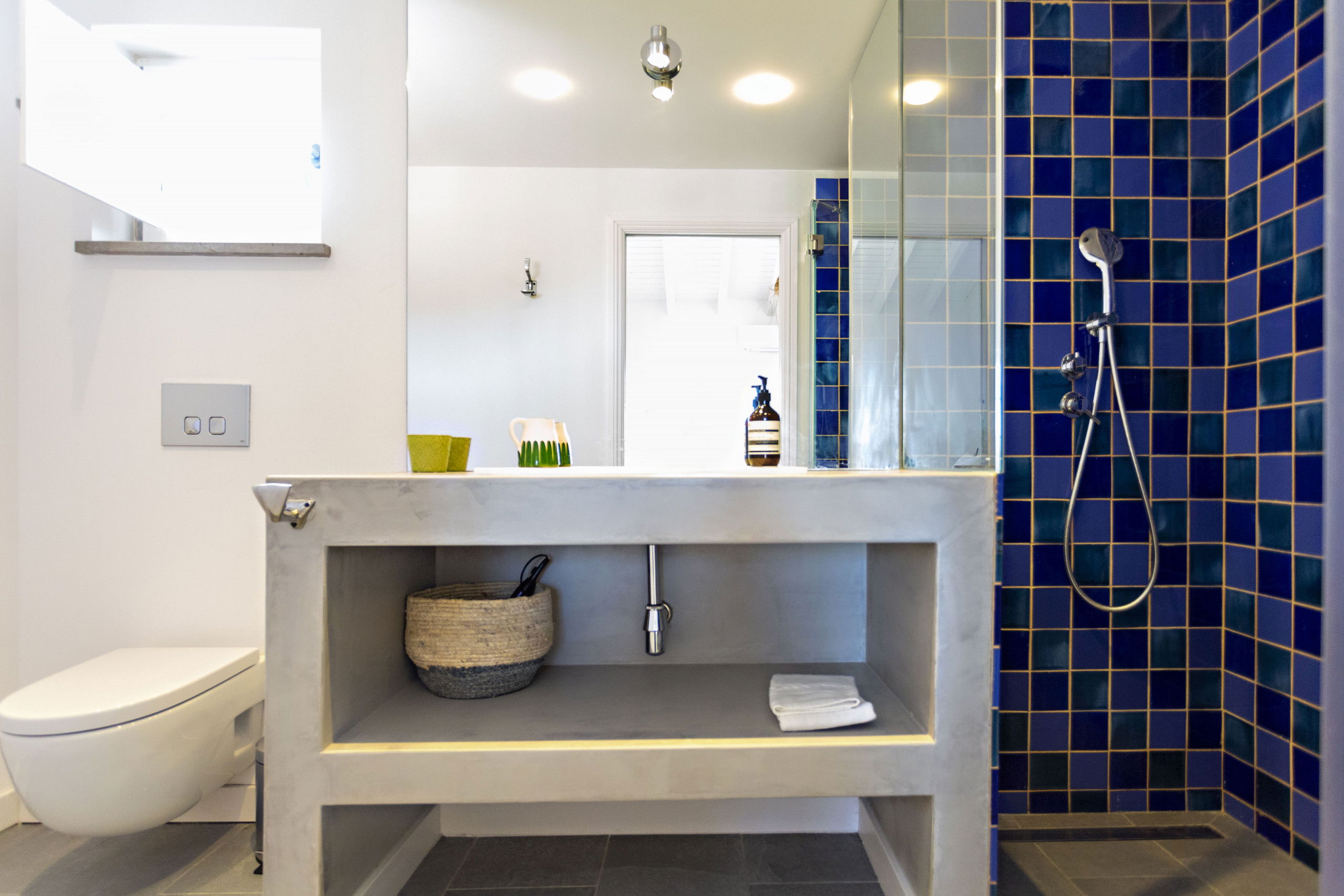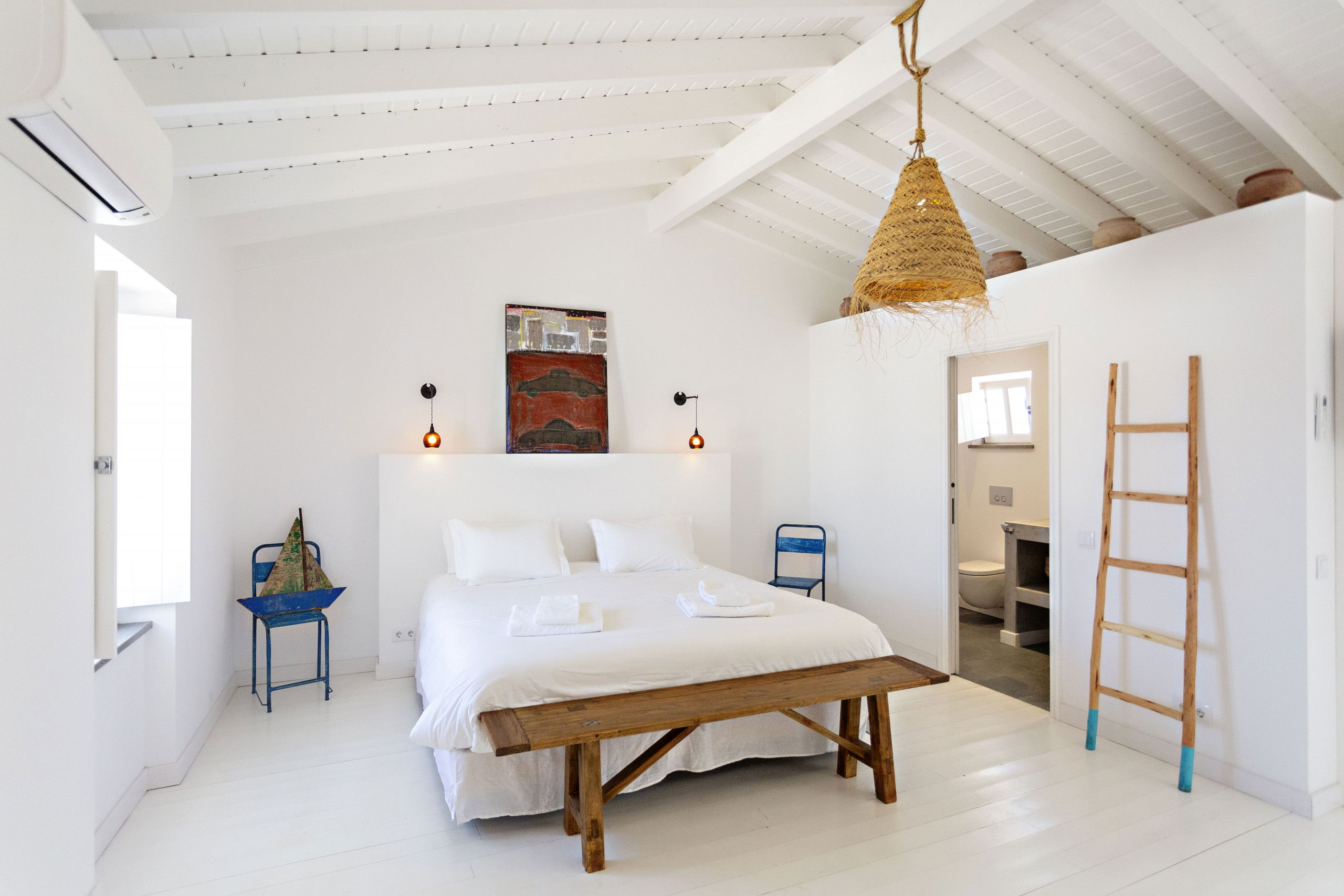 A very bright master bedroom with king size bed, walk-in closet and full bathroom with large shower. The bedroom offers a double exposure and overlooks the second terrace, overlooking the garden, the pool and the old town of Tavira. Ideal to enjoy a beautiful sunset.