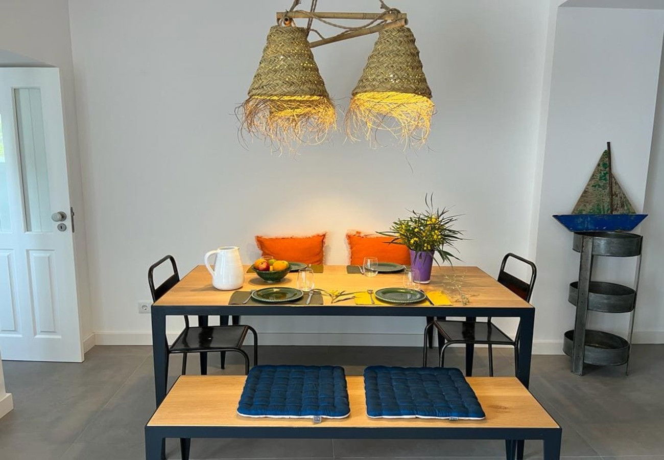 - A large and bright room, consisting of a living room (sofa, armchairs, TV), dining room and fully equipped open kitchen (dishwasher, Nespresso coffee machine, oven, ceramic hob, toaster…) which opens onto a terrace where you can have your meals with direct access to the garden and the swimming pool.