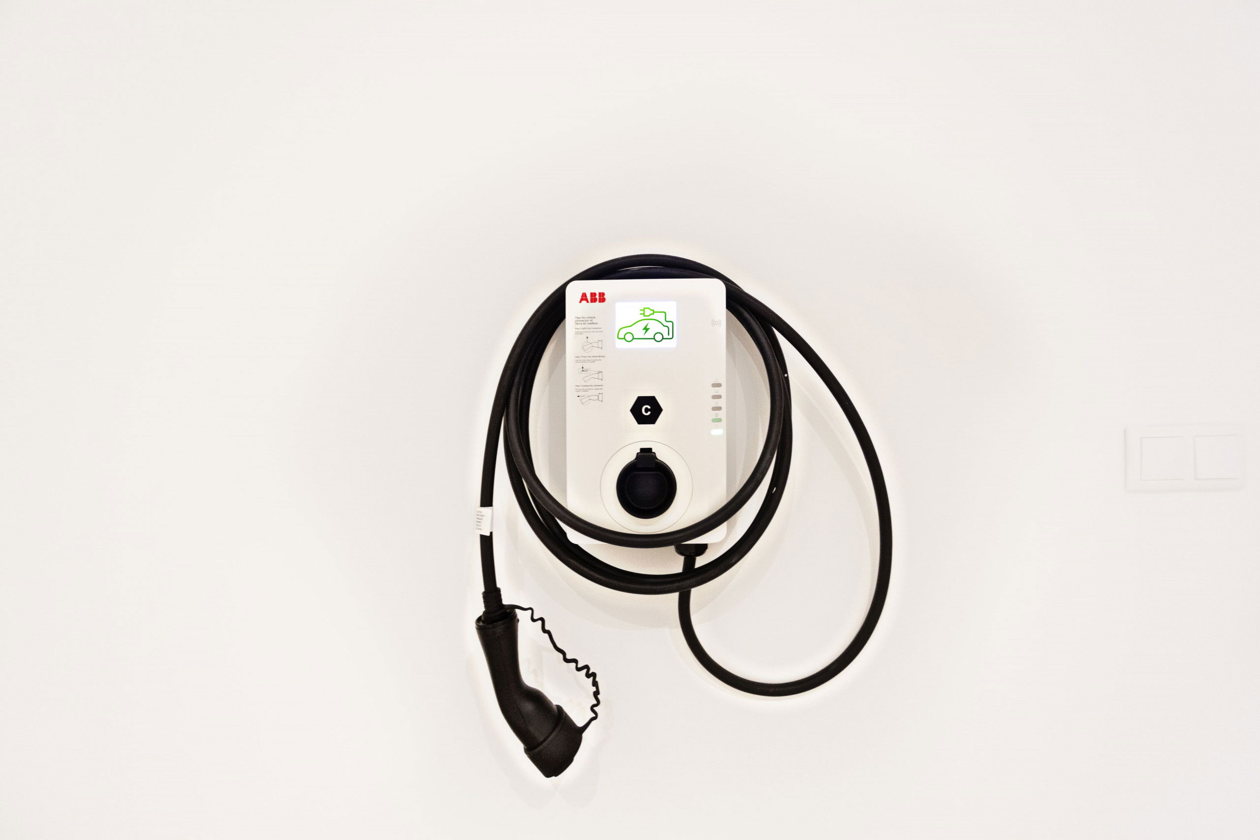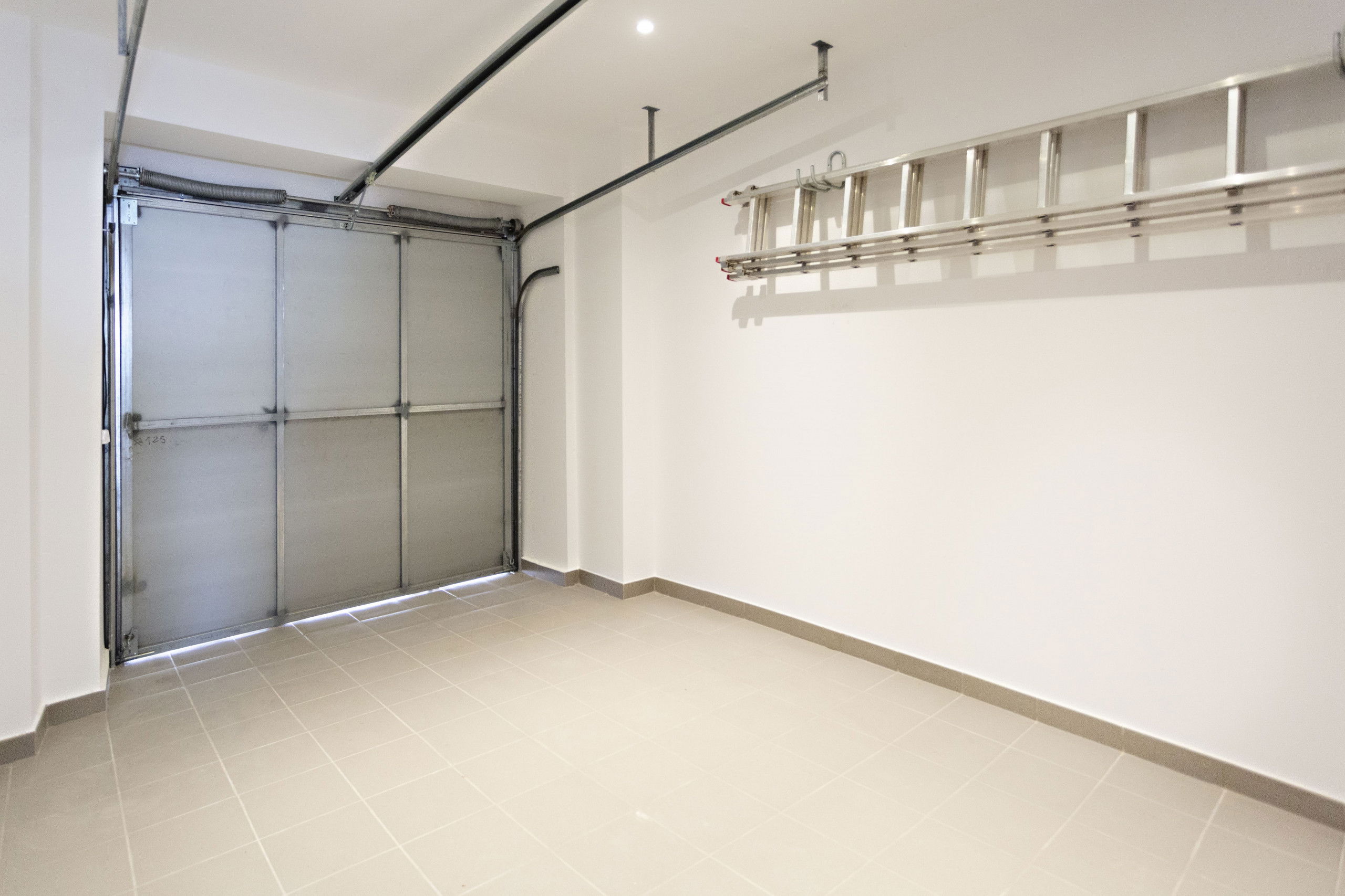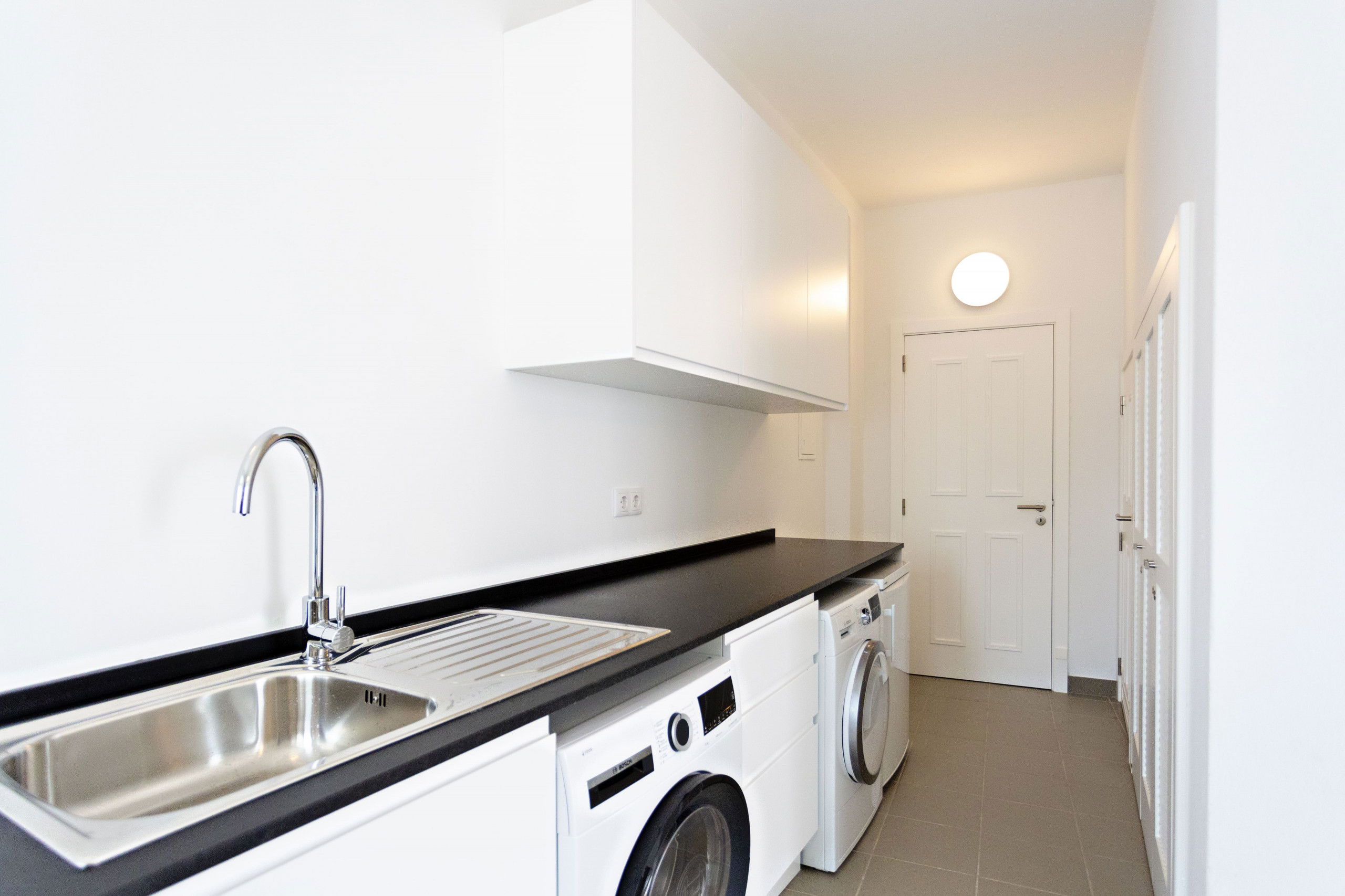 A laundry with a washing machine, tumble dryer and a beverage refrigerator. And a garage (note that the door is 2.15 m wide) which has a Type 2 charging socket for electric cars.