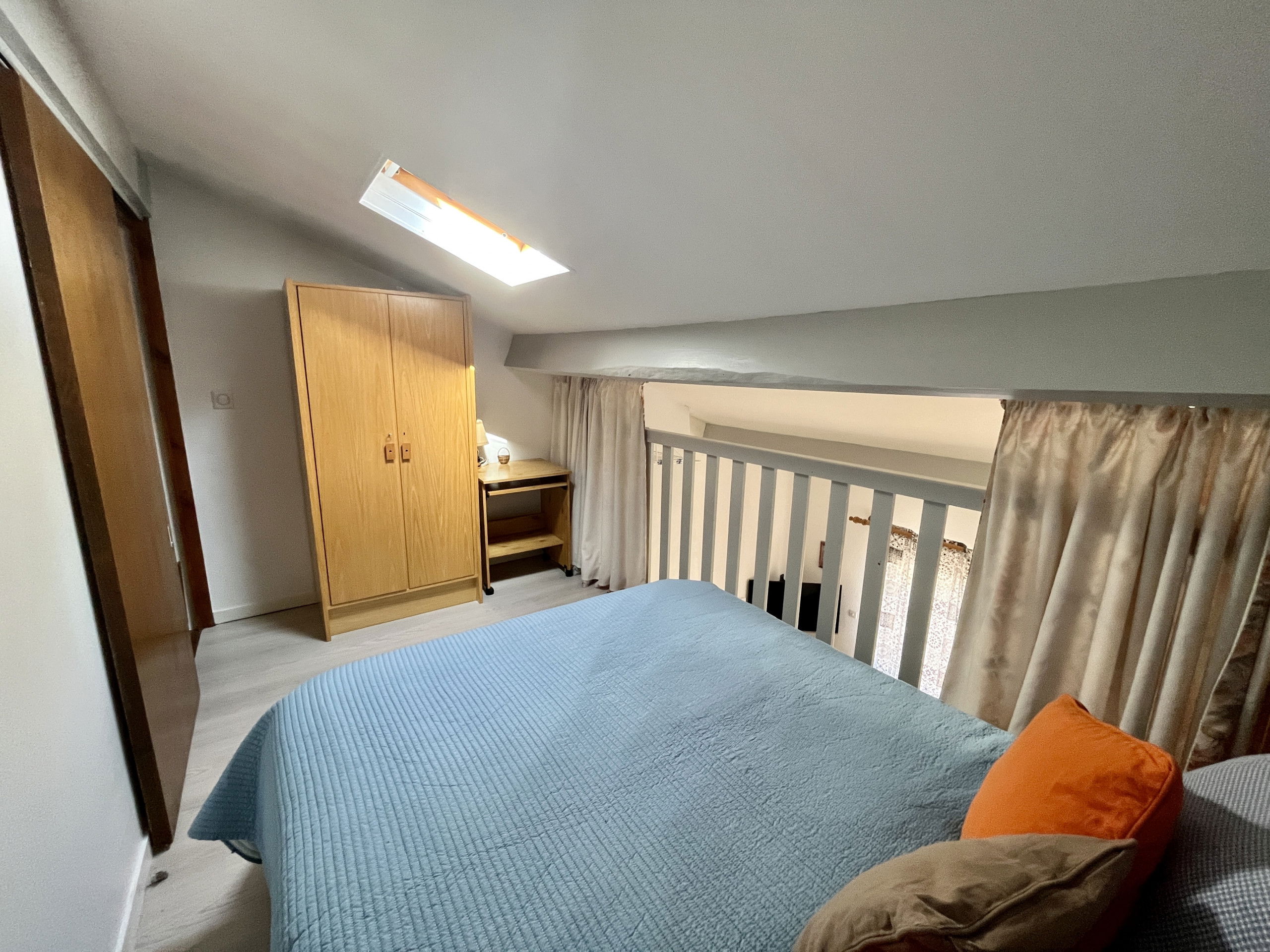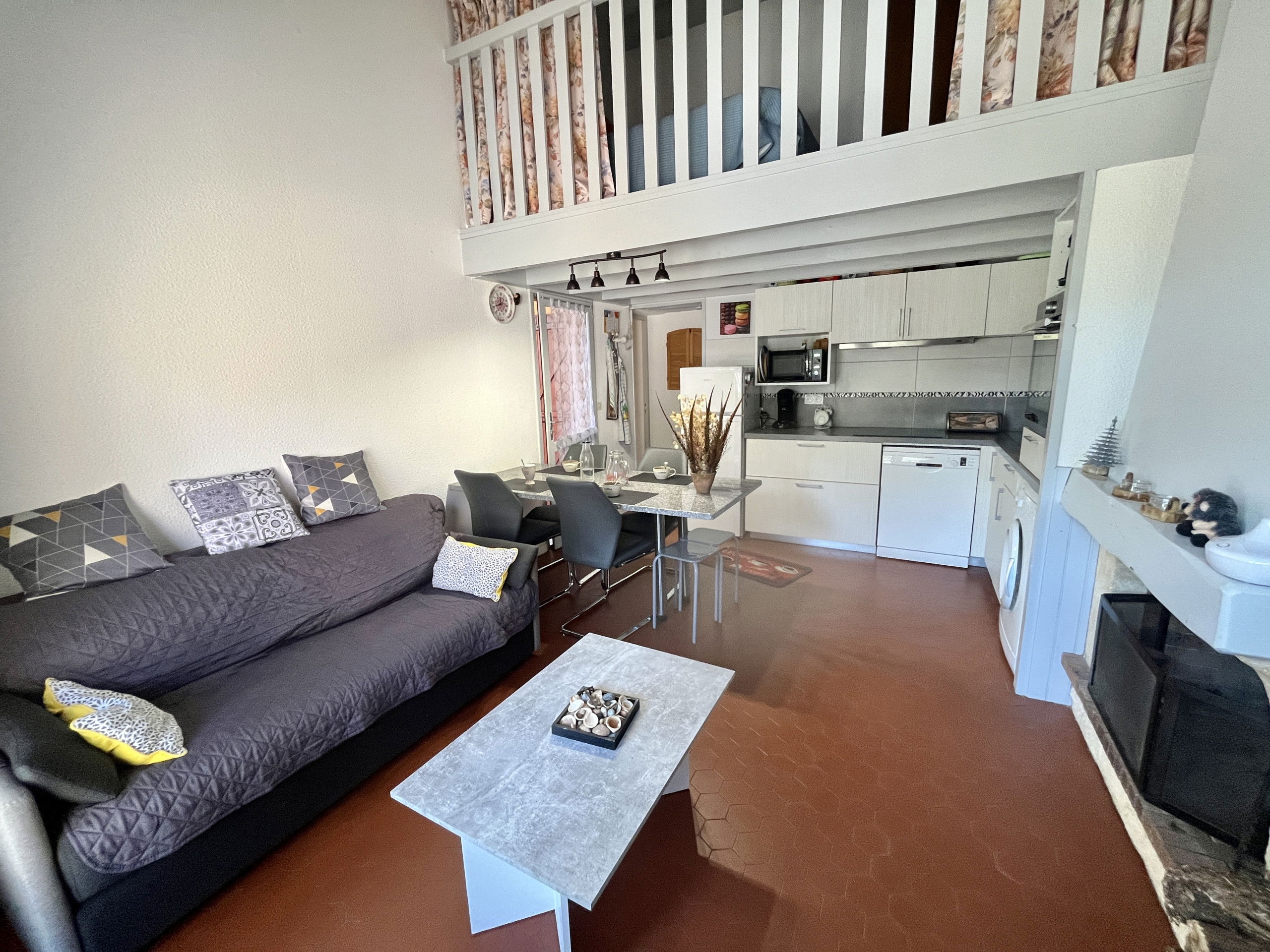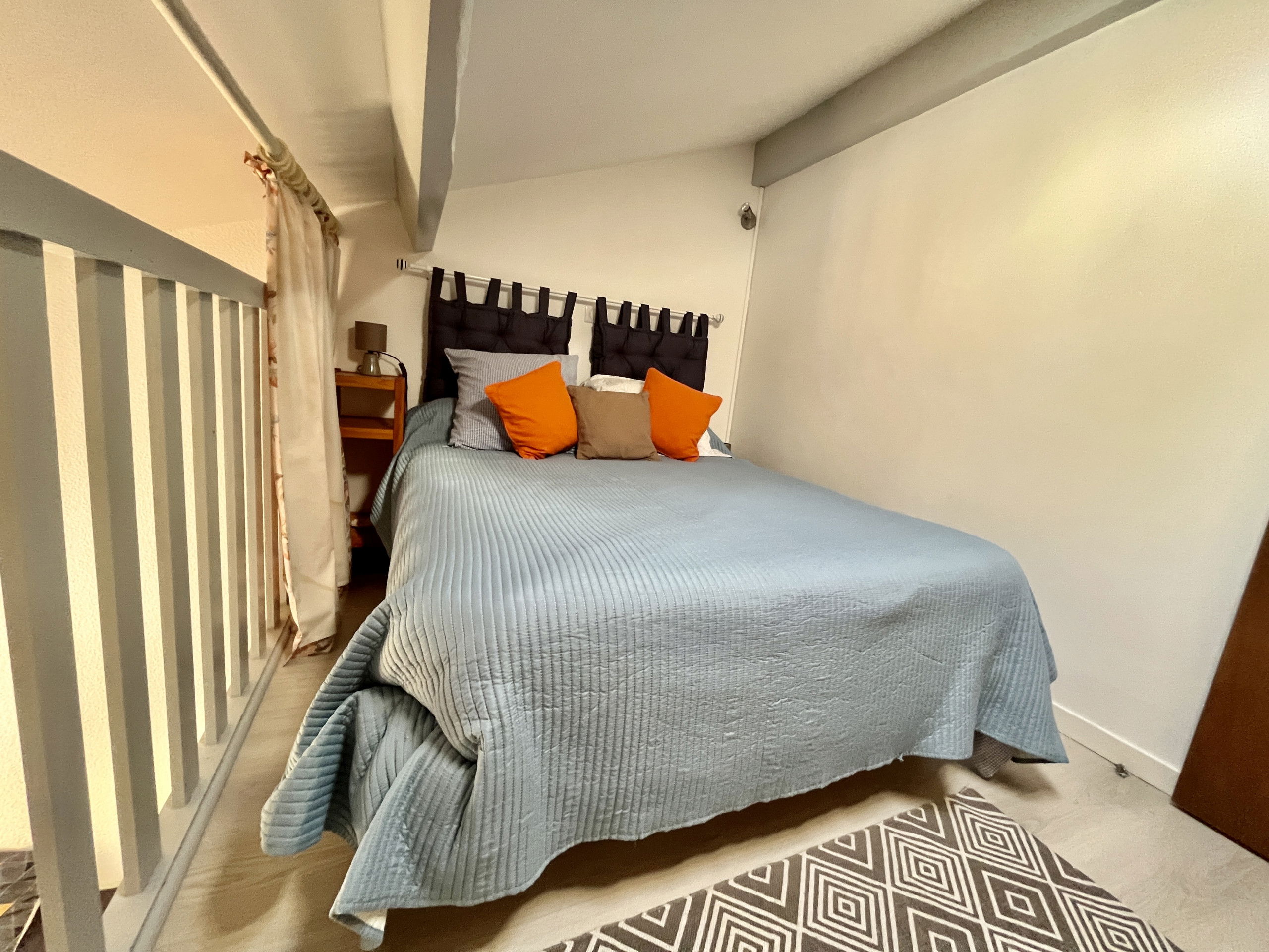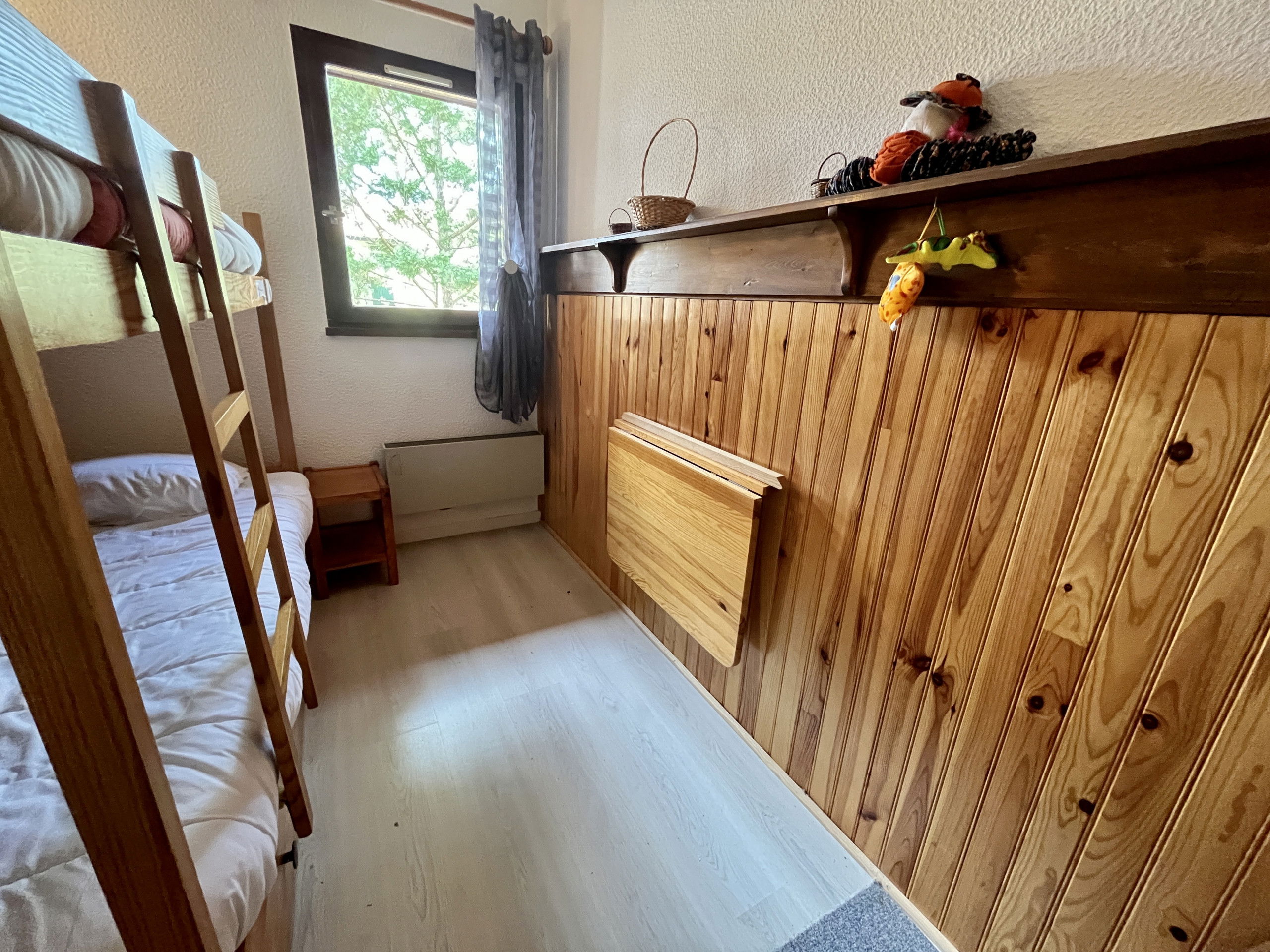The main bedroom, also air-conditioned, has a 160 cm double bed and storage spaces. A sleeping area, accessible by three steps, is fitted with two single bunk beds, ideal for children. An additional bedroom in the mezzanine, open to the living room and accessible by a ladder, offers a double bed and storage spaces; this mezzanine also benefits from air conditioning. The bathroom is equipped with a shower, washbasin, bidet and WC.