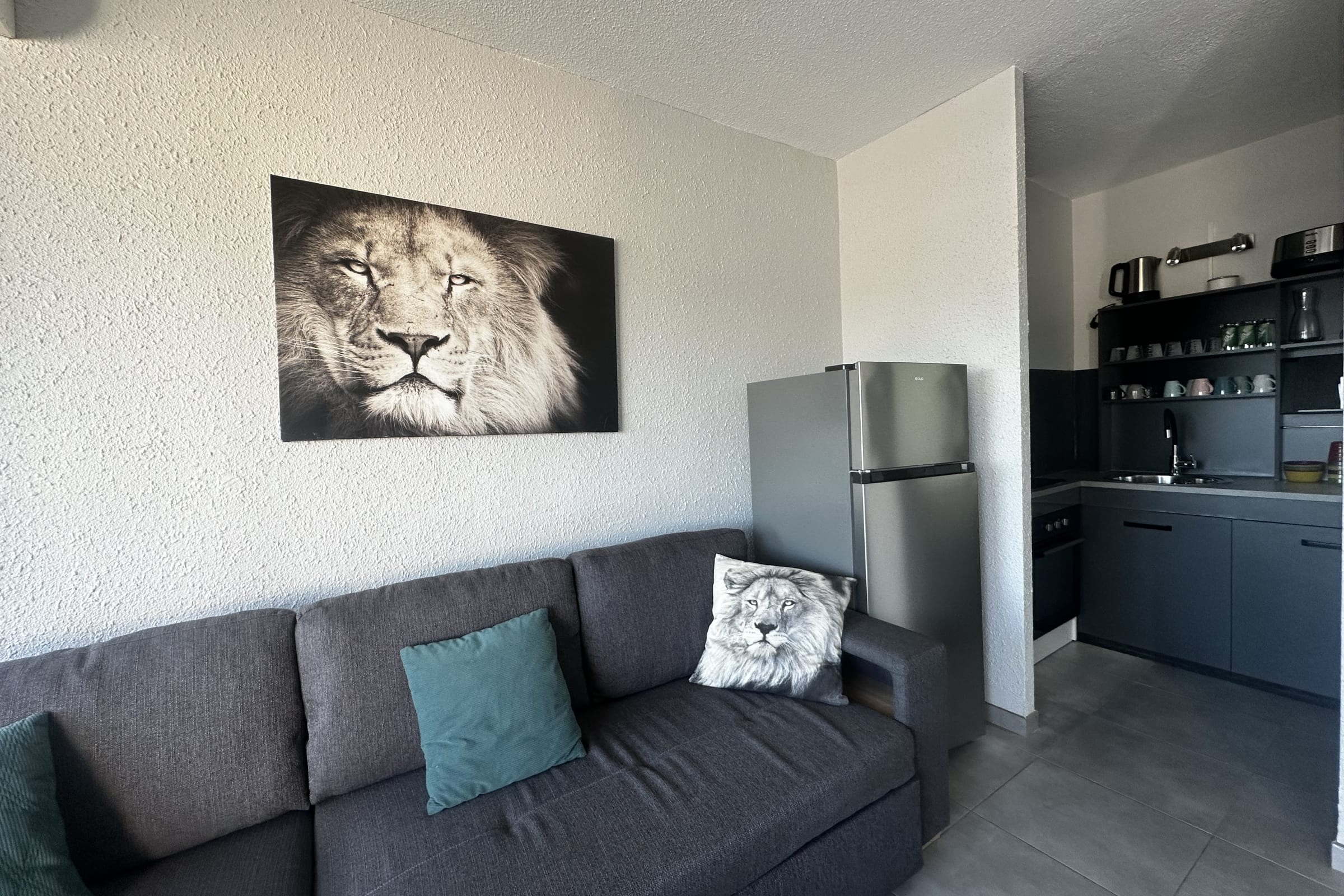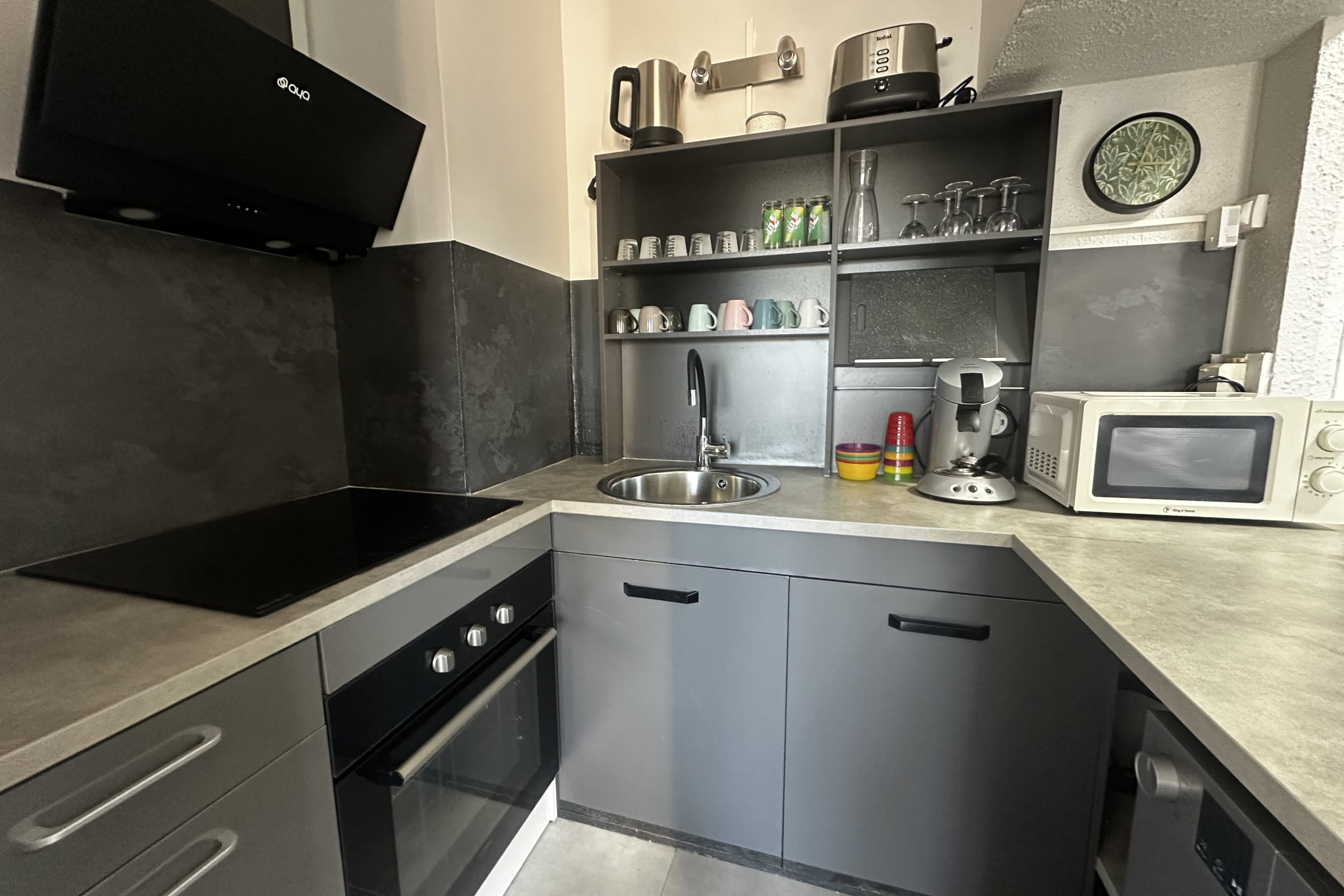 The "La Goélette" apartment features a bright living area with access to the terrace. The fully equipped kitchen provides everything you need for a comfortable stay: coffee machine, toaster, kettle, oven, microwave, refrigerator, and all necessary utensils for preparing your meals. The modern bathroom comes with an Italian-style shower, and the bedroom with quality bedding ensures restful nights.