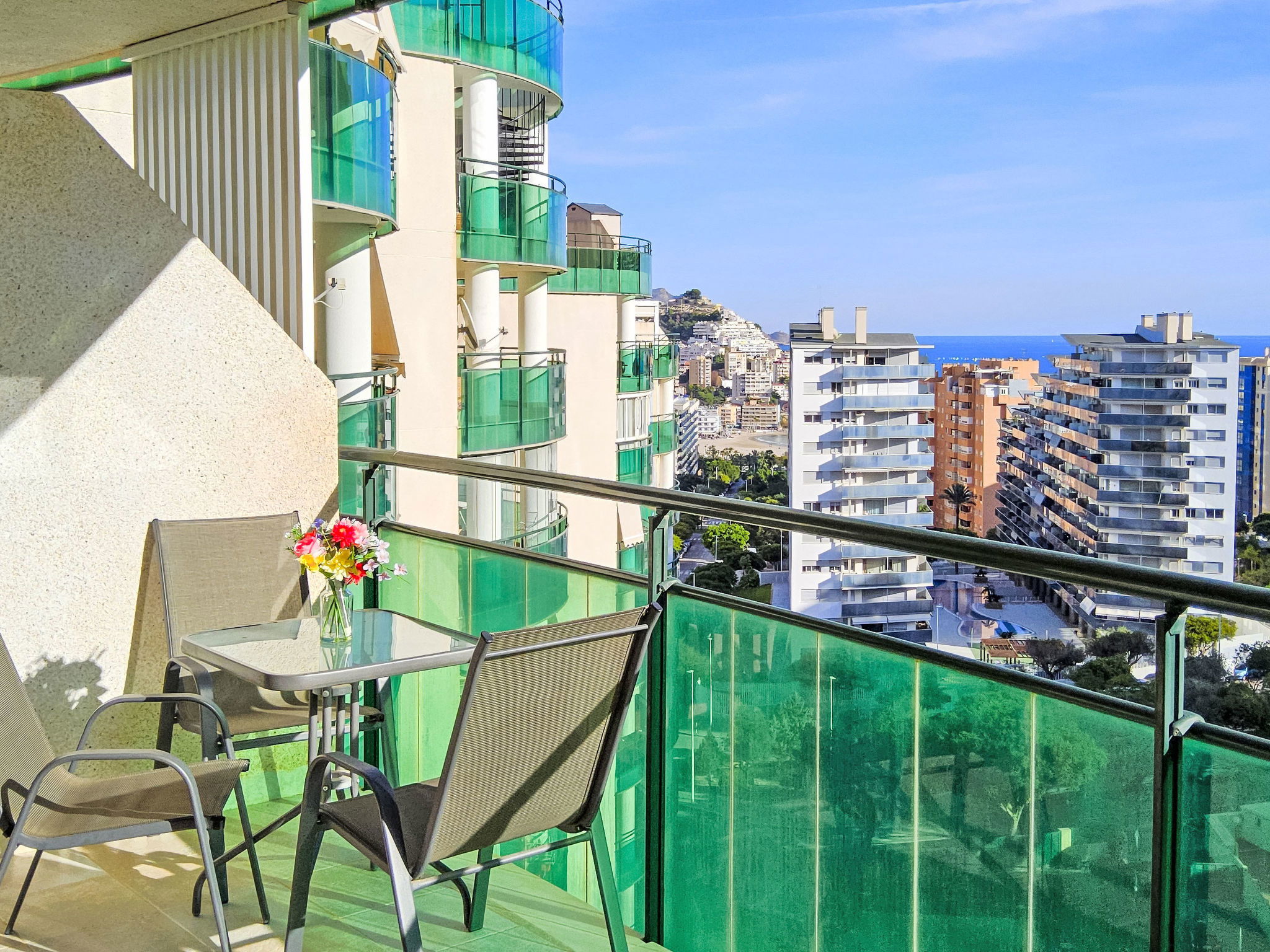 Cala de Villajoyosa: Modern apartment block "Vila Park", 10 storeys. On the outskirts, 4 km from the centre of Benidorm, in a sunny position on a slope, 750 m from the sea, from the beach. For shared use: property (fenced) with lawn and plants, swimming pool (seasonal availability: 01.Apr. - 30.Oct.). Children's pool, outdoor shower. In the house: lift. Roofed, parking space n 92, communal covered parking. Supermarket, restaurant, bar 600 m, bus stop "Benidorm" 700 m. Golf course (18 hole) 6 km, walking paths from the house 100 m. Nearby attractions: Terra Mitia 8 km, Terra Natura 9 km, Aqualandia 13 km, Mundomar 13 m, Alicante 41 m, Aeropuerto Alicante 53 m. Please note: baby equipment on request. The owner does not accept any youth groups. Neighbourhood highly sensitive to noise. Quietness and good behaviour expected.