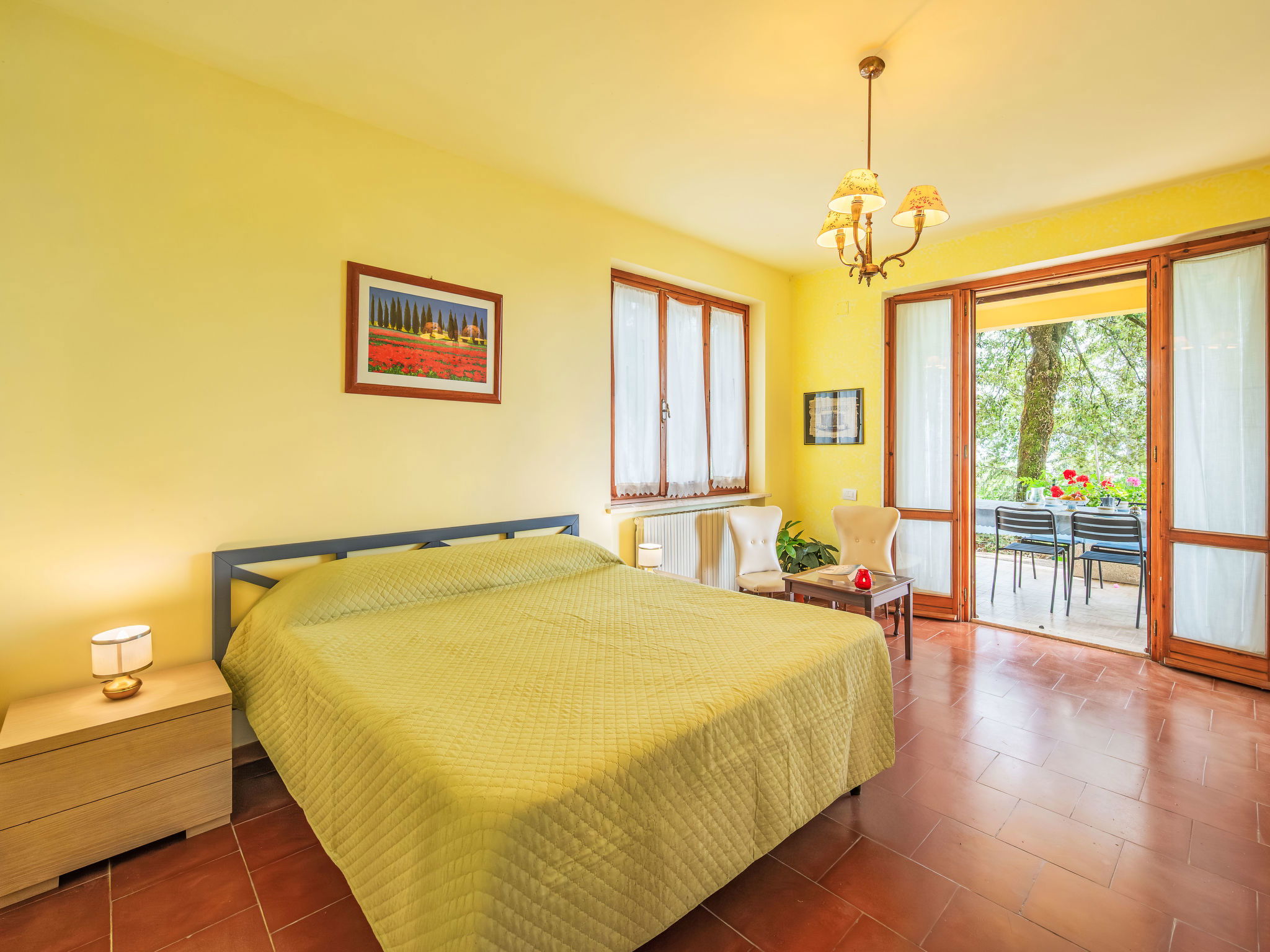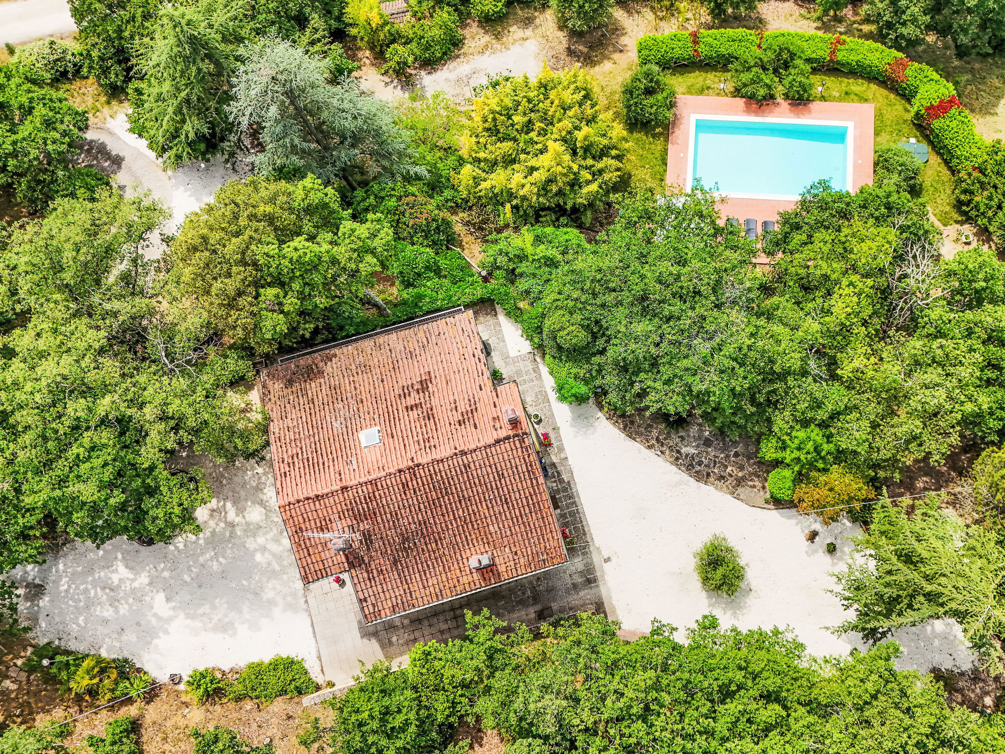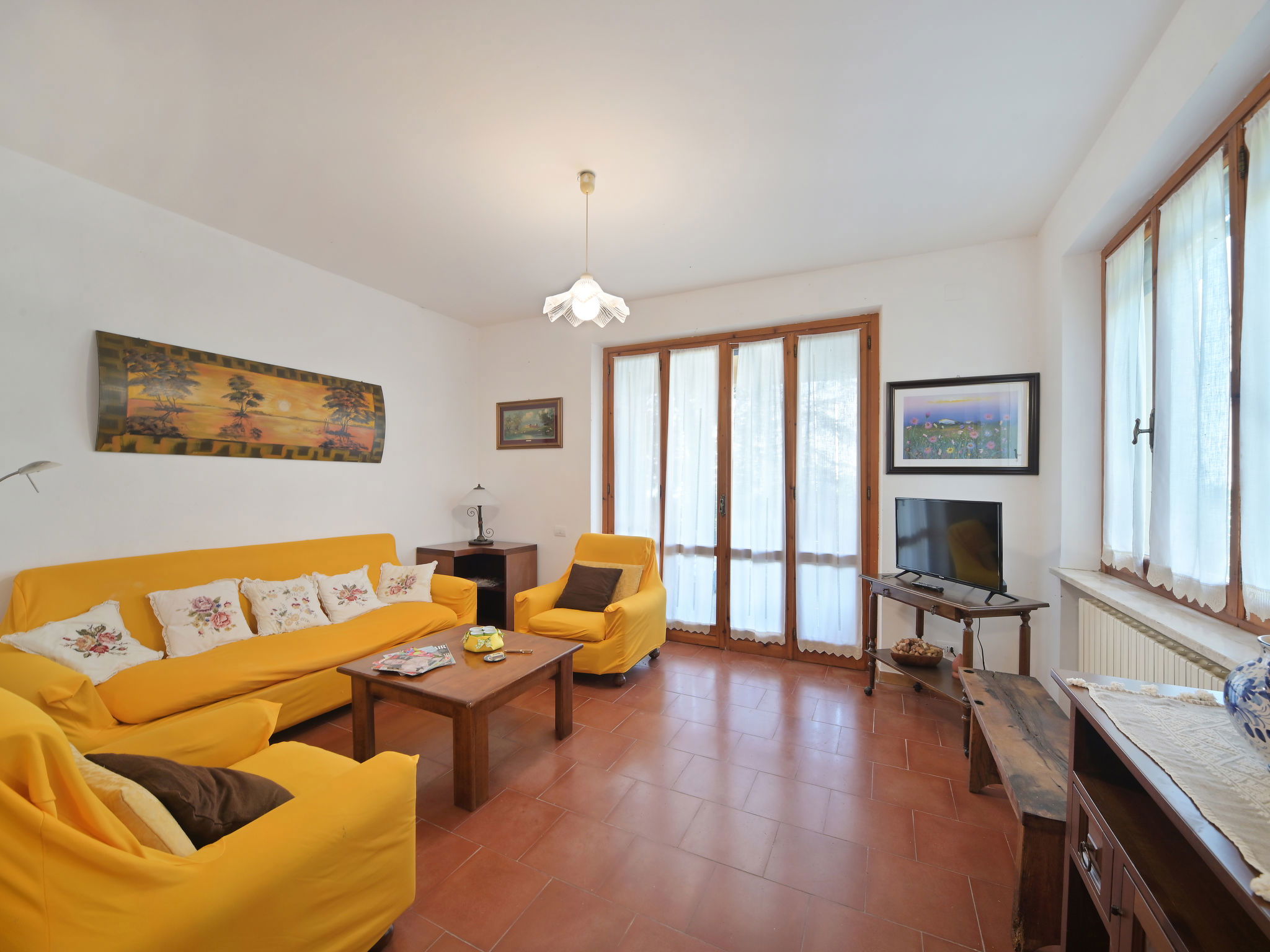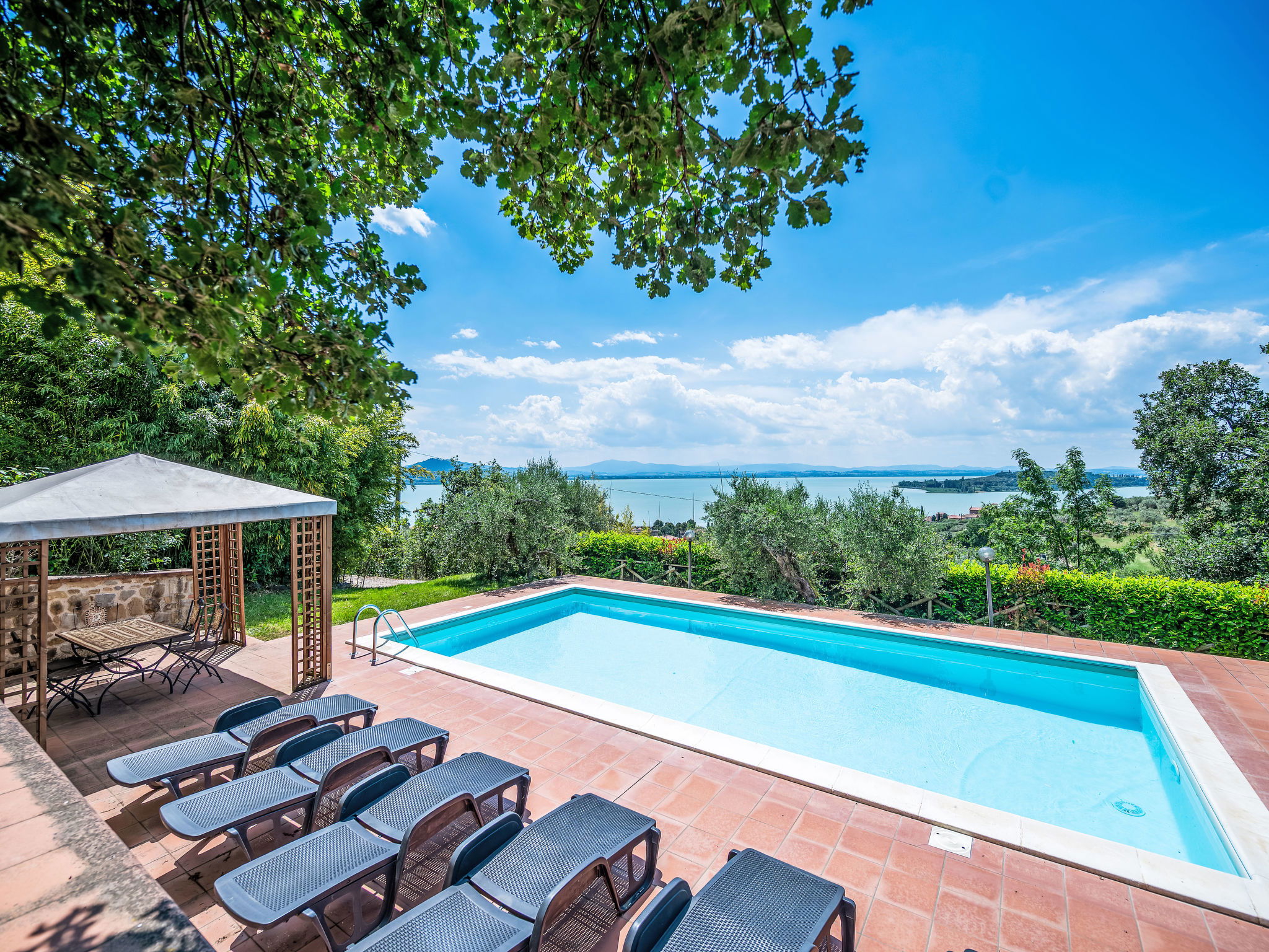 Modern, comfortable country house "Mariani", detached, surrounded by trees and fields. 900 m from the centre of San Feliciano, on top of a hill, 1 km from the lake. Private: property 7'000 m2, garden 1'000 m2 (not fenced), swimming pool (4 x 10 m, depth 140 cm, seasonal availability: 01.Apr. - 31.Oct.). Outdoor shower, patio, barbecue. Bumpy, steep motor access (500 m via unmade road). Parking on the premises. Supermarket, restaurant, bar 900 m, bus stop 150 m, ferry 1 km, grass beach 2 km, bathing lake "Trasimeno" 1 km. Marina 1 km. Nearby attractions: Passignano Sul Trasimeno 14 km, Castiglione Del Lago 22 km, Perugia 24 km, Cortona 33 km, Città Della Pieve 33 km, Assisi 44 km. Please note: car recommended. The owner does not accept any youth groups.