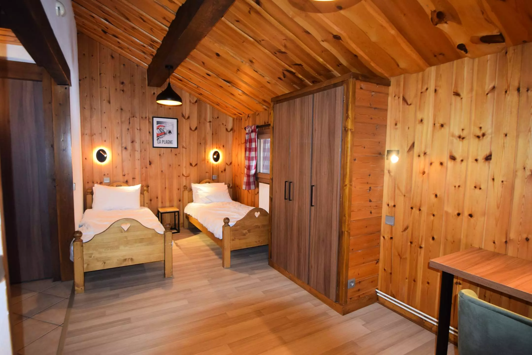 Semi-detached chalet for 12 people, approx. 180 m², 4 levels: living room + 4 bedrooms and 1 mezzanine, located approx. 100m from the slopes, 5 mins walk from the shops, beautiful view of the resort. 2 garages and 3 outdoor spaces in front of the garages - Level 1 (entrance): large ski room with boot dryer - SAUNA - Washing machine - Shower and 1 separate WC - Level 2: LIVING ROOM with large South/West terrace: lounge area, dining area, TV - Kitchen: gas cooker with 4 hotplates and traditional oven, fridge with freezer section, microwave, dishwasher, NESPRESSO - 1 WC - Level 3: BEDROOM 1: 1 double bed (140cm), 1 single bed, bathroom: bathtub separate WC - BEDROOM 2 with balcony/terrace: 3 single beds (80cm), bathroom shower separate WC - Level 4: BEDROOM 3 with balcony: 2 single beds (80cm) Bathroom: shower, WC included: access to a mezzanine (-1.80m) by stairs: 2 single beds (80cm), sink + WC - BEDROOM 4: 1 double bed (140cm), 1 single bed, bathroom: bathtub separate WC - Level 5: BEDROOM 5: 1 double bed (140cm), 1 single bed, bathroom: bathtub separate WC - Level 6: BEDROOM 6: 1 double bed (140cm), 1 single bed, bathroom: bathtub separate WC - Level 7: BEDROOM 7: 1 double bed (140cm), 1 single bed, bathroom: bathtub separate WC - Level 8: BEDROOM 8: 1 double bed (140cm), 1 single bed, bathroom: bathtub separate WC - Level 9: BEDROOM 9: 1 double bed (140cm), 1 single bed, bathroom: bathtub separate WC - Level 10: BEDROOM 10: 1 double bed (140cm), 1 single bed, bathroom: bathtub separate WC - Level 11: BEDROOM 11: 1 double bed (140cm), 1 single bed, bathroom: bathtub separate WC - Level 12: BEDROOM 12: 1 double bed (140cm), 1 single bed, bathroom: bathtub separate WC - Level 2p (140cm), bathroom: bathtub, separate WC - Bedding: duvets - Floor: tiles and parquet in the bedrooms - WIFI - End of stay cleaning, sheets, towels and ski passes optional. 1 baby bed available in the chalet - Non-smoking chalet - Not accessible to people with reduced mobility - Chalet located in Plagne 1800, approximately 100m from the slopes, chairlift to access Plagne Centre or Aime 2000. Free shuttle stop 20m away.