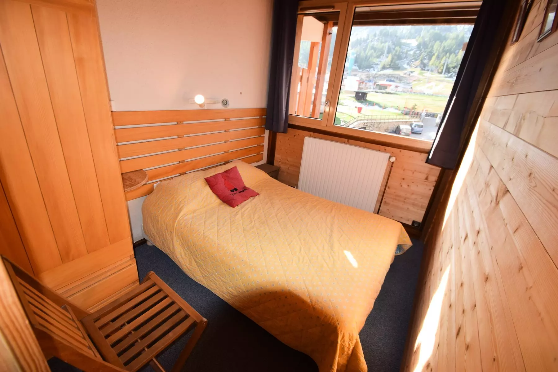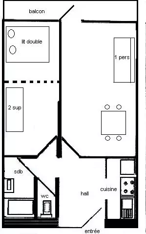 2-room apartment, 5/6 people, 39m2, facing SOUTH with balcony, view of the slopes, on the 2nd floor with elevator - Kitchen: 4 ceramic hobs, refrigerator, stove with oven, microwave, dishwasher, electric coffee maker - Living room: 1 double sofa bed (140cm), TV - Bedroom (access to the bedroom via the sleeping area): 1 double bed - Sleeping area: 2 bunk beds - Bathroom: shower, separate WC - Bedding: 2 single duvets and 2 double duvets - Very pleasant apartment, facing due South and in the heart of the resort center.