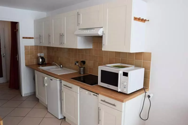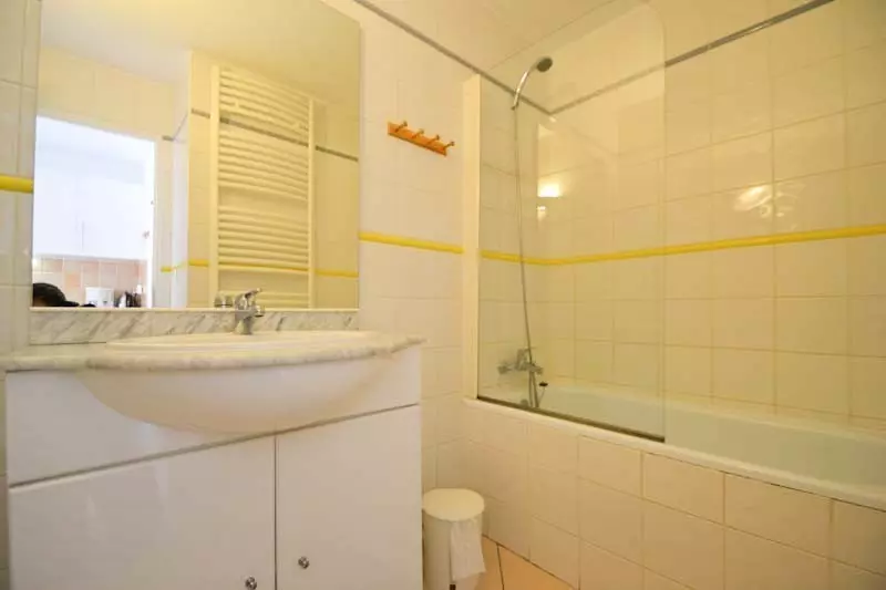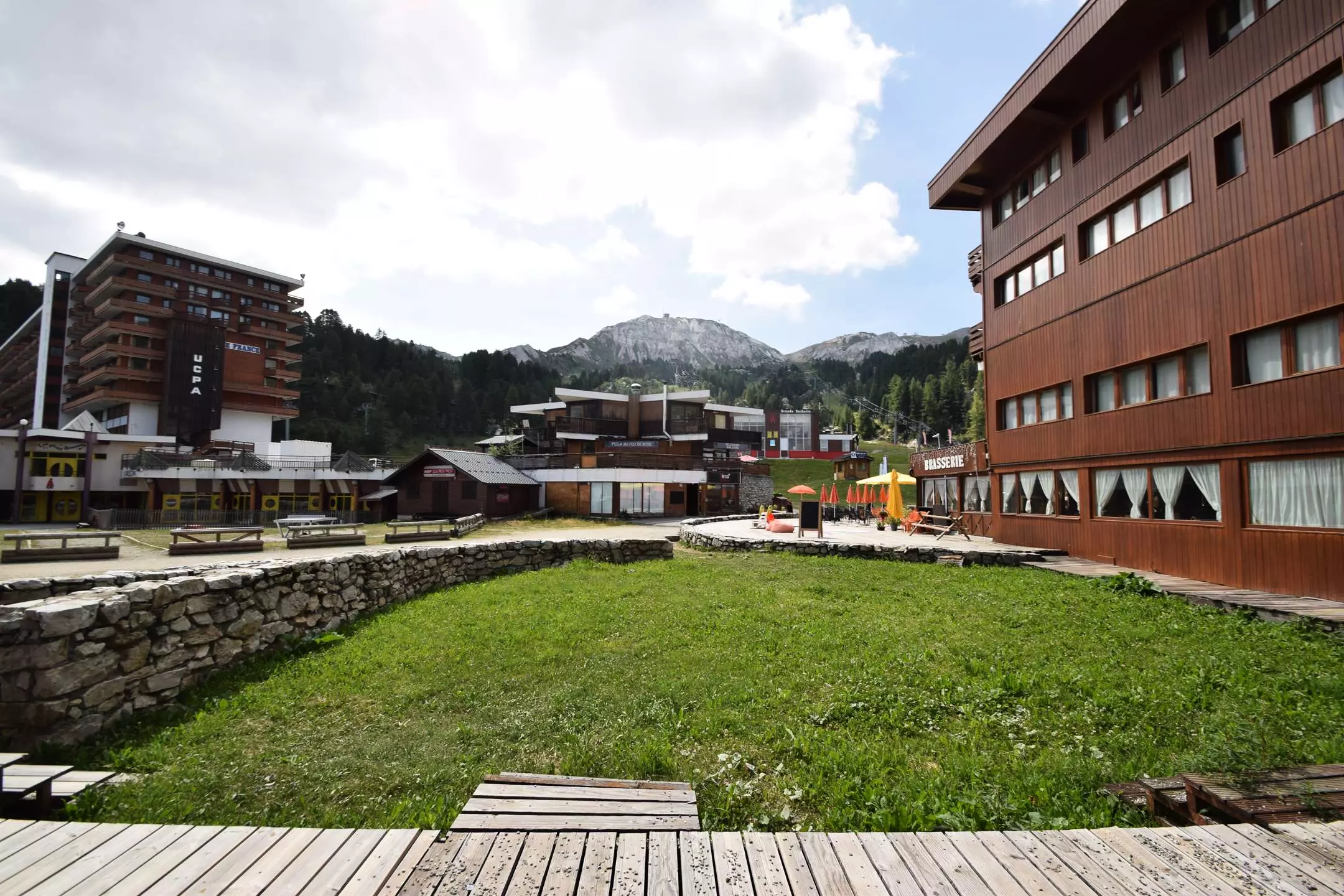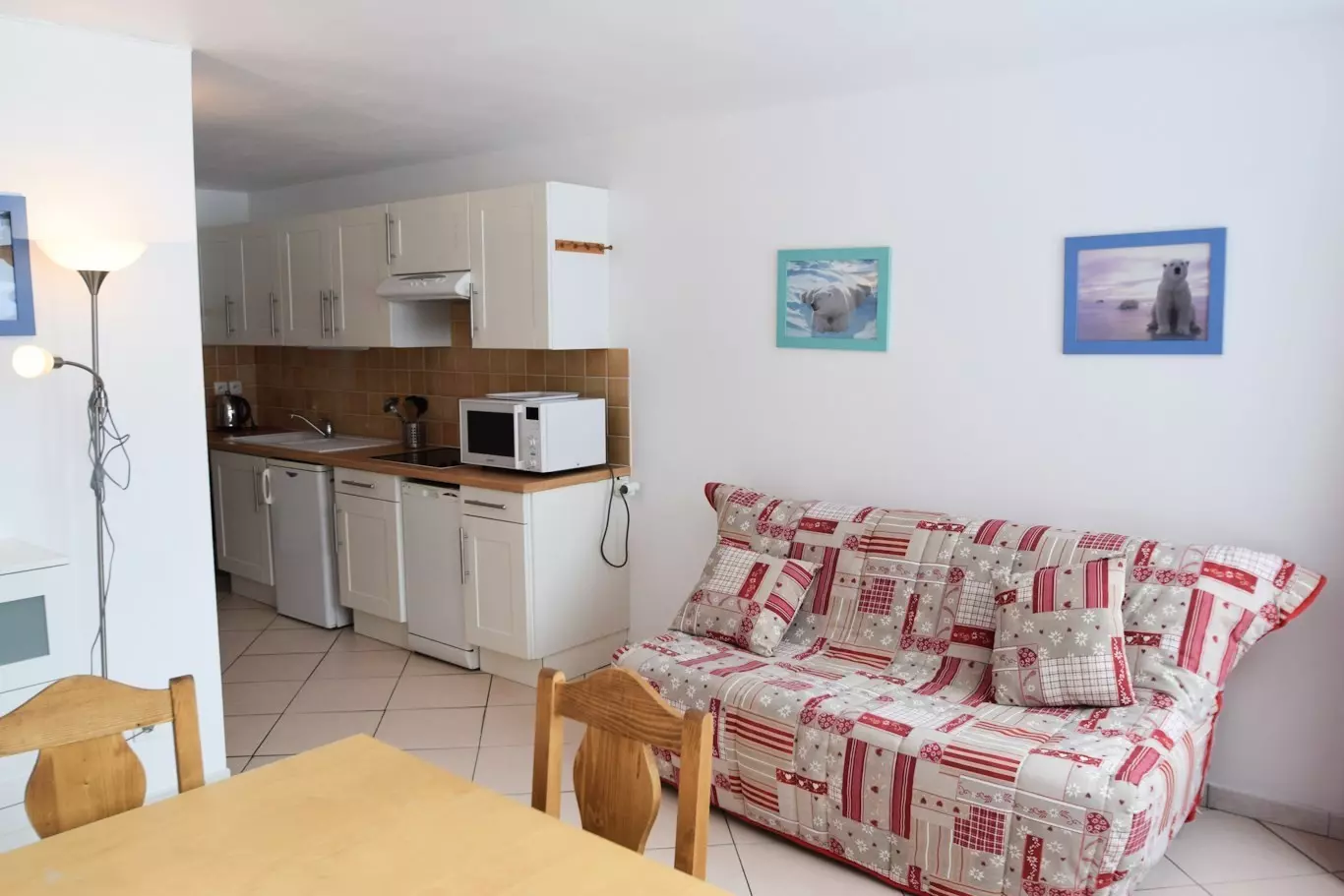 Living room + Cabin, 4/5 people, 30m2, facing south with terrace (snow removal not guaranteed), direct access to the slope and resort - Ground floor on the slope side, and 1st floor by stairs from the shopping mall and parking. Kitchen: in the entrance/living room: 3 ceramic hobs, fridge, microwave, extractor hood, electric coffee maker, dishwasher - Living room: 1 double sofa bed 160cm, dining area, TV - Closed cabin: 2 bunk beds (90cm) + 1 drawer bed (80cm) - Bathroom: Bathtub - Separate WC - Bedding: blankets and 1 double duvet - Floors: tiled - Ski locker no. 7 on the ground floor, exit to the slopes - Apartment very well located in the heart of the resort and opposite the nursery, direct access by terrace - The residence: in the center of the resort, connected to the shopping mall -