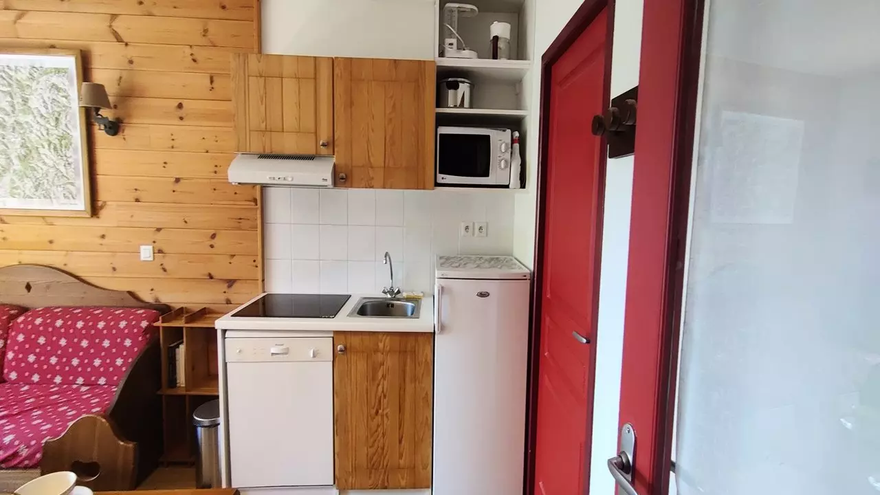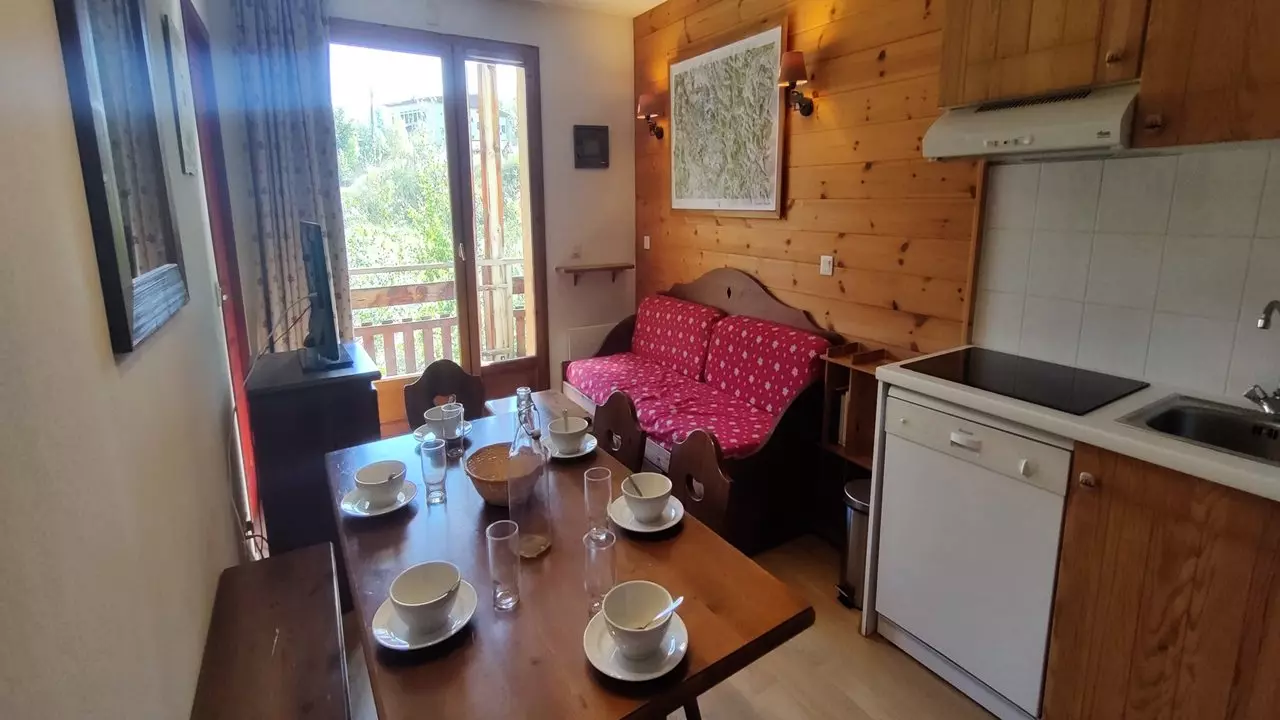 - A fitted kitchen open to the living room with two beds (sofa bed: 2 single beds 90 x 190), opening onto a large balcony, view of the mountains.