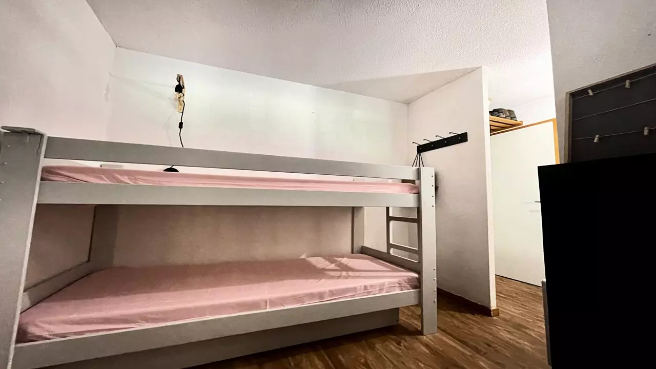 - Beds: one bedroom with double bed (140x190) and one cabin bedroom with two single bunk beds (80x190) and storage shelves. Beds equipped with duvets