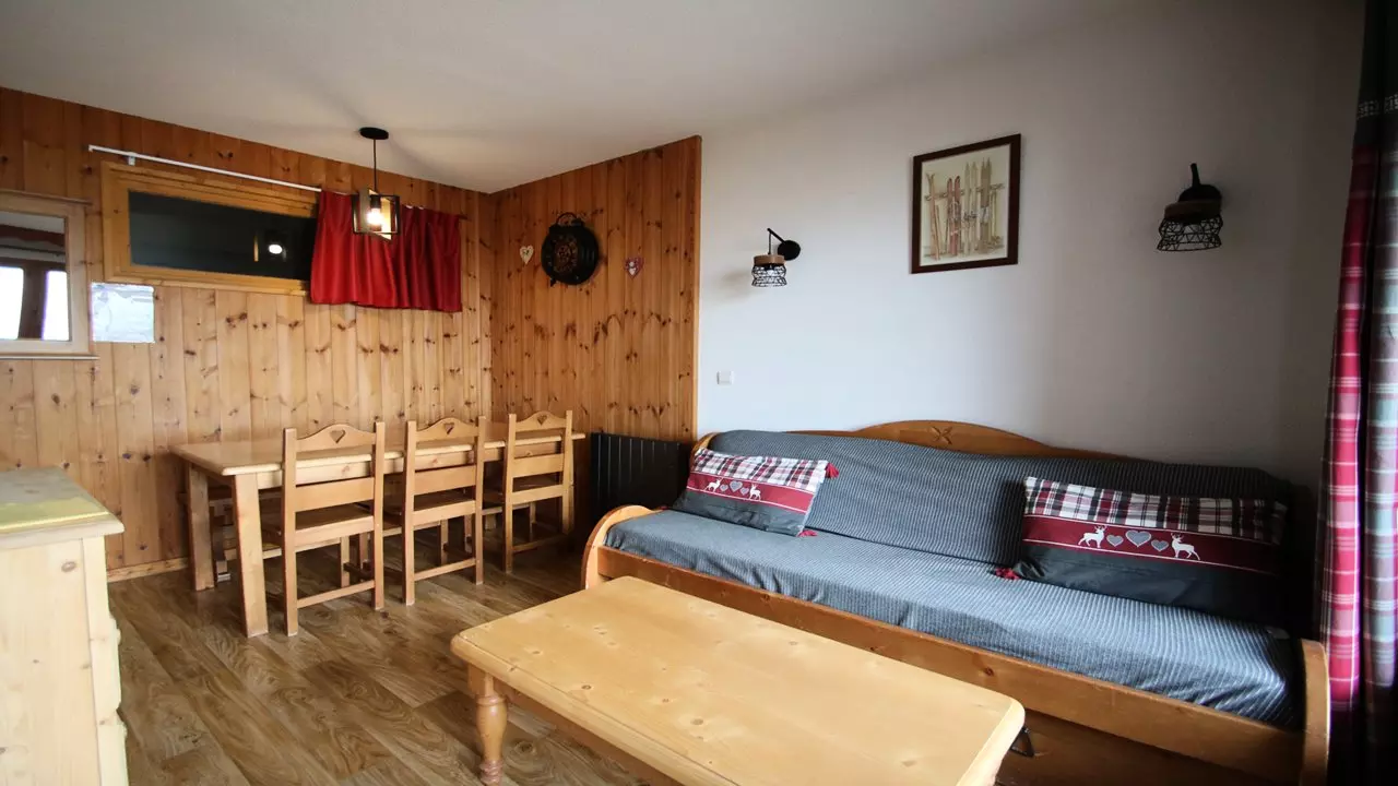 - Living room with sofa bed, dining table, flat screen TV and balcony equipped with a table and two chairs